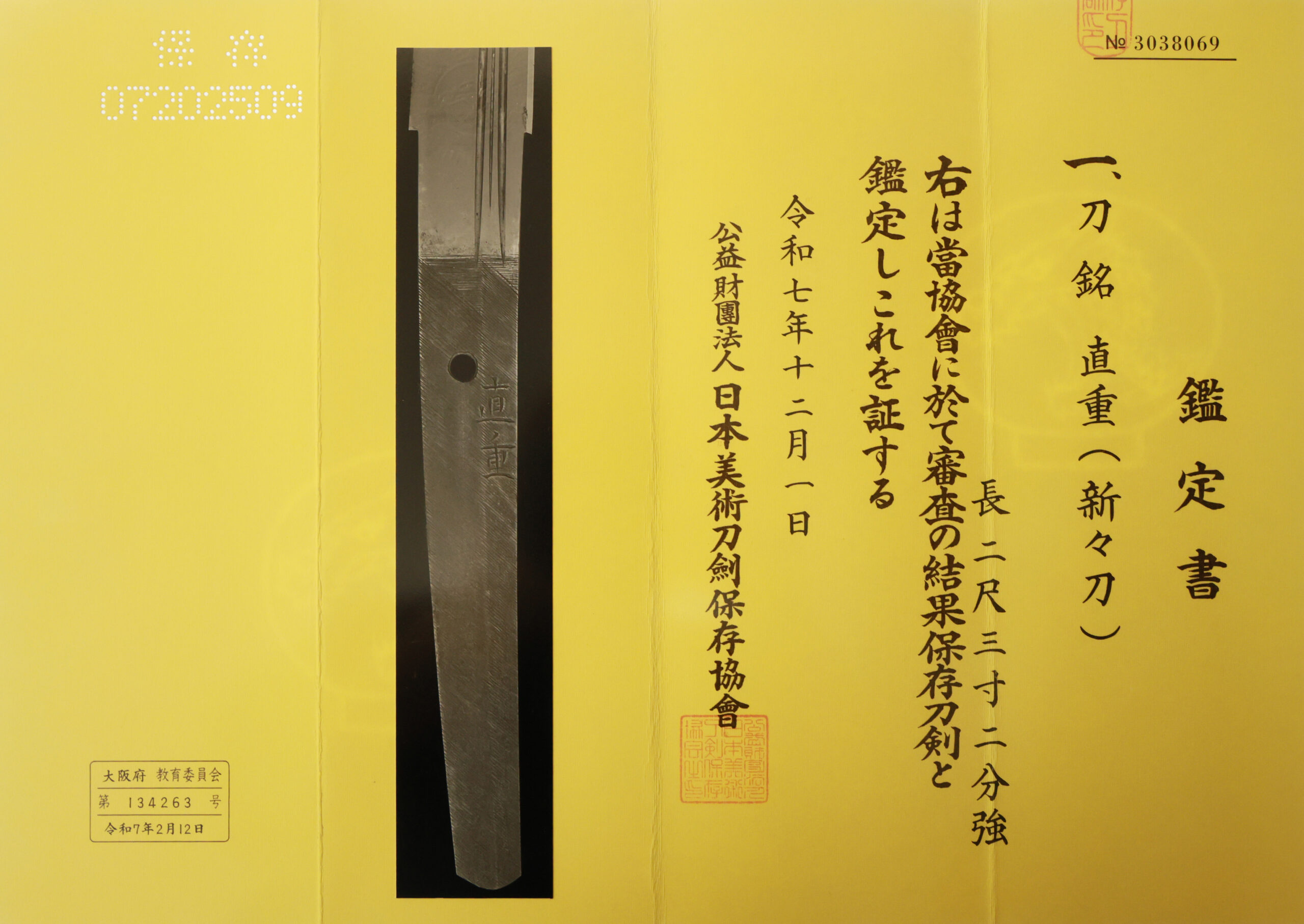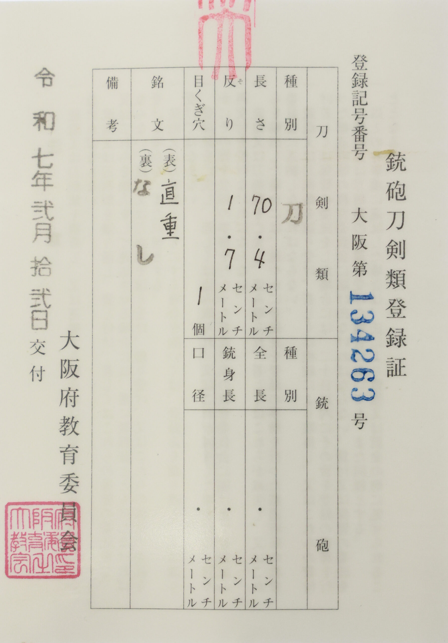 The Board of Education in Osaka issued a registration paper for this sword. It is called Jyu Hou Token Rui Tourokusho (銃砲刀剣類登録証). Bunkacho (The Agency for Cultural Affairs) acknowledges a Japanese sword with this paper as a work of art.