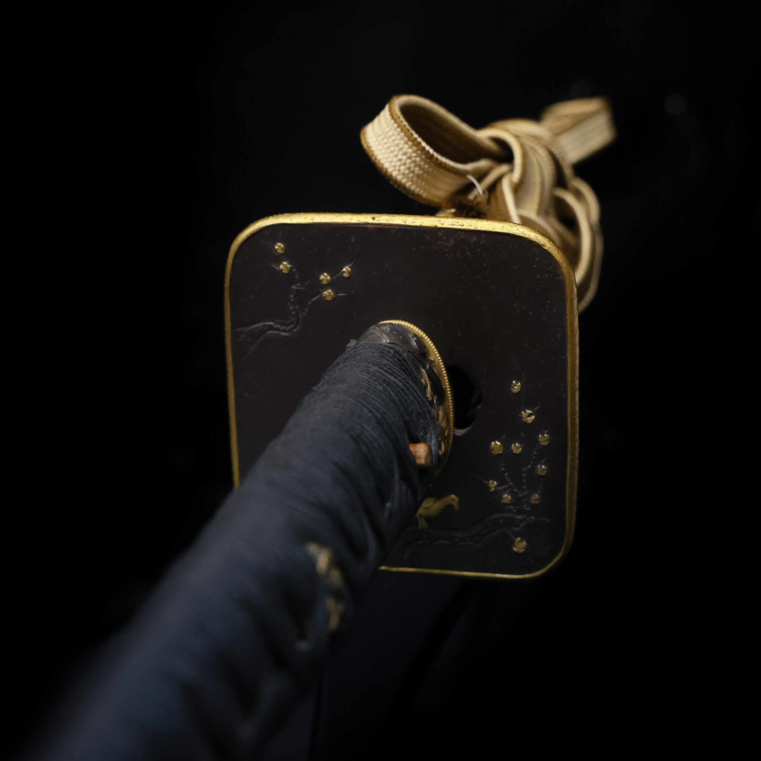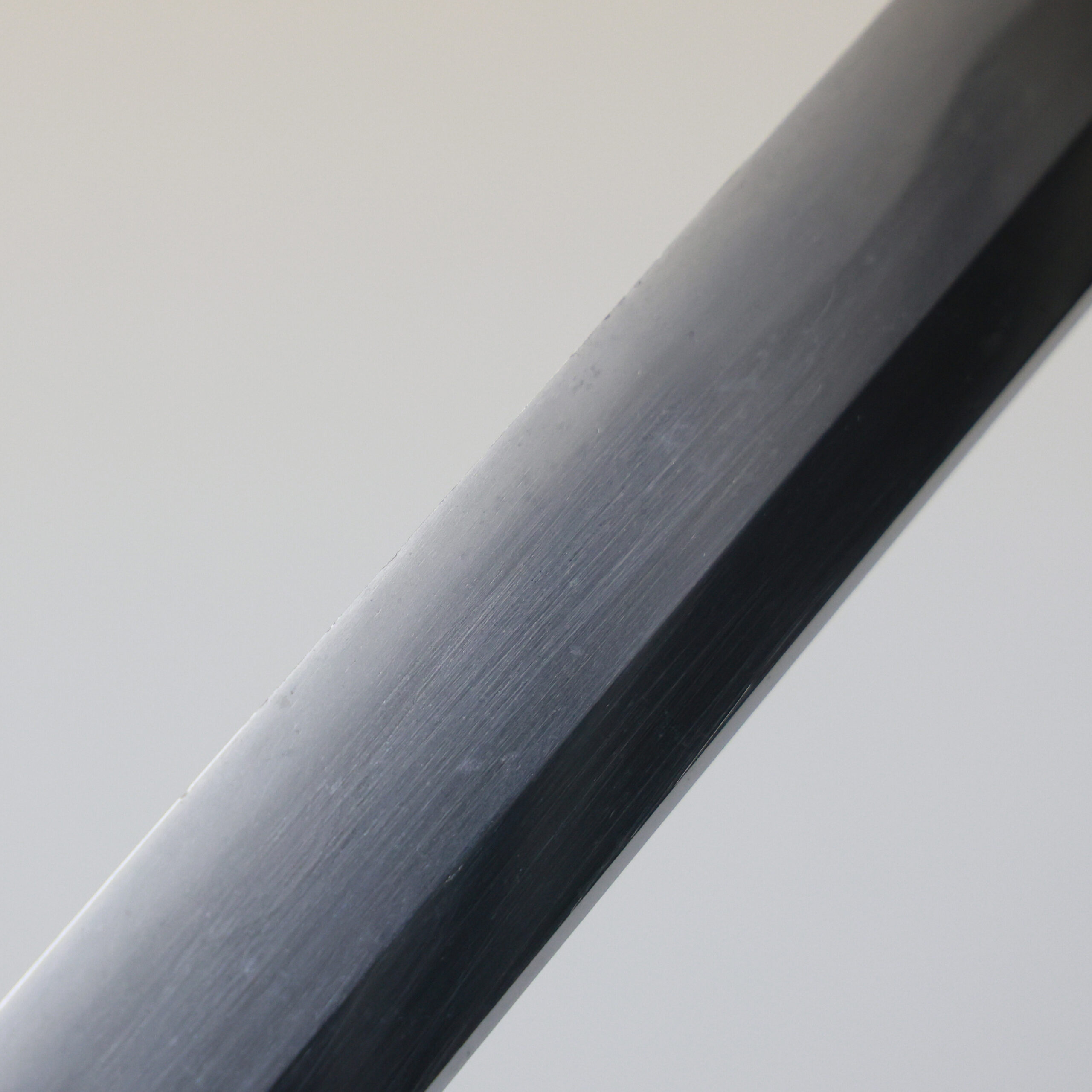 This Saya is covered with black lacquer. Due to its high waterproof effect, lacquer has been used since ancient times in Asia. The blade of a Japanese sword is made of iron, and moisture is the greatest enemy of iron. For the purpose of carrying the blade without degrading it, people devised a method of coating the scabbard with lacquer. To prevent not only moisture but also rain and snow from penetrating the inside of the scabbard, it was necessary to apply multiple layers of lacquer. The Nushi (塗師, lacquerers) was born precisely because advanced techniques were required to handle the complicated processes.