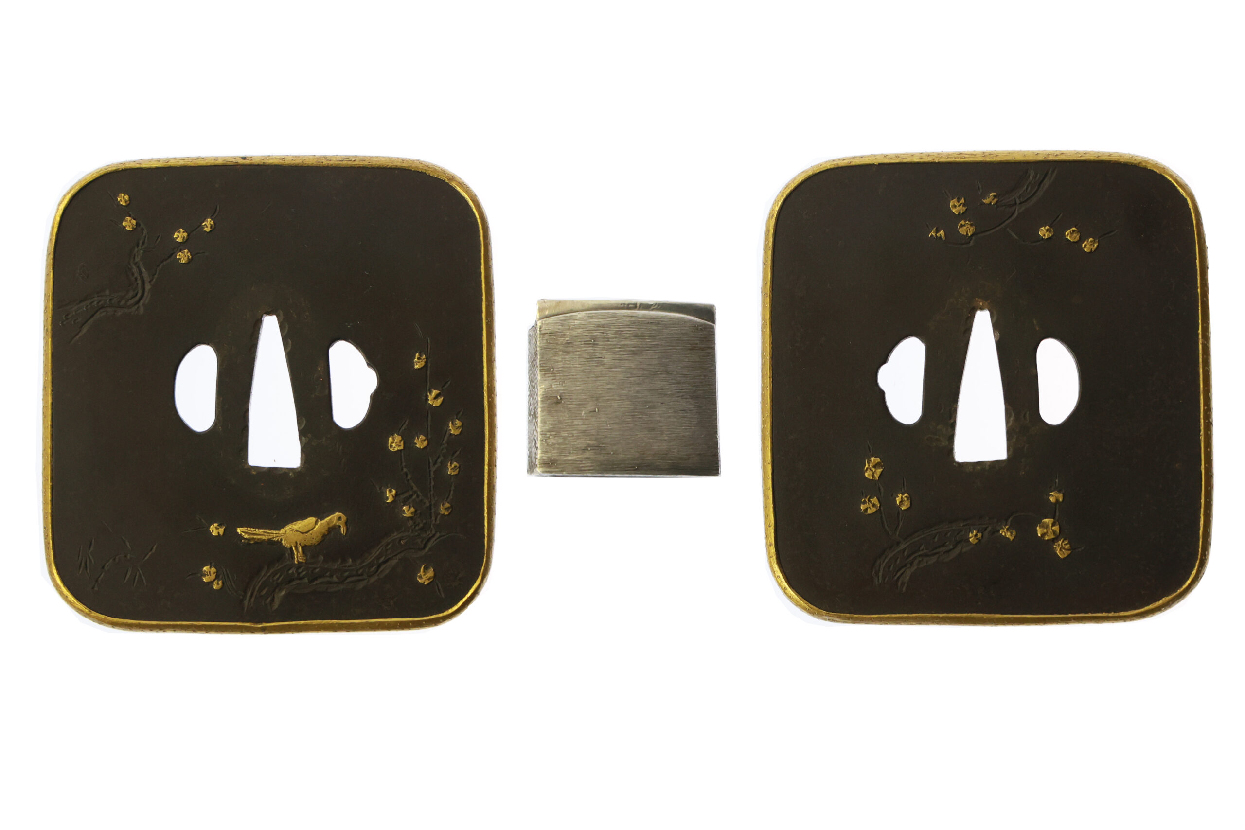 This square tsuba features a depiction of a small bird alongside plum blossoms. While the exact species is difficult to determine, in Japan, the bird most commonly associated with plum blossoms (梅, ume) is the Japanese bush warbler (鶯, uguisu).