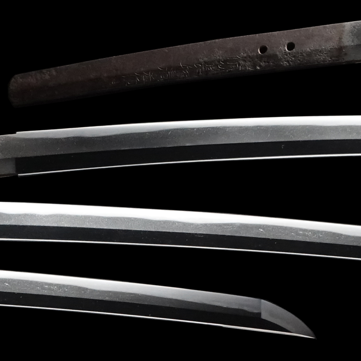 Japanese swordsmiths left the black rust on the tang on purpose to prevent red rust while the tang is in its handle. And the discoloration of the tang was created over time, which is a great indicator for a Japanese sword specialist to estimate when the sword was forged.