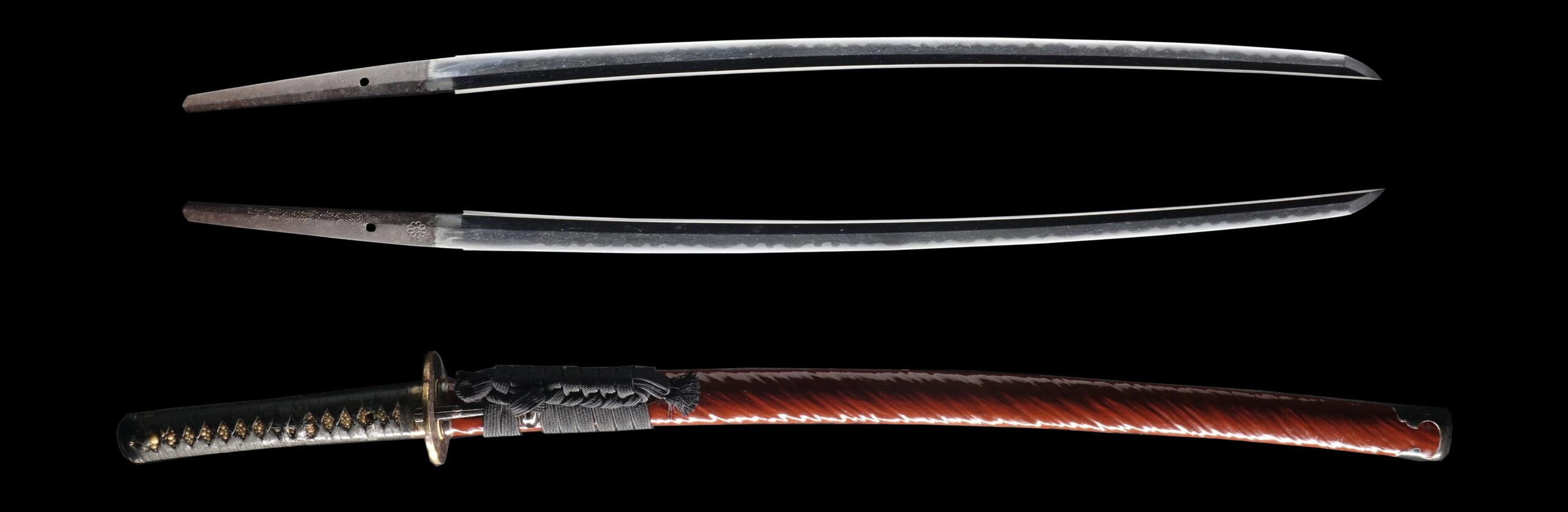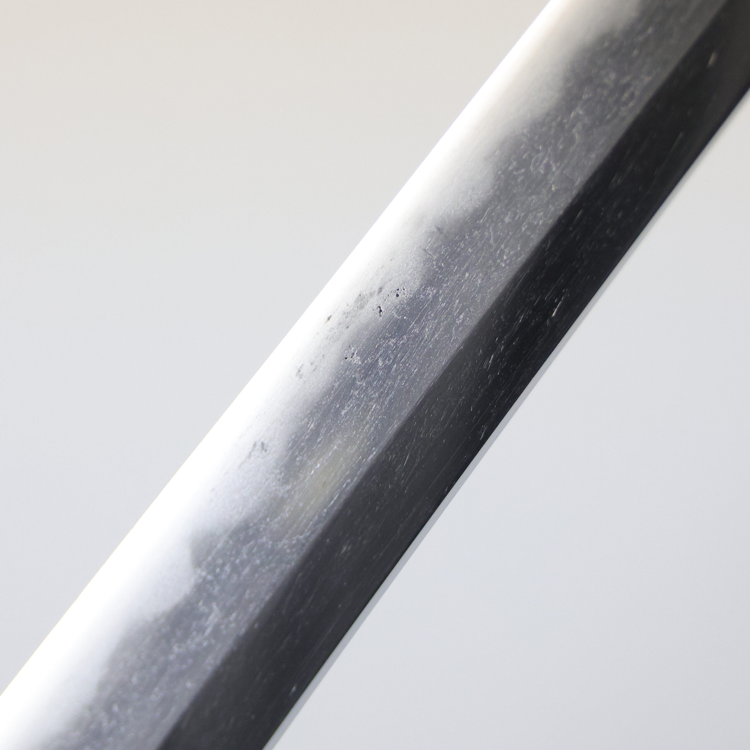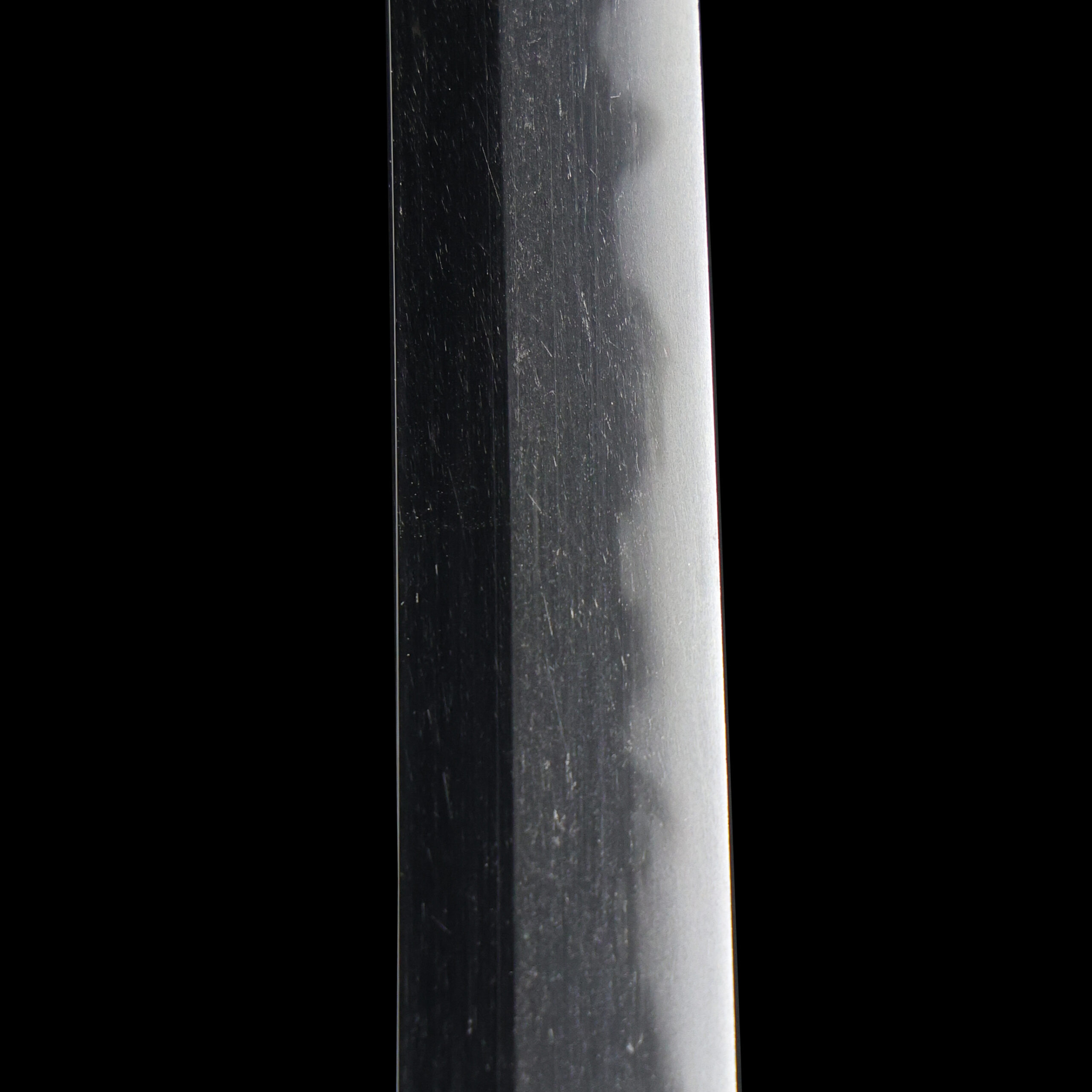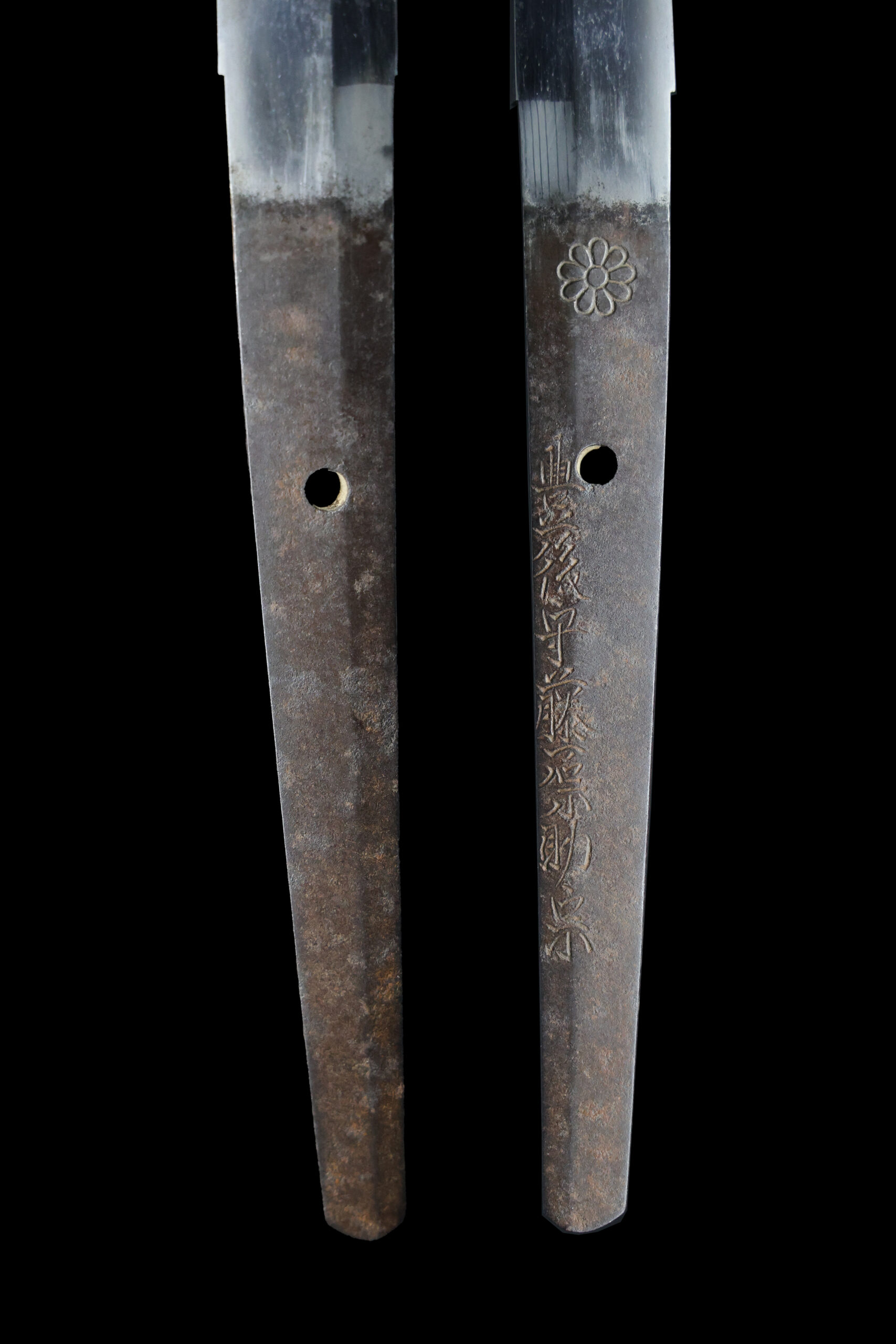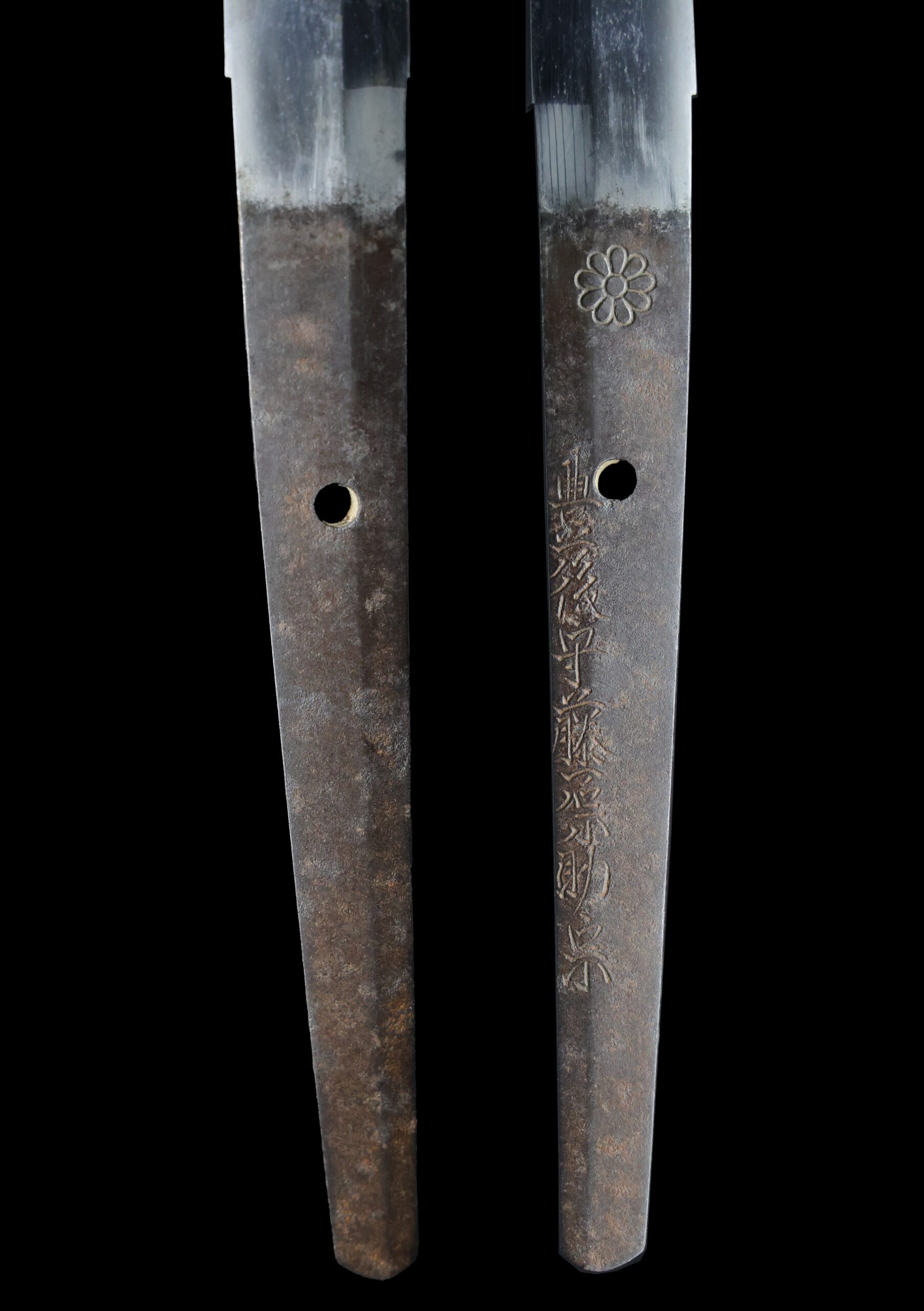 Japanese swordsmiths left the black rust on the tang because it prevents red rust while the tang is in its handle. And the discoloration of the tang was created over time, and it is a great indicator for a Japanese sword specialist to estimate when the sword was forged.