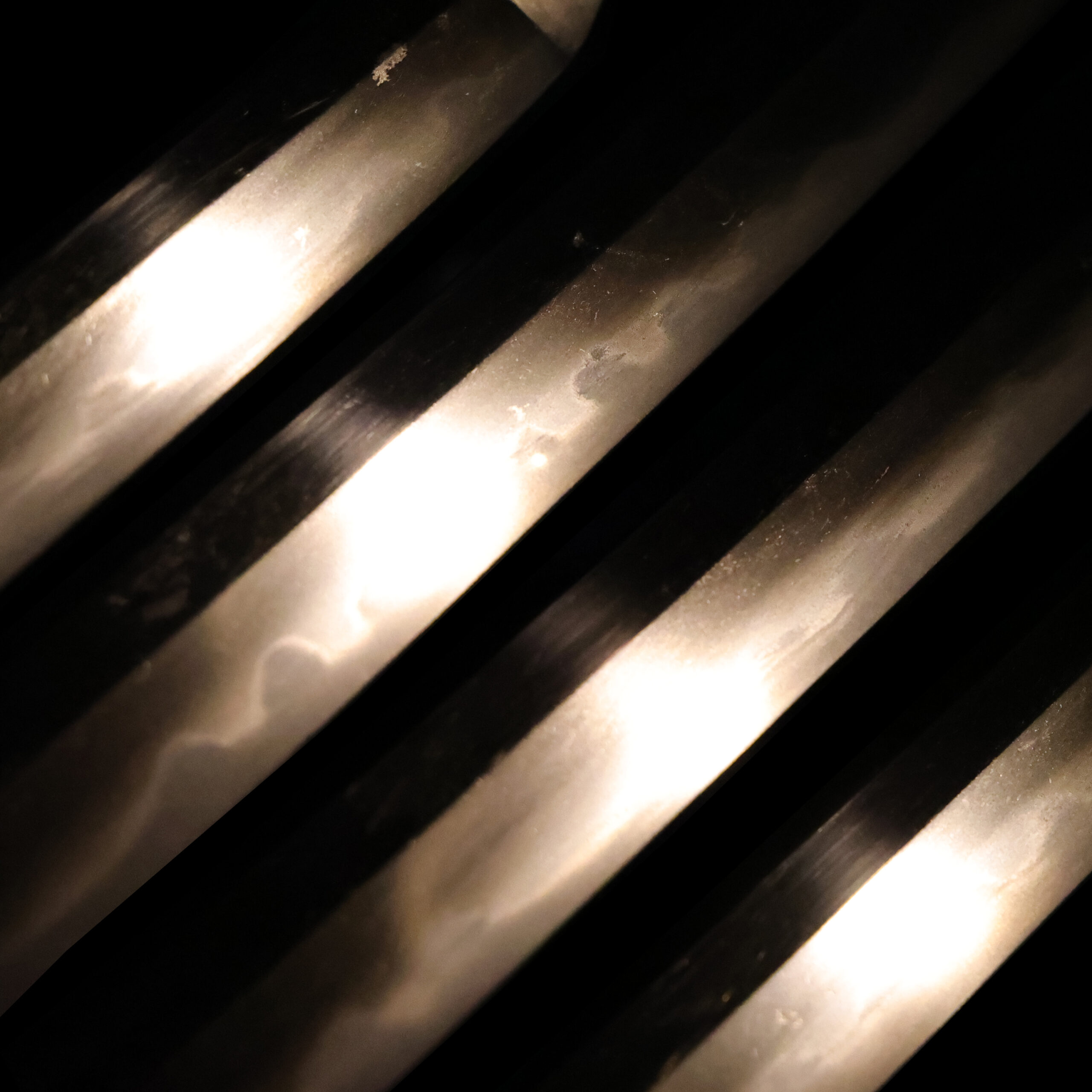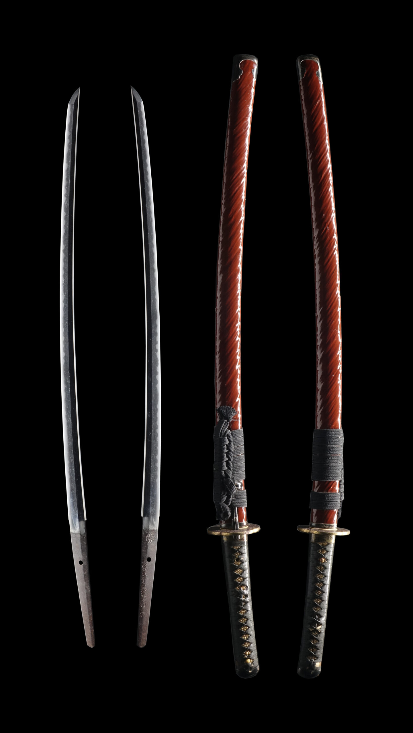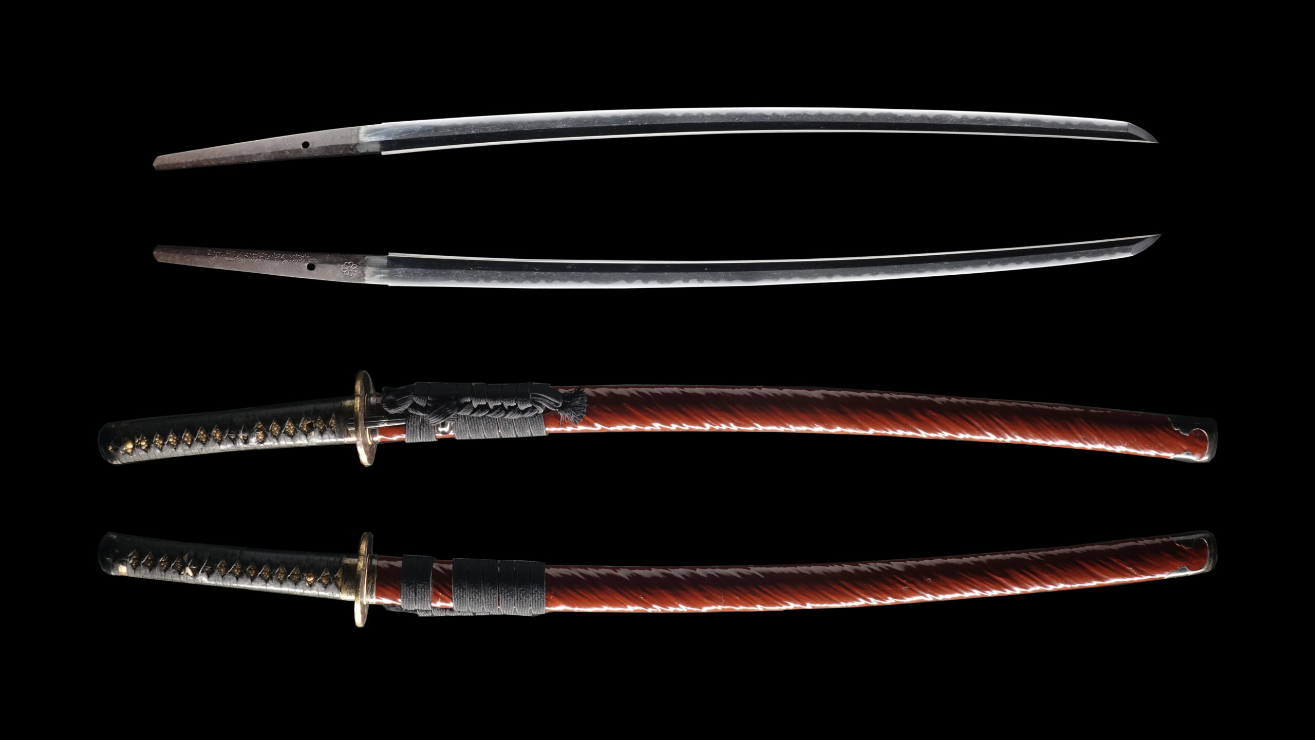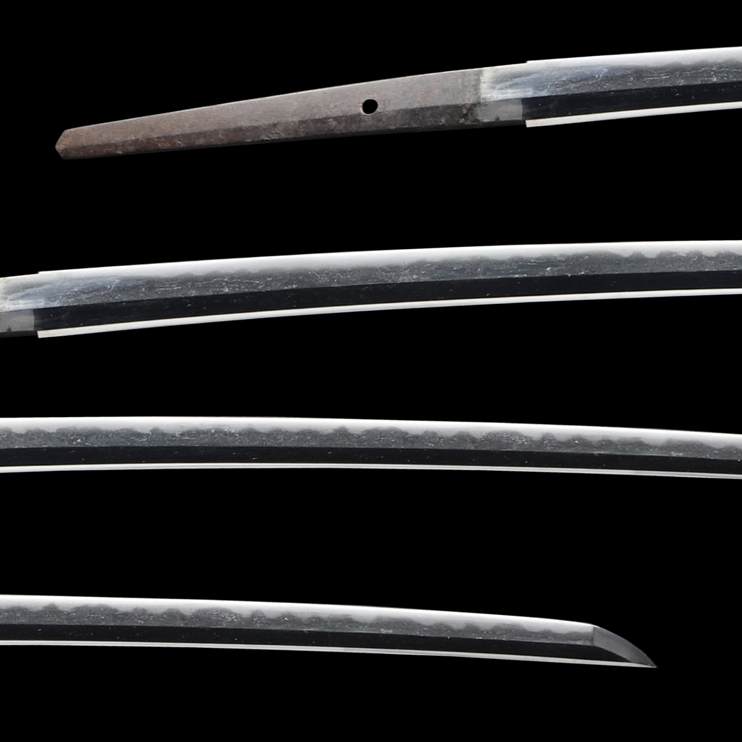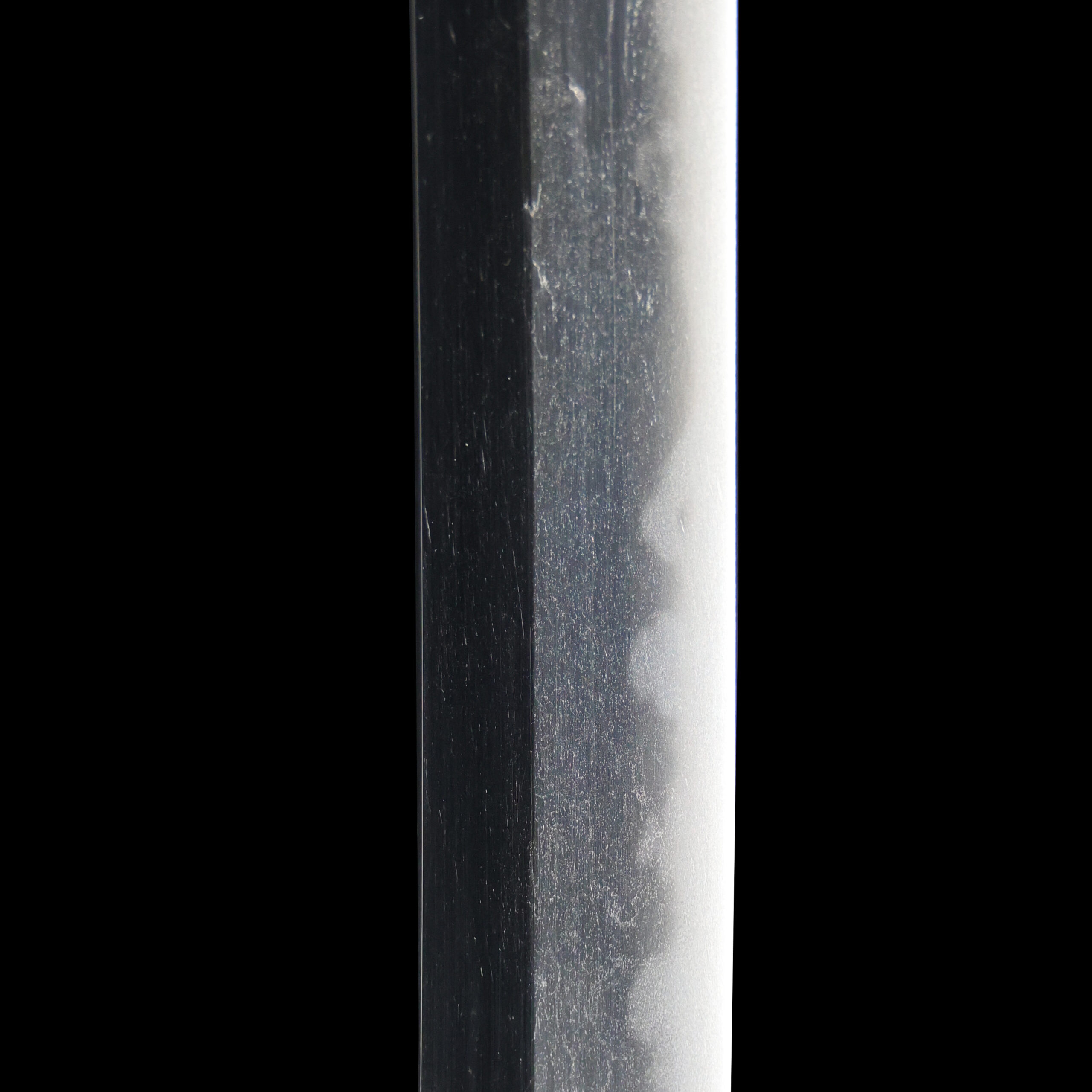Japanese swordsmiths left the black rust on the tang because it prevents red rust while the tang is in its handle. And the discoloration of the tang was created over time, and it is a great indicator for a Japanese sword specialist to estimate when the sword was forged.