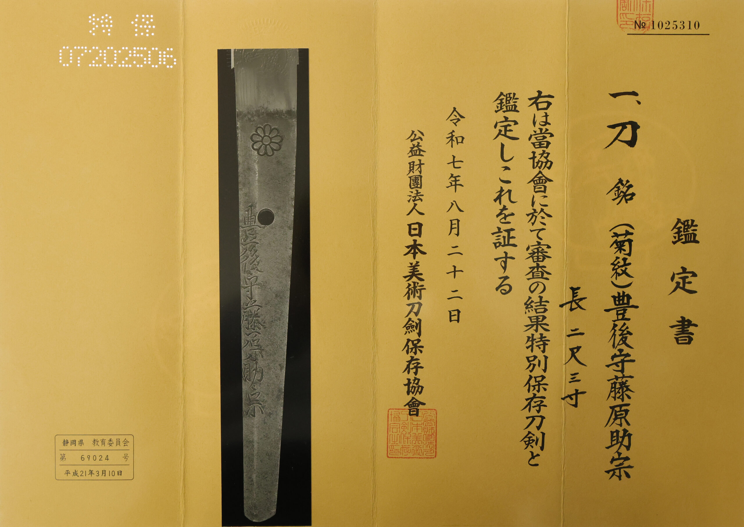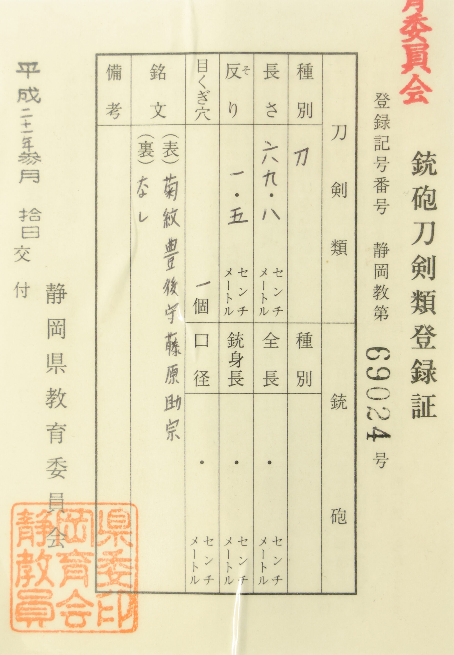 The Board of Education in Shizuoka prefecture issued a registration paper for this sword. It is called Jyu Hou Token Rui Tourokusho (銃砲刀剣類登録証). Bunkacho (The Agency for Cultural Affairs) acknowledges a Japanese sword with this paper as a work of art.
