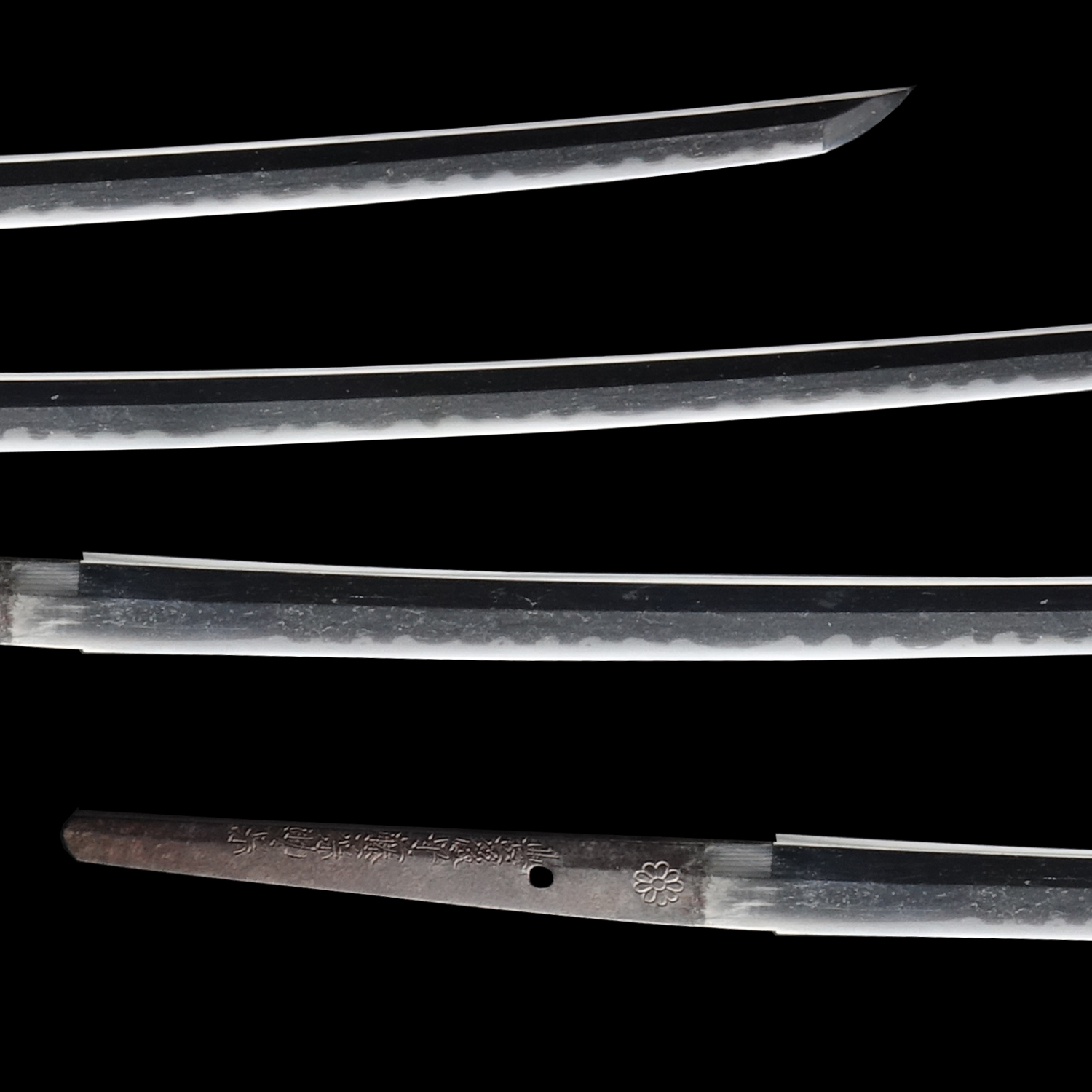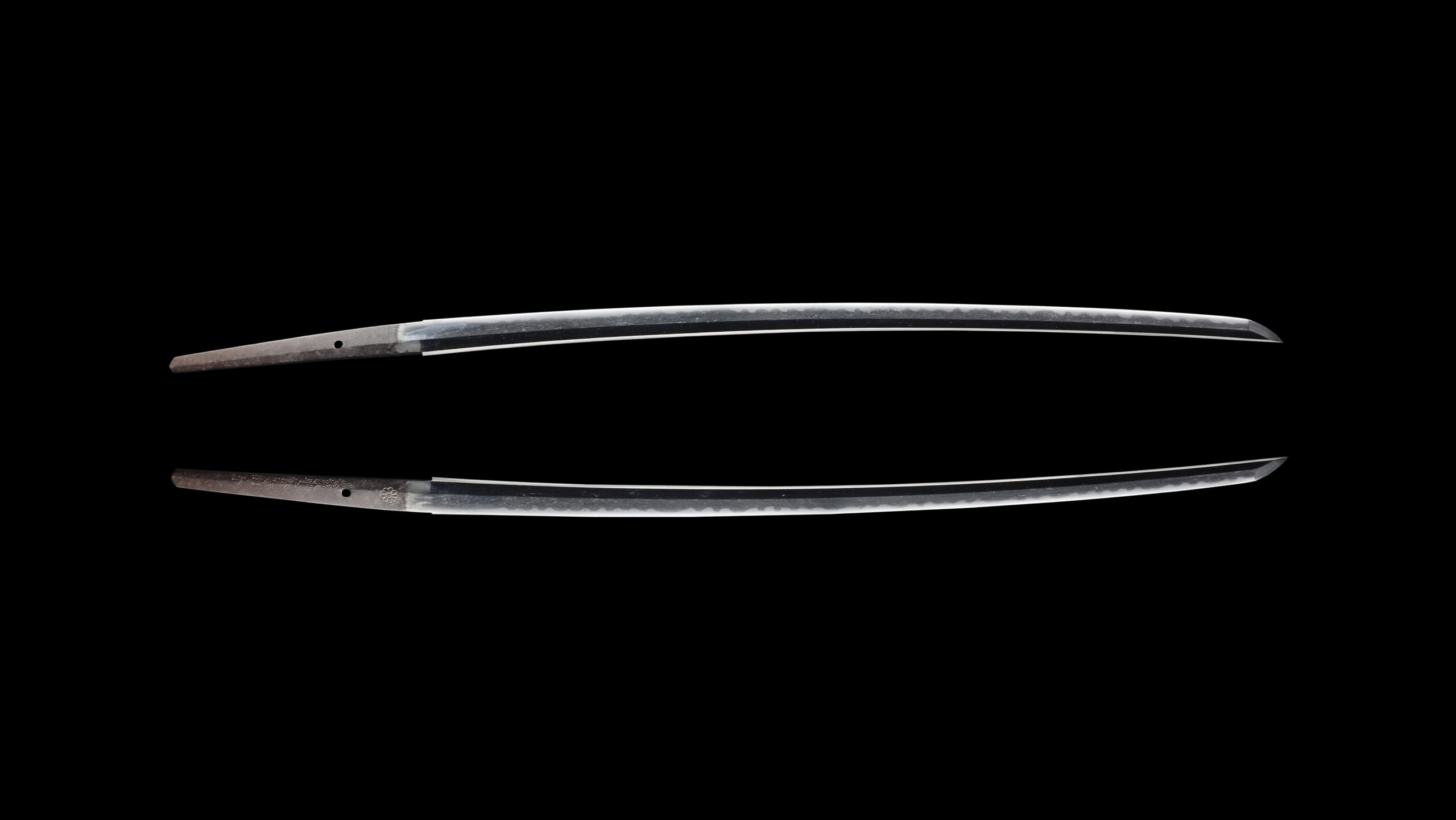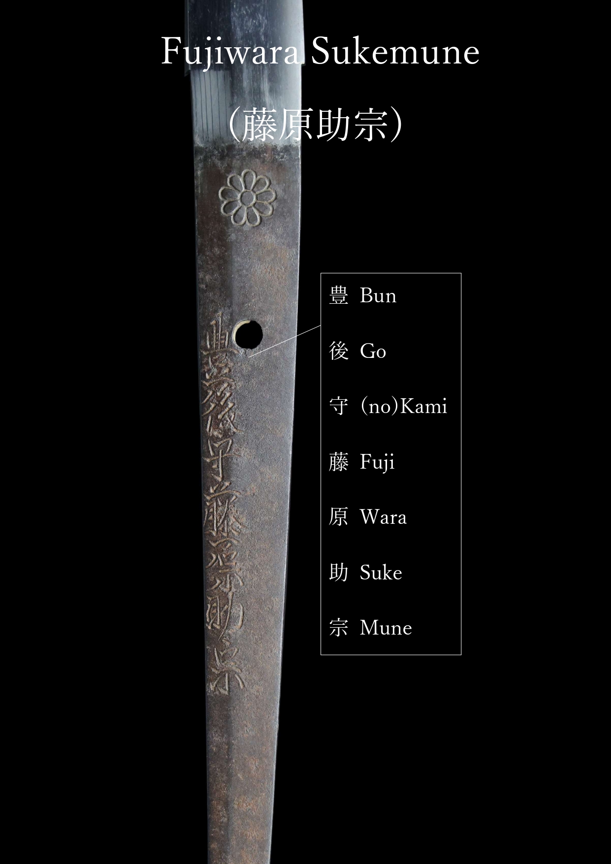 The “Bungo no Kami” was a hereditary honorary court title bestowed upon successive generations of Sukemune. The title Kami was granted by the imperial court in recognition of outstanding craftsmanship. Notably, the third-generation Sukemune was permitted to inscribe the chrysanthemum emblem (菊紋, kikumon)—the symbol of the Japanese emperor—on his blades. This privilege was extremely rare and signified exceptional skill and imperial favor. This blade bears that chrysanthemum emblem.