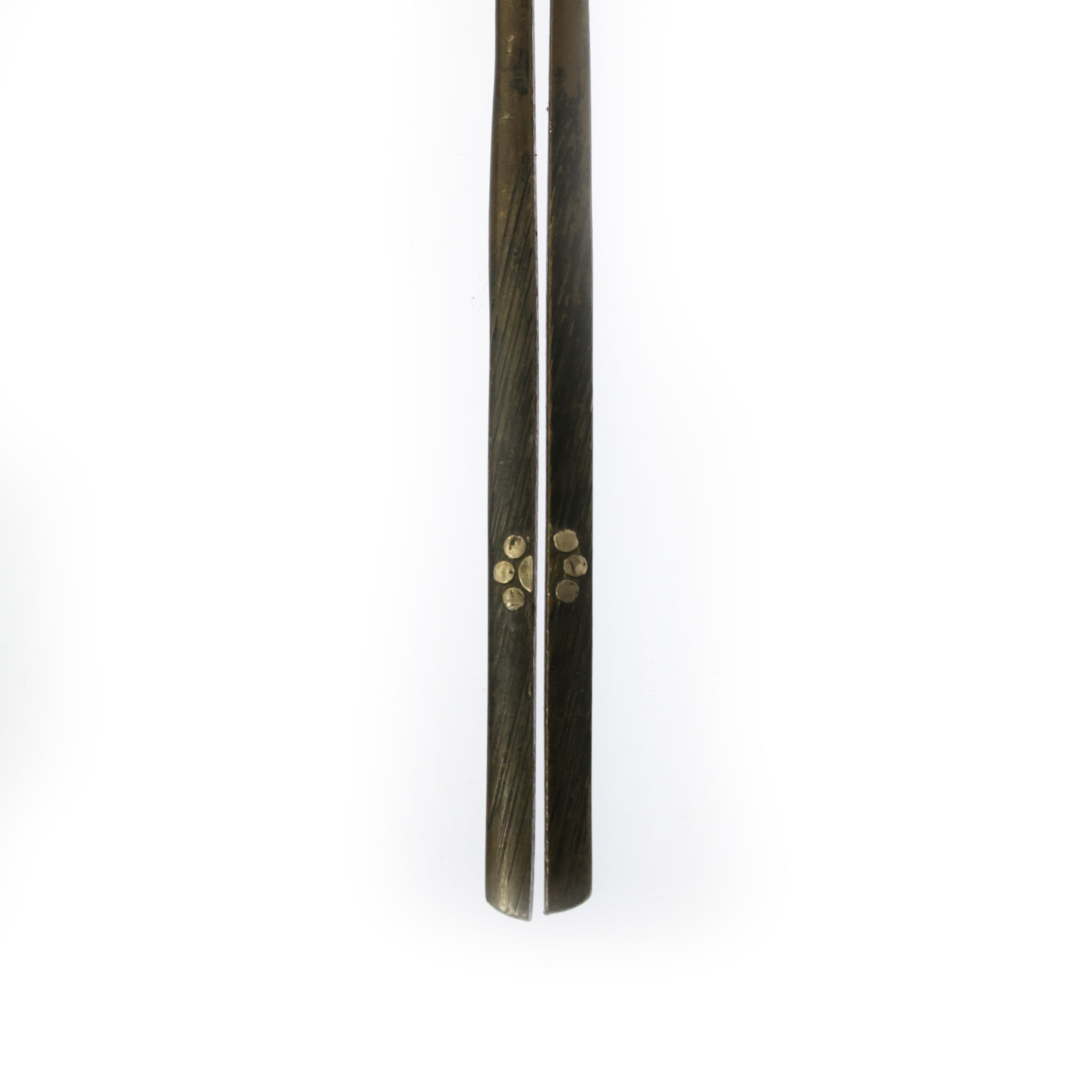 The design depicted on this kōgai is believed to represent the Shichiyō-mon (七曜紋), or “Seven Luminaries Crest.” This motif is based on the seven celestial bodies known in ancient East Asia: the Sun, Moon, Mars, Mercury, Jupiter, Venus, and Saturn. Together, these seven luminaries were associated with cosmology, timekeeping, and celestial order. In Japan, the Shichiyō-mon is also closely linked to the symbolism of the Big Dipper (北斗七星, Hokuto Shichisei) and was used as a family crest as well as a protective and auspicious emblem.