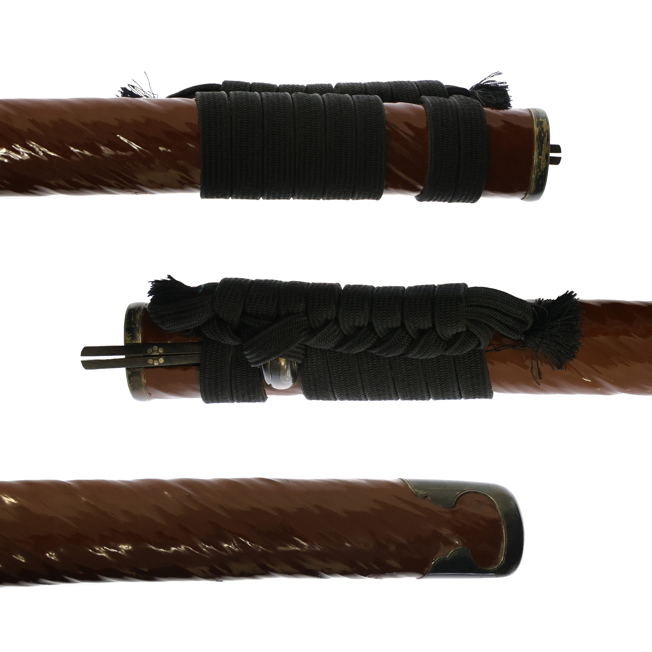 This saya features a luxurious red lacquer finish, decorated with a spiral pattern resembling a leech wrapped around its surface. This technique is likely a form of Hirumaki-nuri (蛭巻塗).