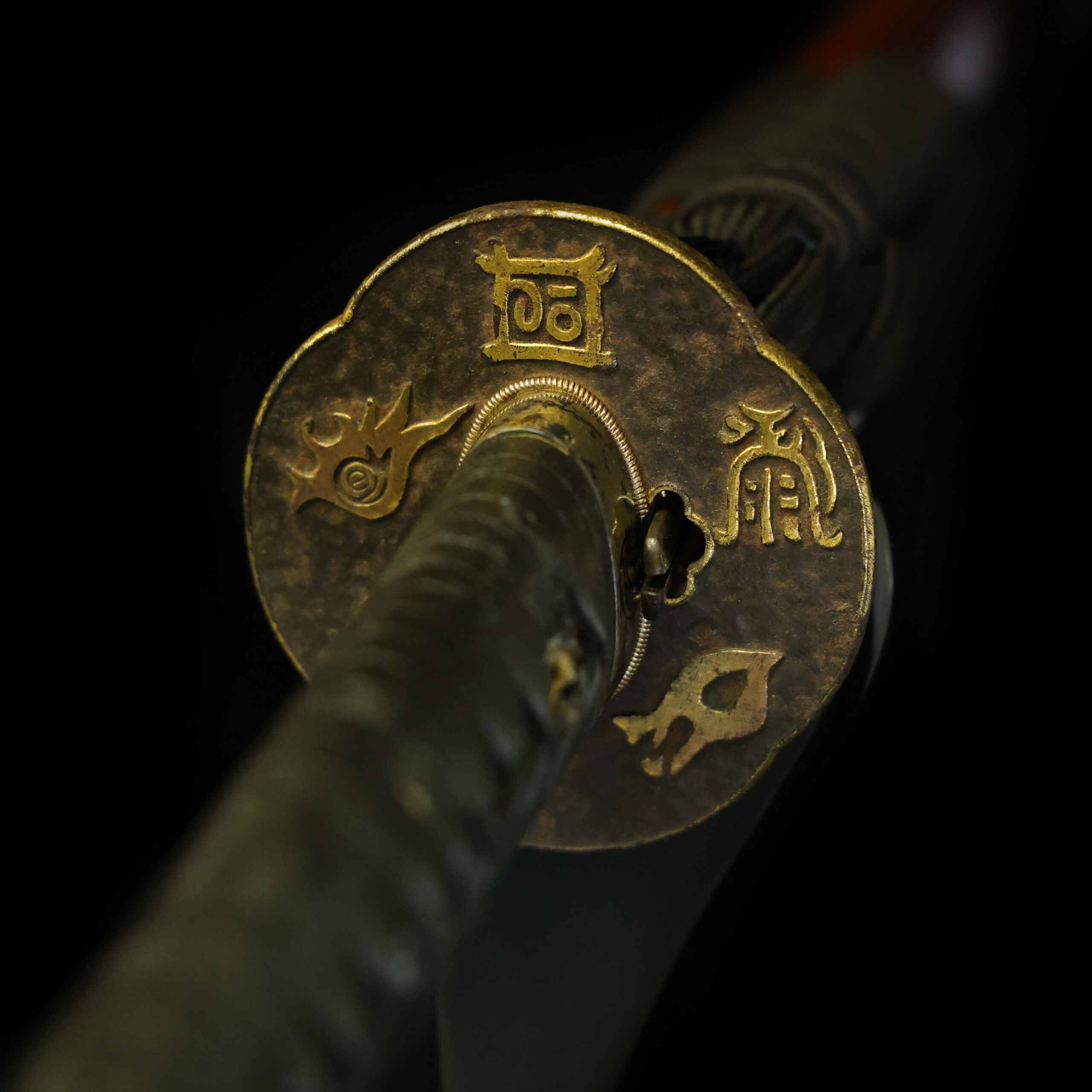 On this tsuba, archaic character forms representing zodiac signs such as the Rat (鼠) and the Dog (戌) are depicted. These characters are thought to be inspired by oracle bone script, which was used during the Yellow River civilization of ancient China. Historically, the Twelve Zodiac Signs appear engraved on oracle bones from the Shang dynasty, where they were combined with the Ten Heavenly Stems to record dates.