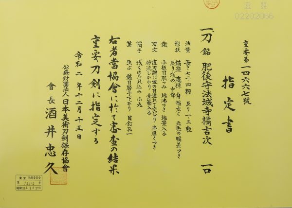 The Board of Education in Tokyo prefecture issued a registration paper for this sword . It is called Jyu Token Rui Torokusho(銃刀剣類登録証). Bunkacho(The Agency for Cultural Affairs) acknowledges a Japanese sword with this paper as a work of art.
