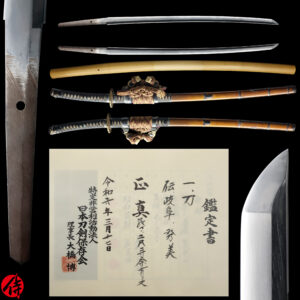 NBTHK, also known as Nihon Bijutsu Touken Hozon Kyokai (the Society for the Preservation of the Japan Art Sword), is one of the oldest Japanese sword appraising organizations in modern-day Japan. They authenticated the blade on March 19th in the 20th year of Heisei (2008). They appraised it as Hozon Touken, the blade worth preserving for Japanese society. The purchaser will receive this original certificate as well. We can also translate what is written into English and make a PDF file for your record if you request.