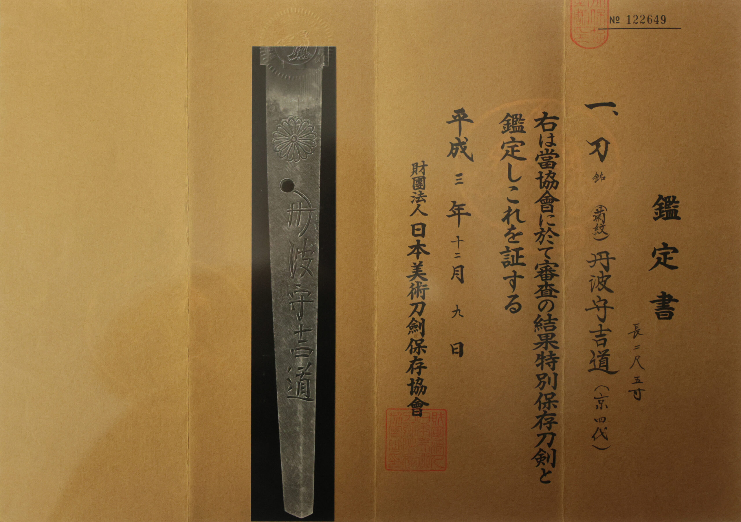 Authentication Paper:NBTHK TOKUBETSU Hozon Certificate for the blade (No. 122649)