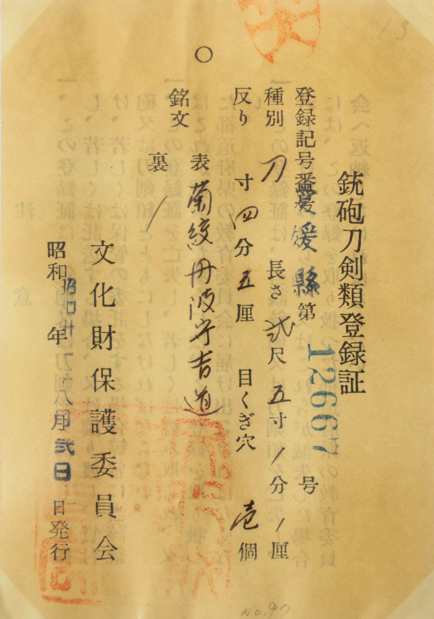 The Board of Education in Ehime prefecture issued a registration paper for this sword. It is called Jyu Hou Token Rui Tourokusho (銃砲刀剣類登録証). Bunkacho (The Agency for Cultural Affairs) acknowledges a Japanese sword with this paper as a work of art.