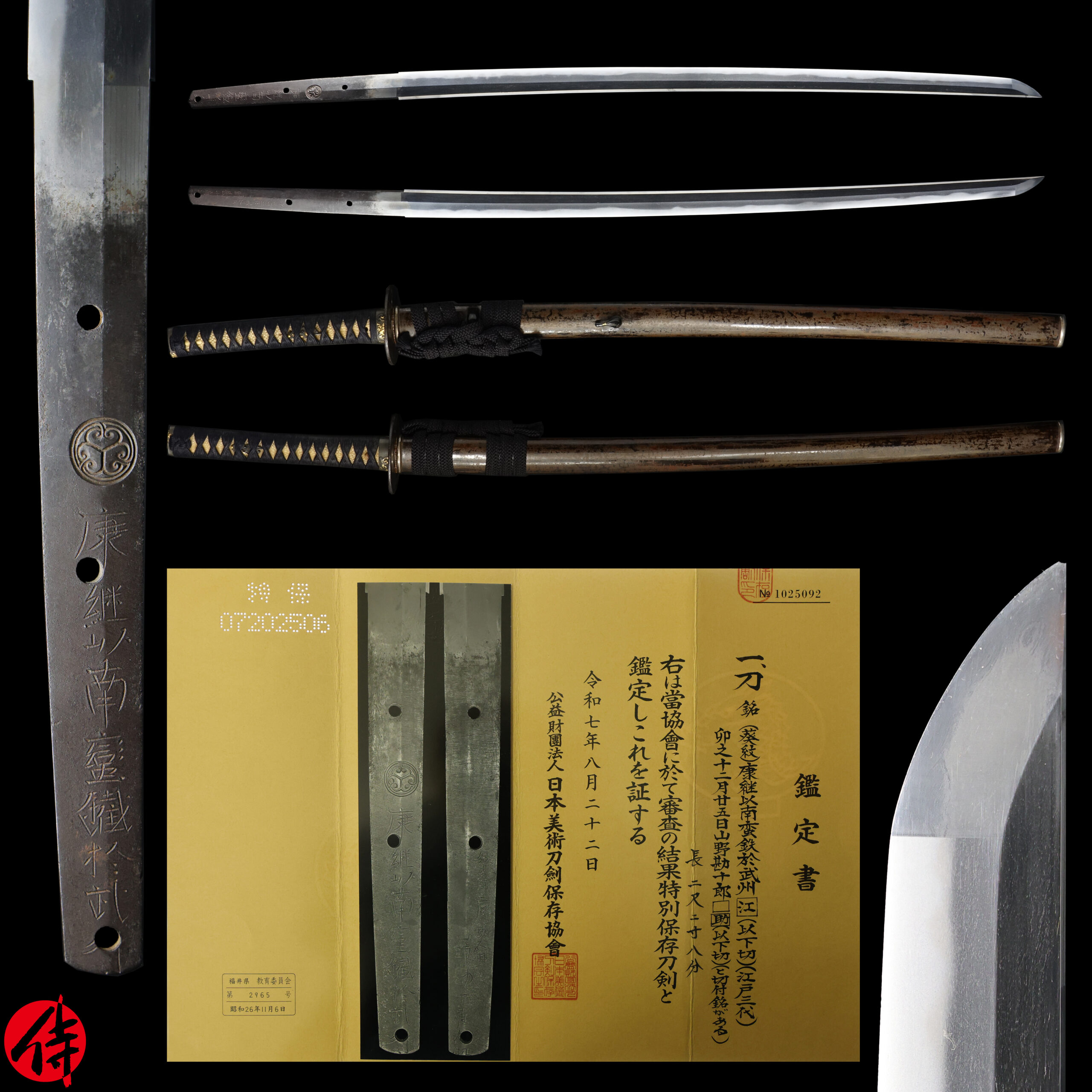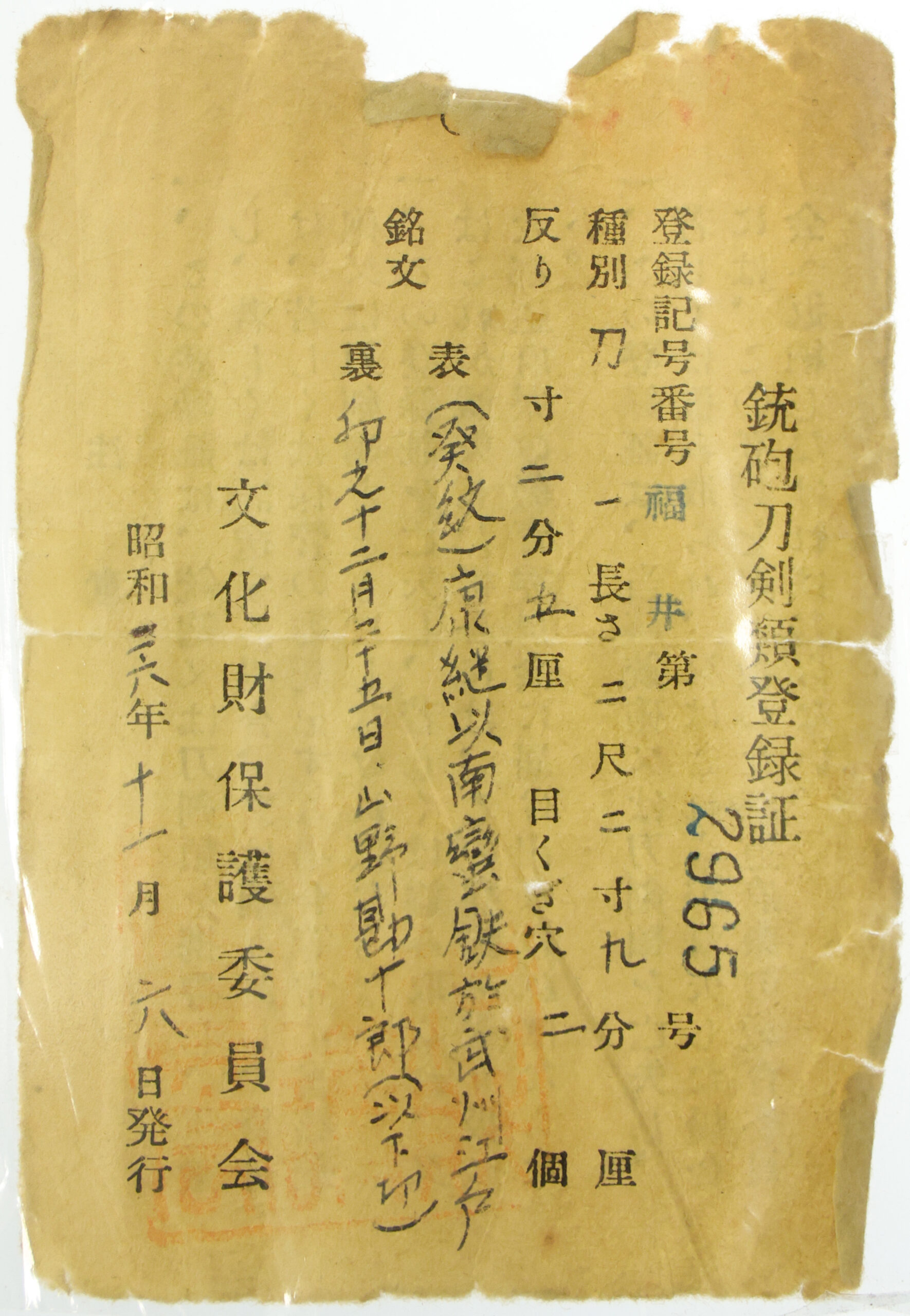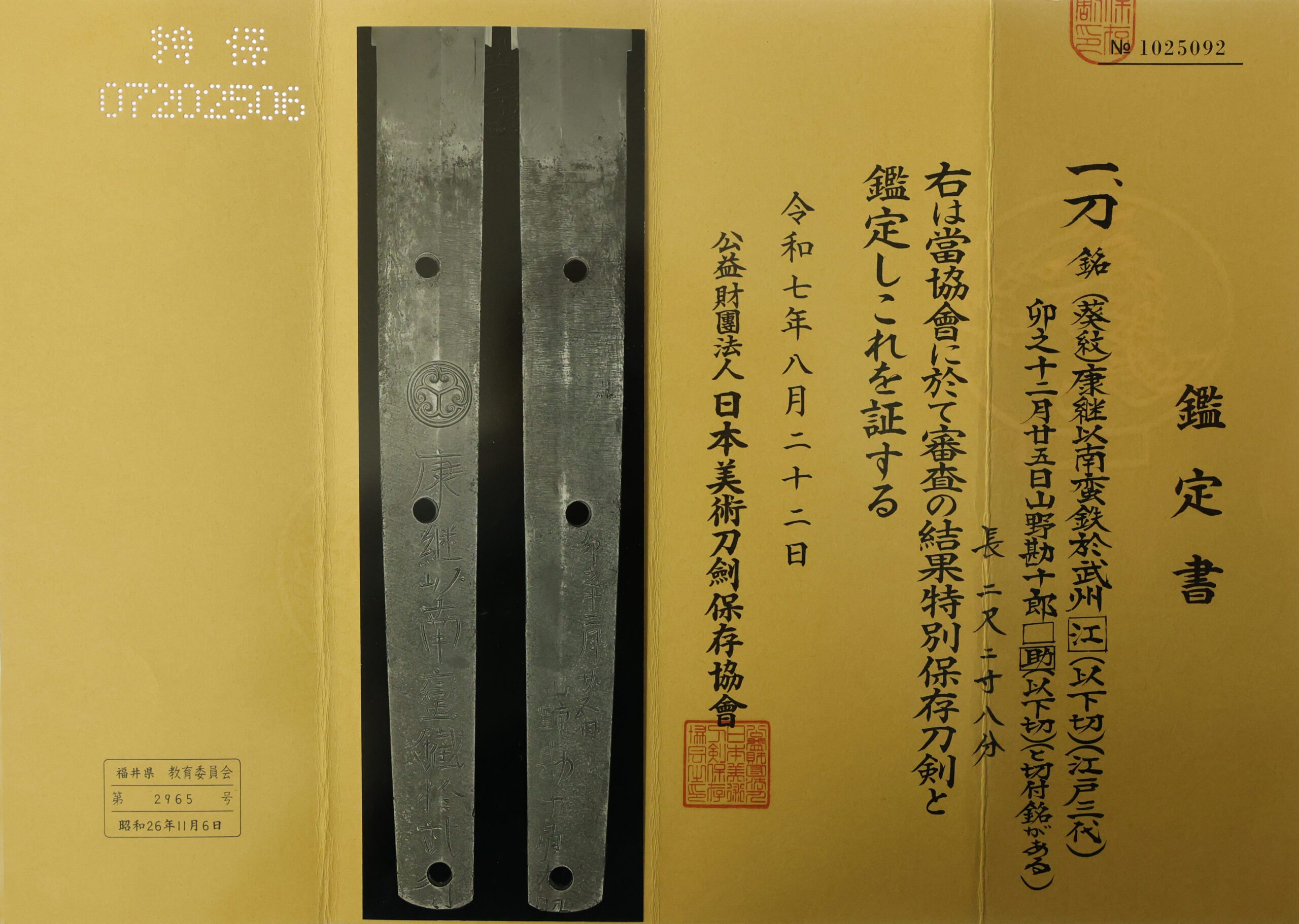 The Board of Education in Fukui prefecture issued a registration paper for this sword. It is called Jyu Hou Token Rui Tourokusho (銃砲刀剣類登録証). Bunkacho (The Agency for Cultural Affairs) acknowledges a Japanese sword with this paper as a work of art.