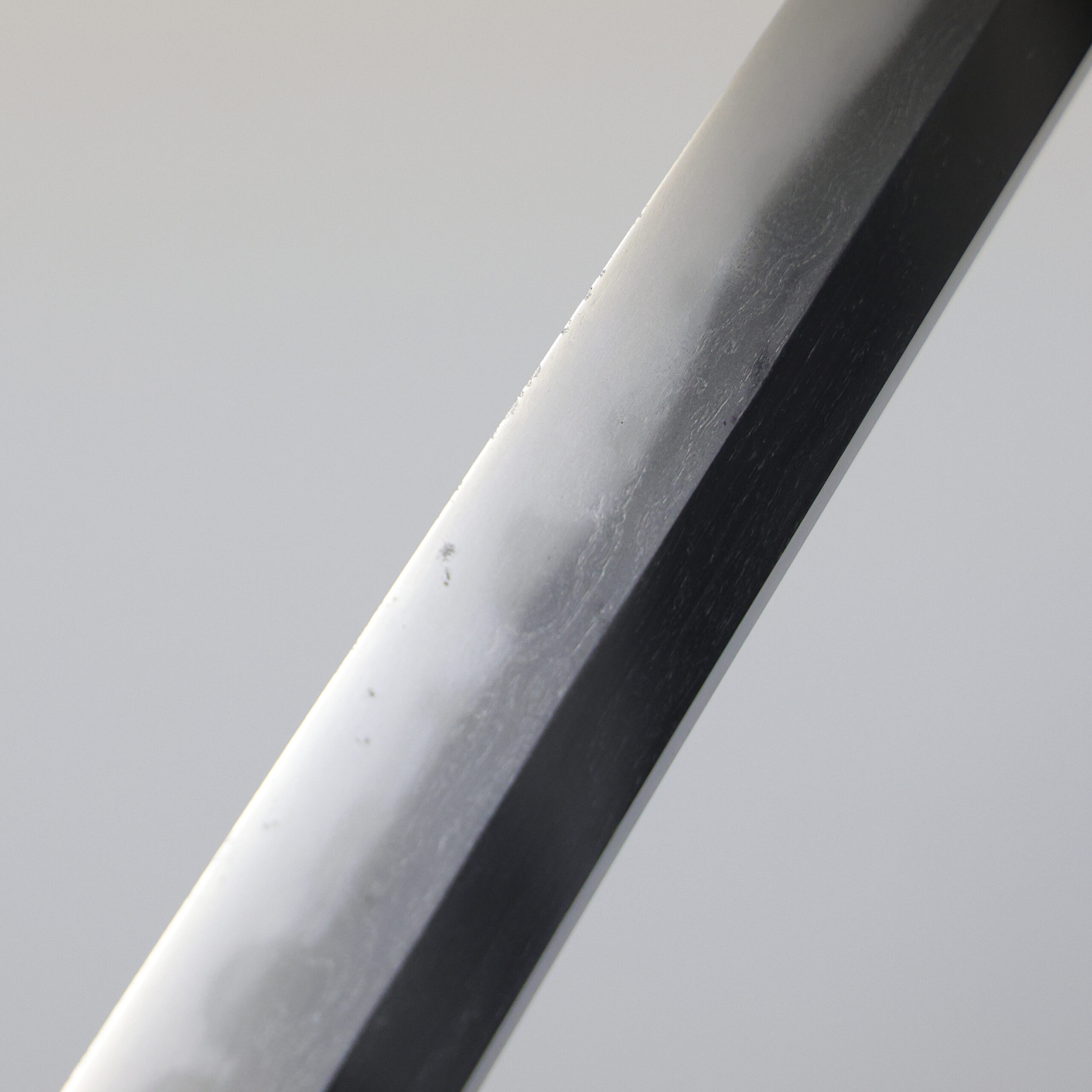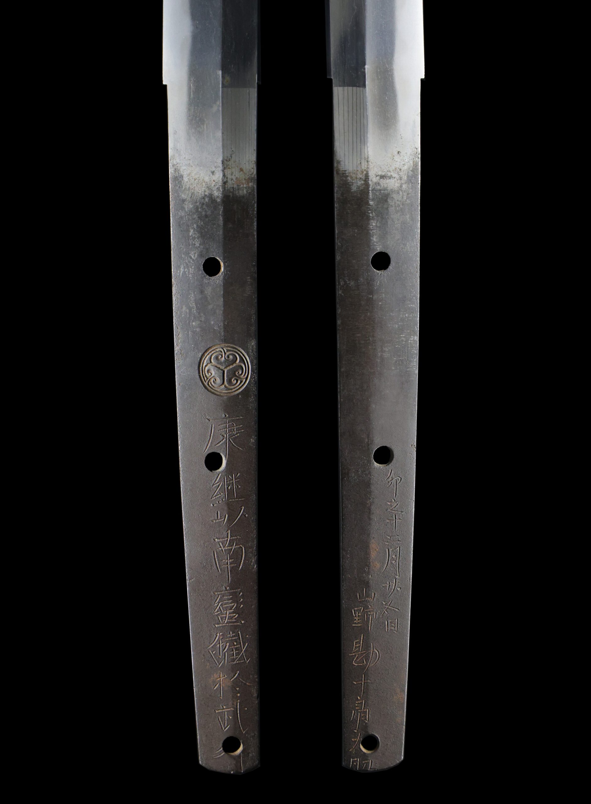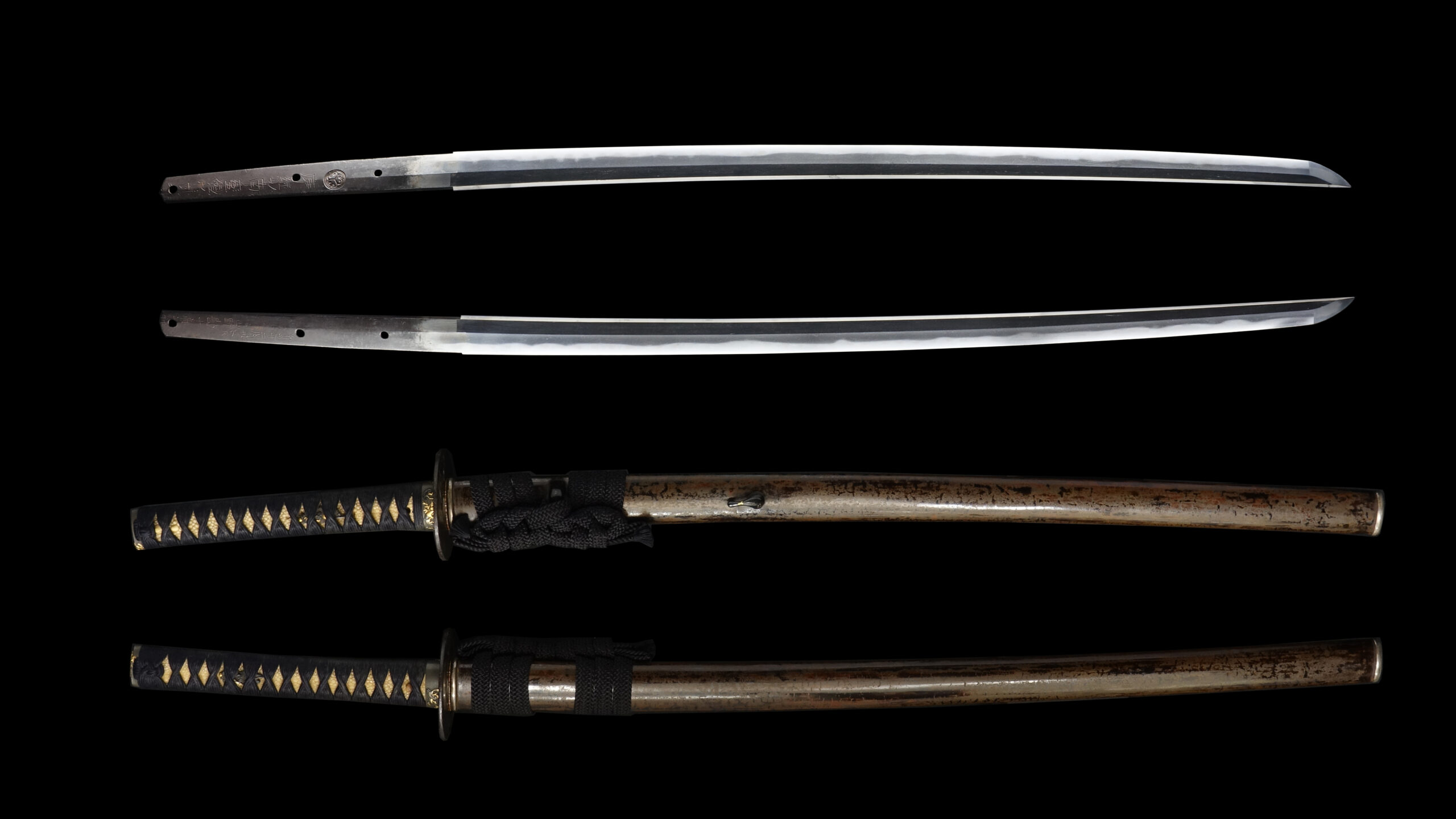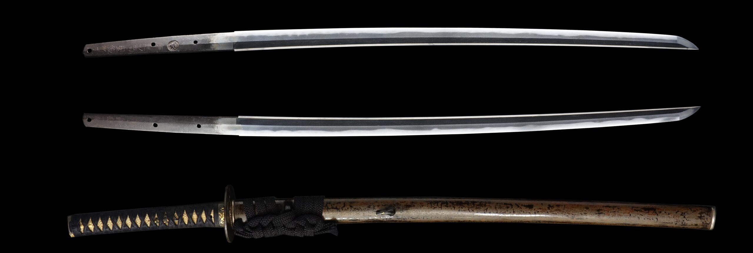 Japanese swordsmiths left the black rust on the tang because it prevents red rust while the tang is in its handle. And the discoloration of the tang was created over time, and it is a great indicator for a Japanese sword specialist to estimate when the sword was forged.