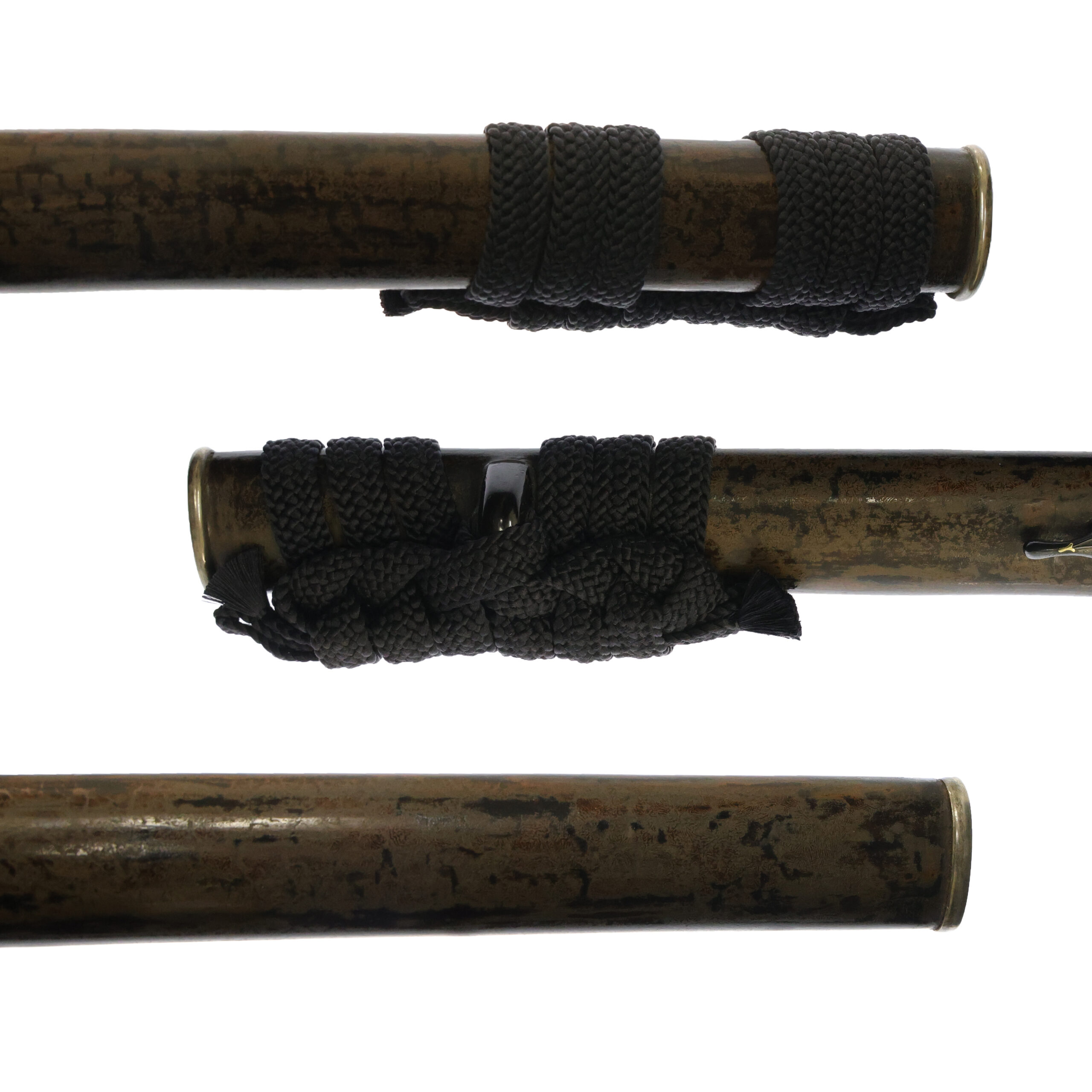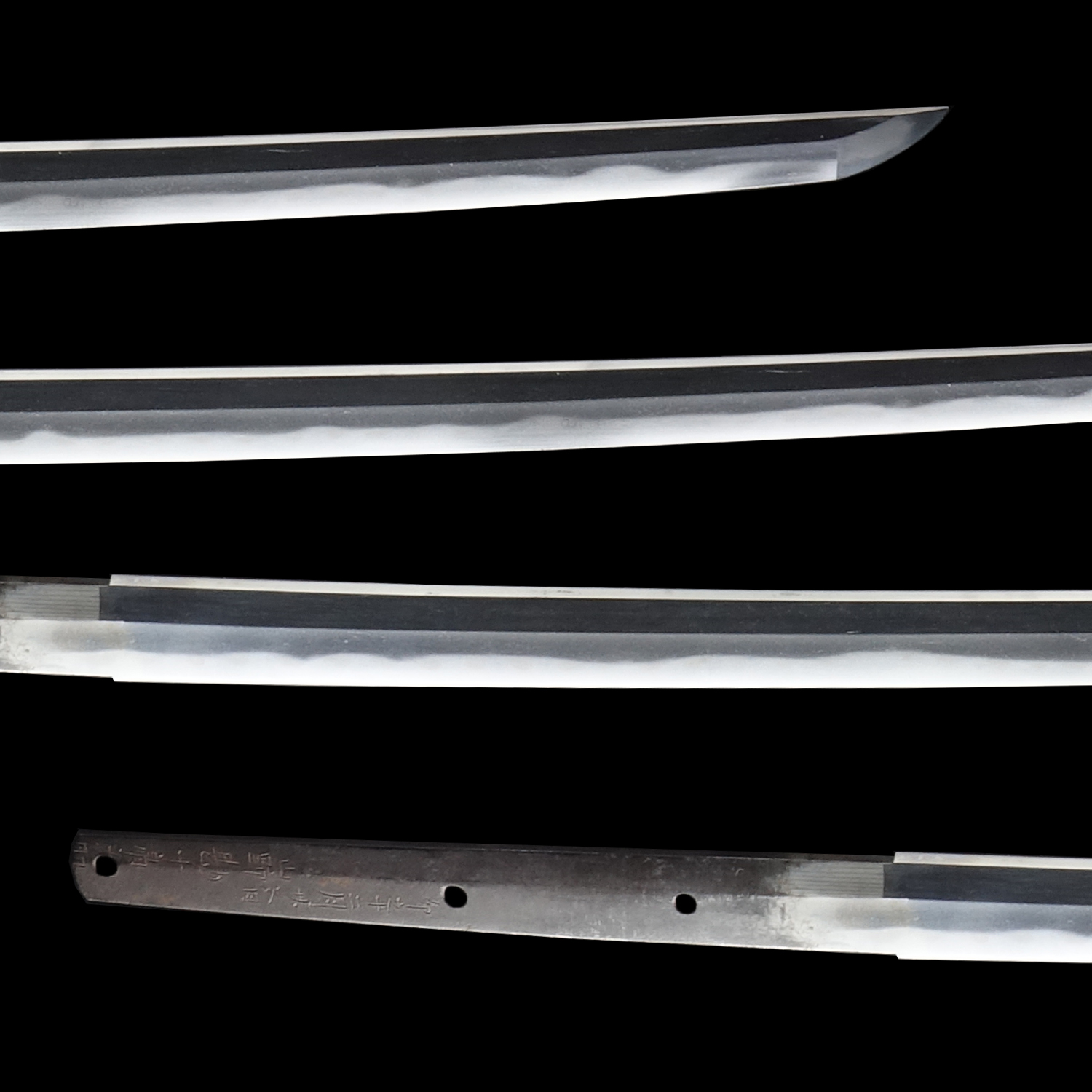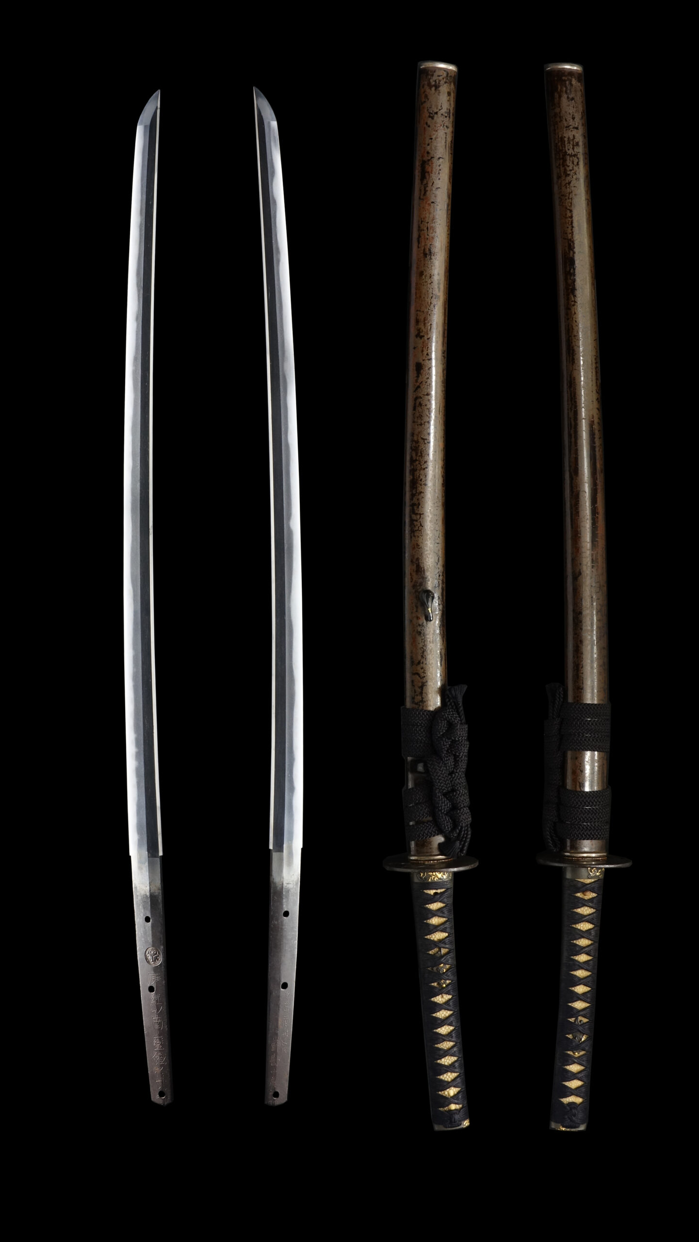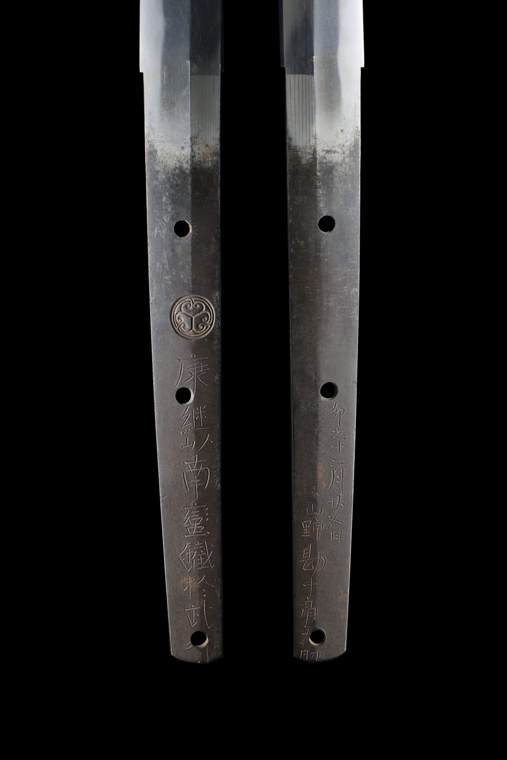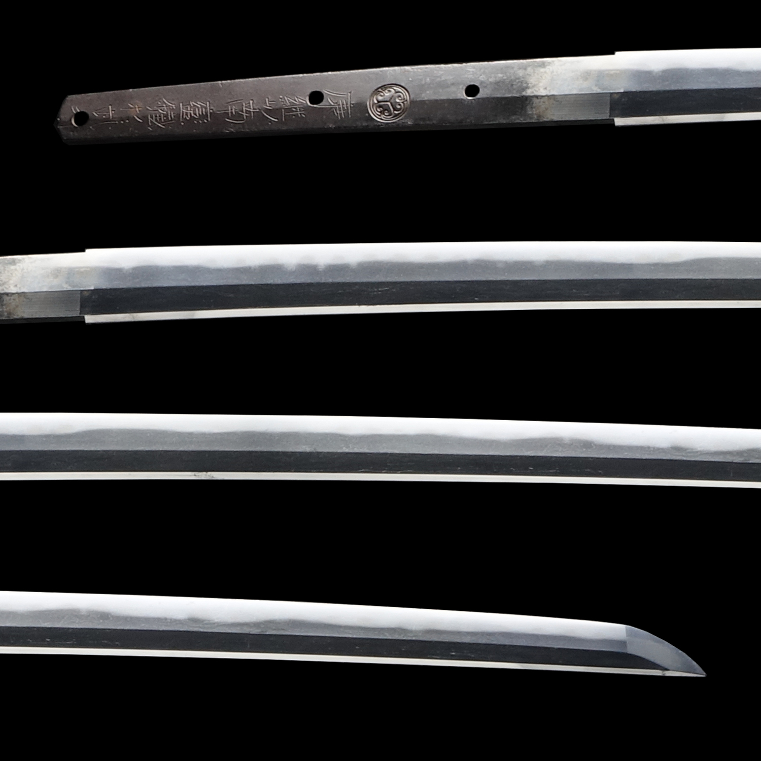 Japanese swordsmiths left the black rust on the tang because it prevents red rust while the tang is in its handle. And the discoloration of the tang was created over time, and it is a great indicator for a Japanese sword specialist to estimate when the sword was forged.