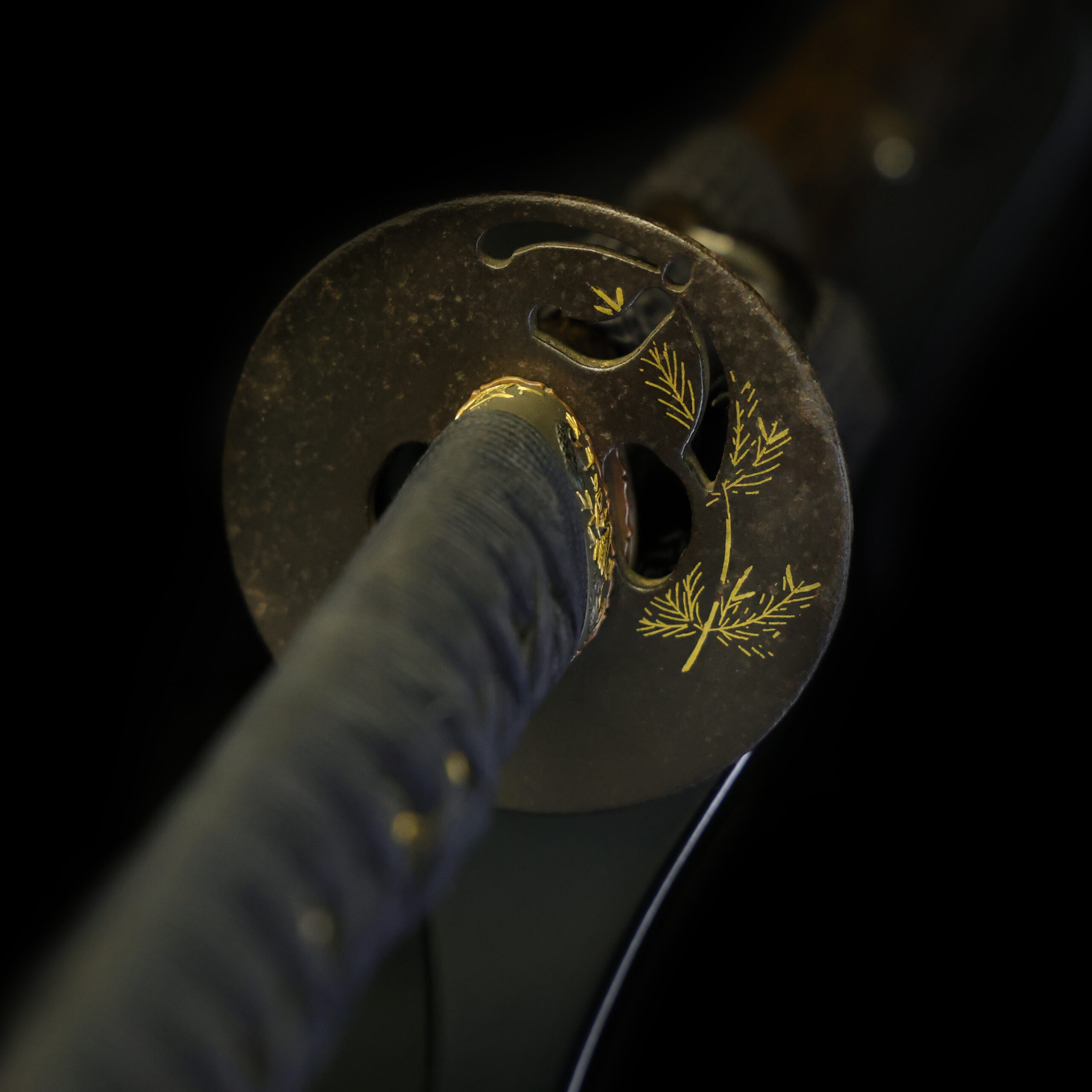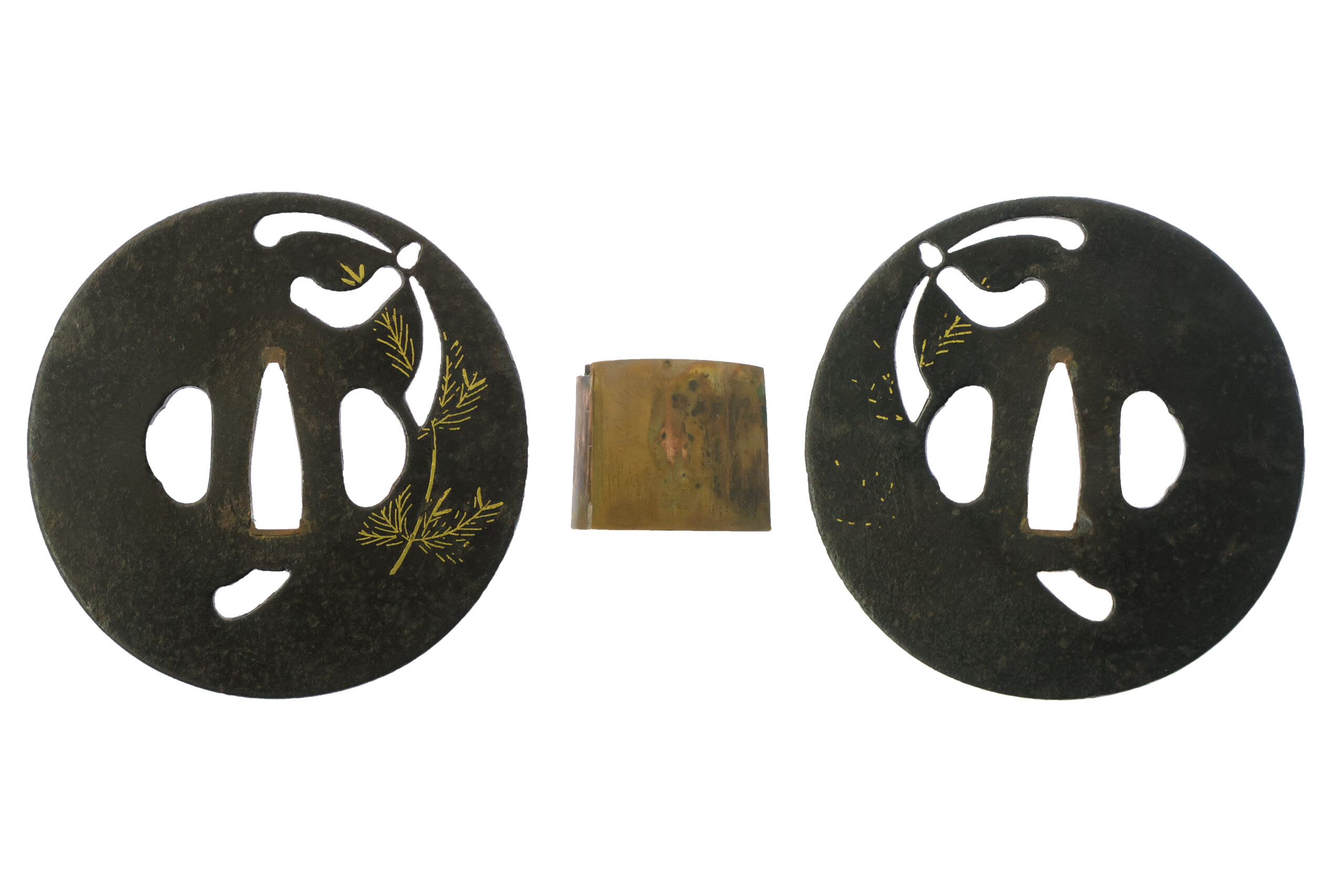This Tsuba feature a matsuba chirashi (松葉散らし, scattered pine needles) rendered in fine gold inlay. Pine needles have long been regarded as auspicious symbols because even when they wither, fall from the tree, or break, the two halves remain together. For this reason, the design has been cherished as a kisshō monyō (吉祥文様, auspicious motif) symbolizing strong bonds and inseparable ties. It has traditionally been used in decorative arts and sword fittings to express wishes for longevity, unwavering friendship and love, and harmony between husband and wife.