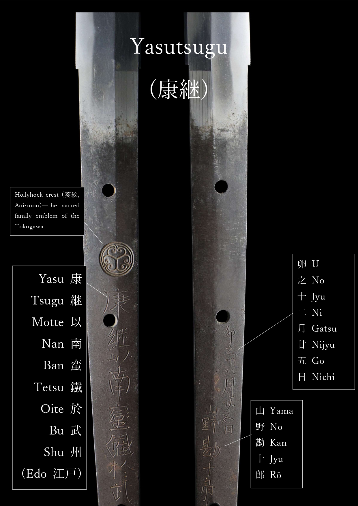 In recognition of his exceptional skill and trustworthiness, the first-generation Yasutsugu was granted the character “康” (Yasu) directly from Tokugawa Ieyasu, an extraordinary honor that prompted him to adopt it as part of his swordsmith name. Furthermore, he was permitted to inscribe the hollyhock crest (葵紋, Aoi-mon)—the sacred family emblem of the Tokugawa—on the tang of his blades.
