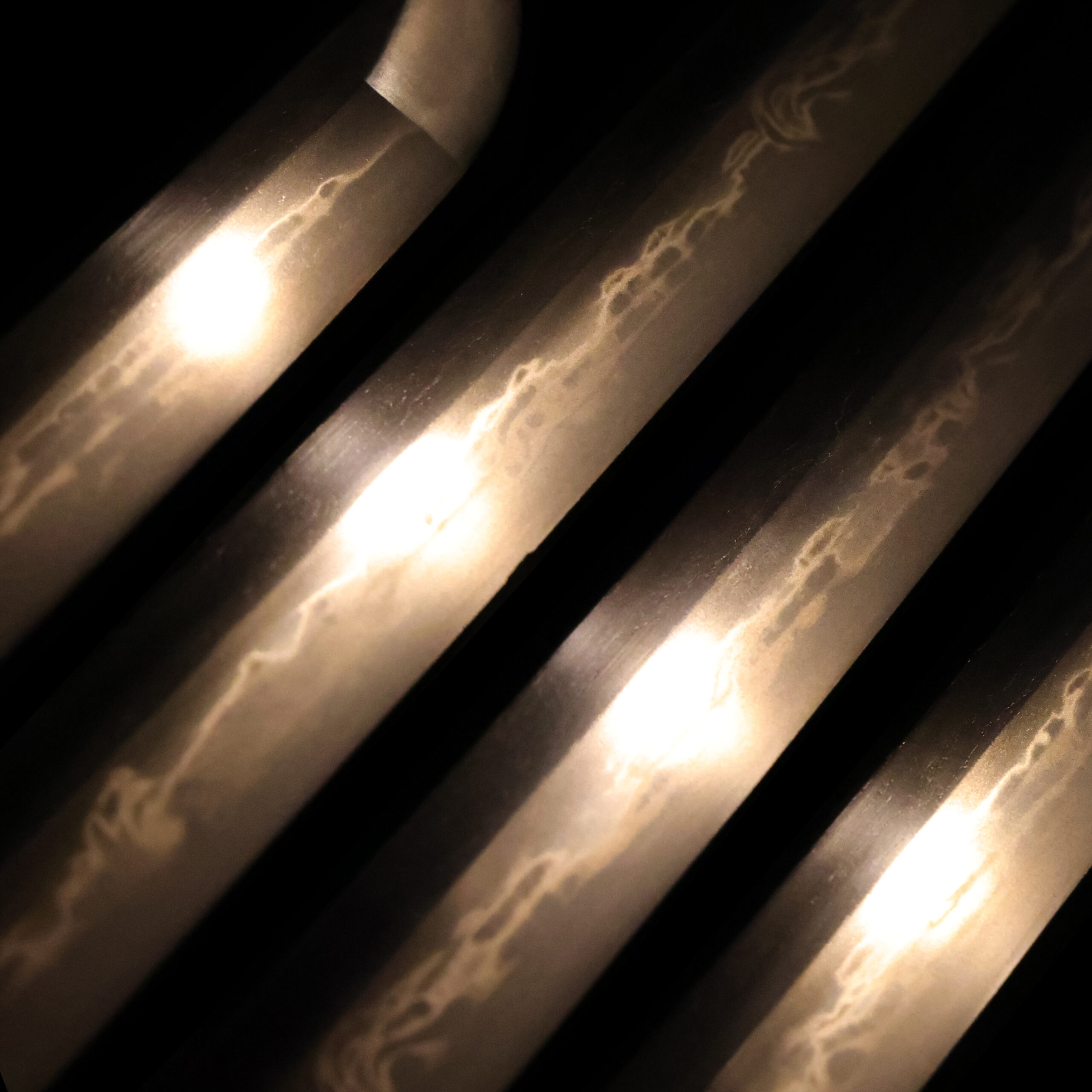 The first-gen Tanba no Kami Yoshimichi developed a unique Hamon pattern(tempering line) called Sudareba(簾刃). Sudare means traditional screens or blinds in Japanese. The Hamon pattern he invented resembles its appearance to Sudare. This blade has a beautiful Sudareba Hamon. This special characteristic was passed down to generations of Yoshimichi.