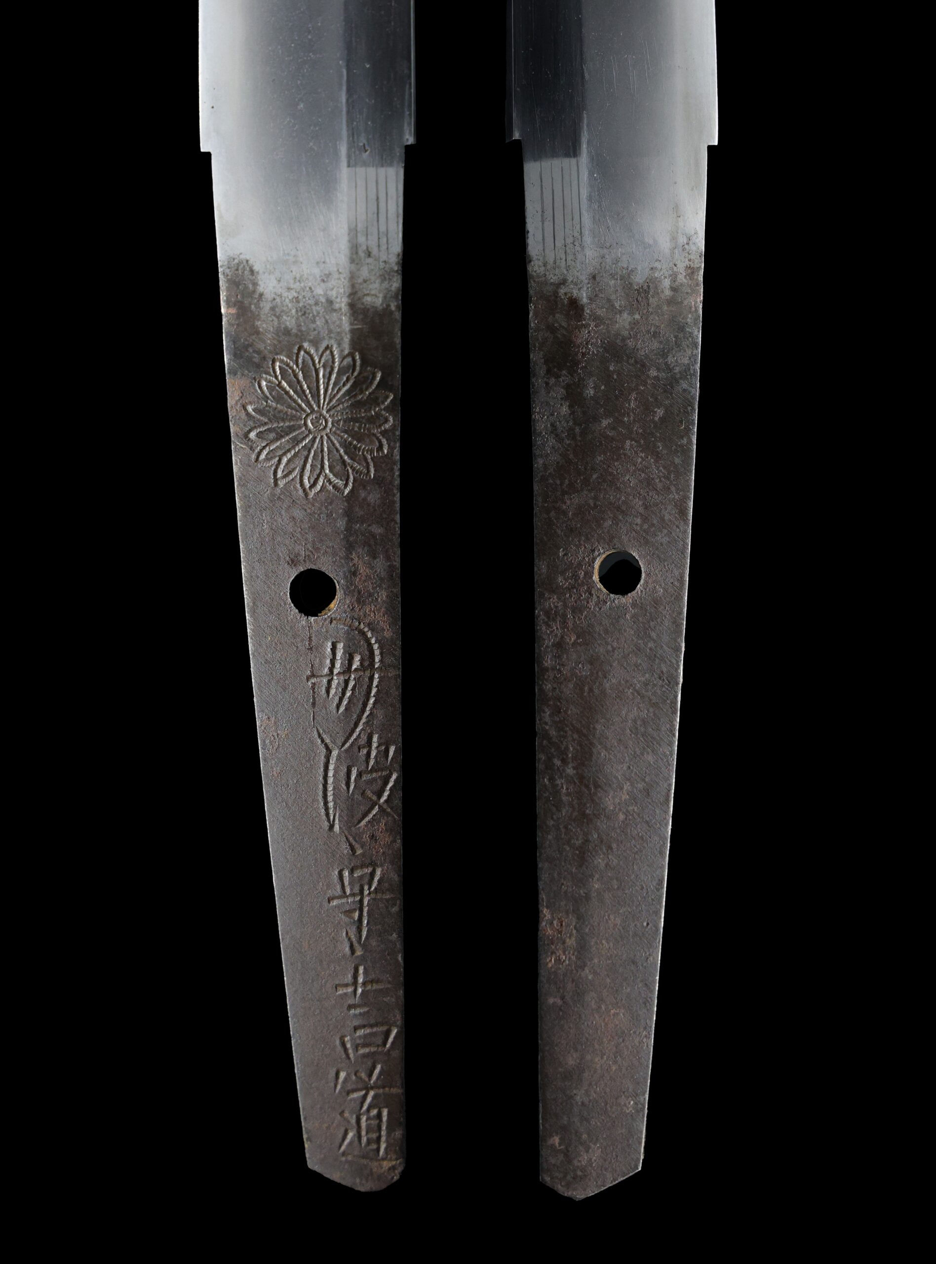 The back of the tang has an inscription of Kikumon (菊紋, chrysanthemum emblem). Kinmichi was allowed to inscribe this emblem, which is the symbol of the Japanese emperor. His sword forging technique was so great that the emperor permitted him to use this emblem, which was honorable for any swordsmith.