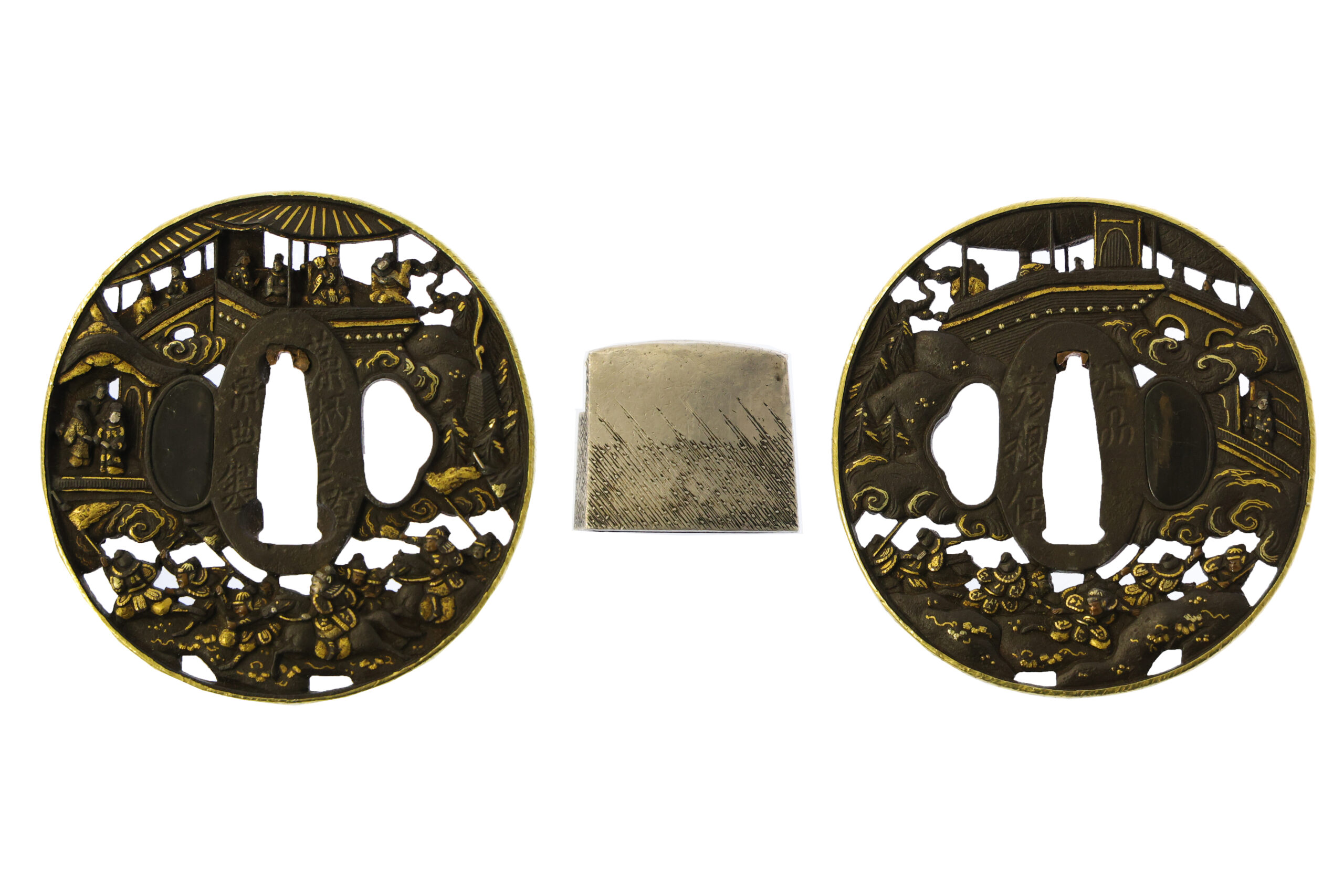 This tsuba features an elaborate openwork and high-relief design richly decorated with gold inlay, depicting a lively narrative scene. In the upper section, figures are shown within a grand pavilion—perhaps noblemen or courtiers engaged in a ceremonial or literary gathering—while below, armored warriors on horseback ride in procession, suggesting a military or imperial theme. The composition likely draws inspiration from classical Chinese tales or historical events, which were popular motifs among Edo-period sword fittings.