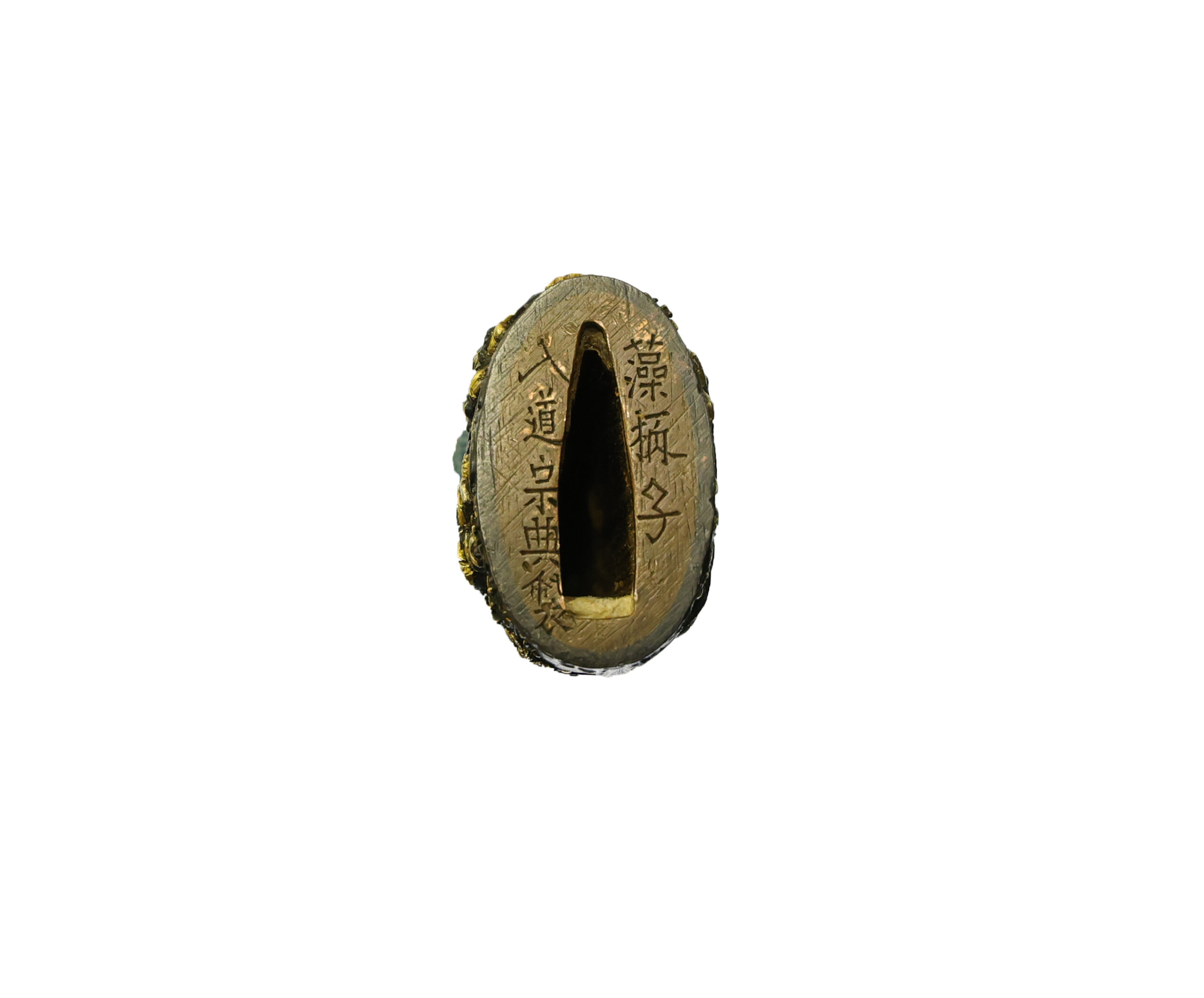 This Fuchi-Kashira features two Samurai participating in battle. One is mounted on horseback, sword drawn, while the other charges forward wielding a naginata. The scene is rendered with exquisite craftsmanship, vividly capturing the tension and movement of combat. Plum blossoms are also incorporated into the design.