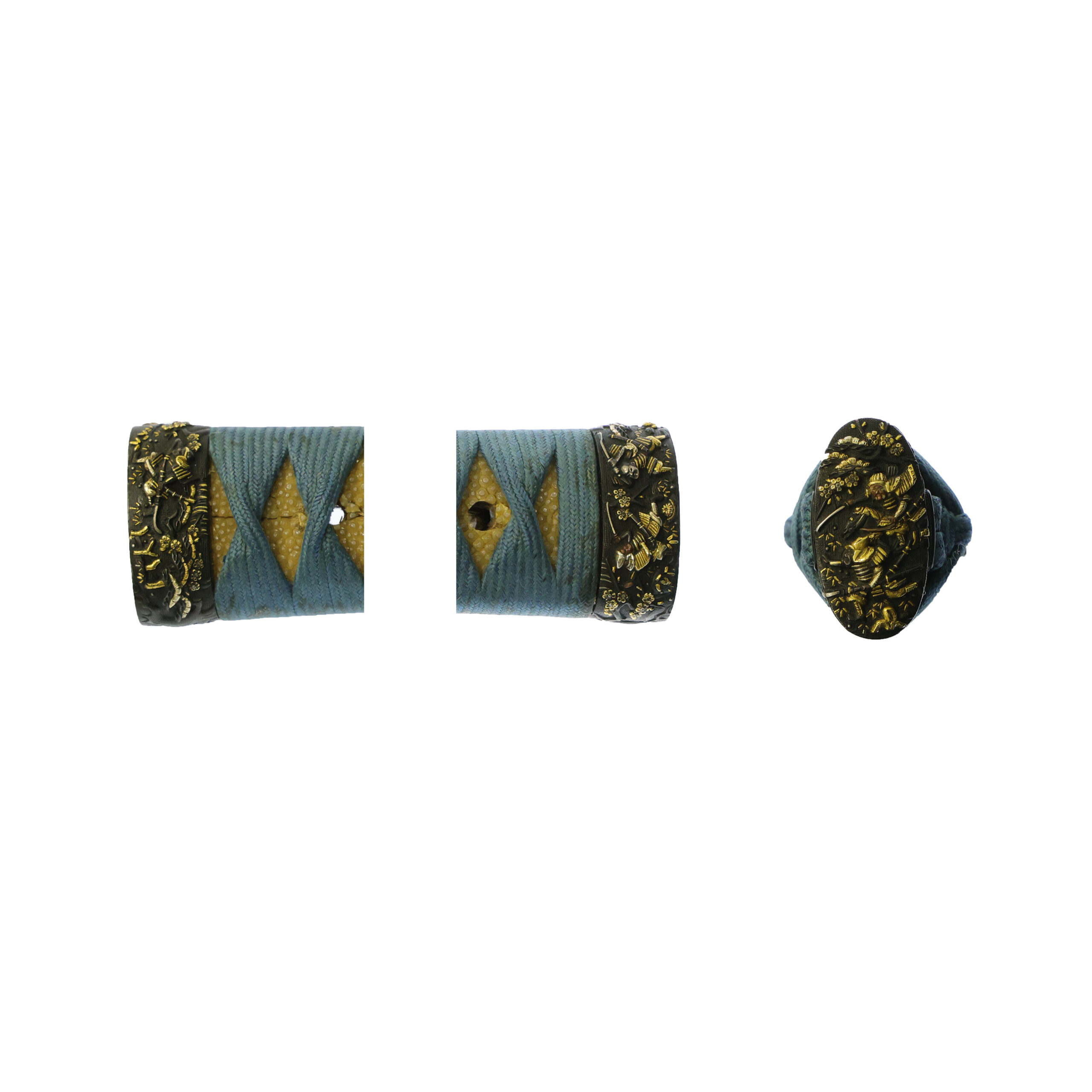 The menuki depict Samurai warriors in battle, similar to the theme shown on the Fuchi-kashira.