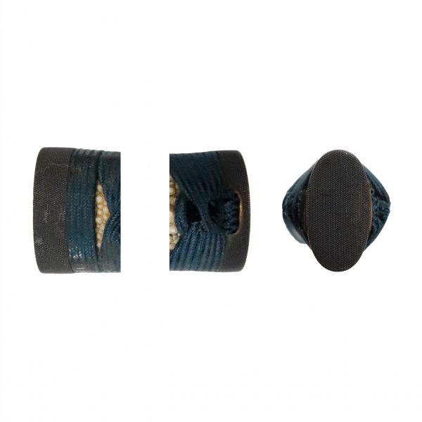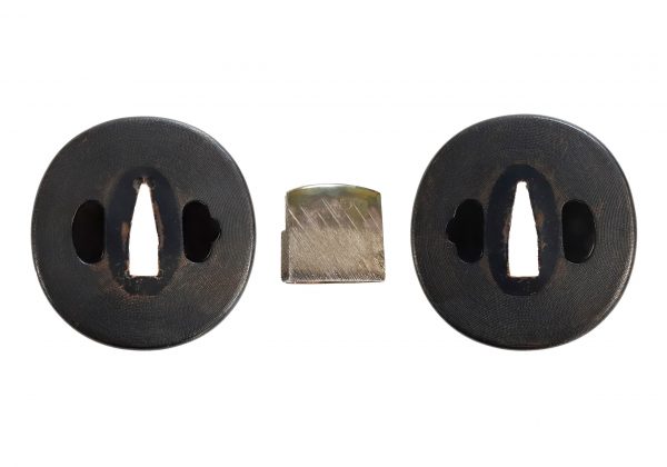 The Nanako-Ji (魚子地) technique decorates this Fuchi Kashira. Its surface was hit by the Nanako-Ji Tagane (魚子地鏨, chisel used for this technique). It makes delicate fish egg-shaped protrusions on the entire surface of the Tsuba. The Nanako-Ji with the same size of particles lined up regularly makes us feel the maker’s expert skill. Although this Fuchi Kashira does not have ornamental decoration such as gold or silver inlay, you would enjoy the texture of the material itself.