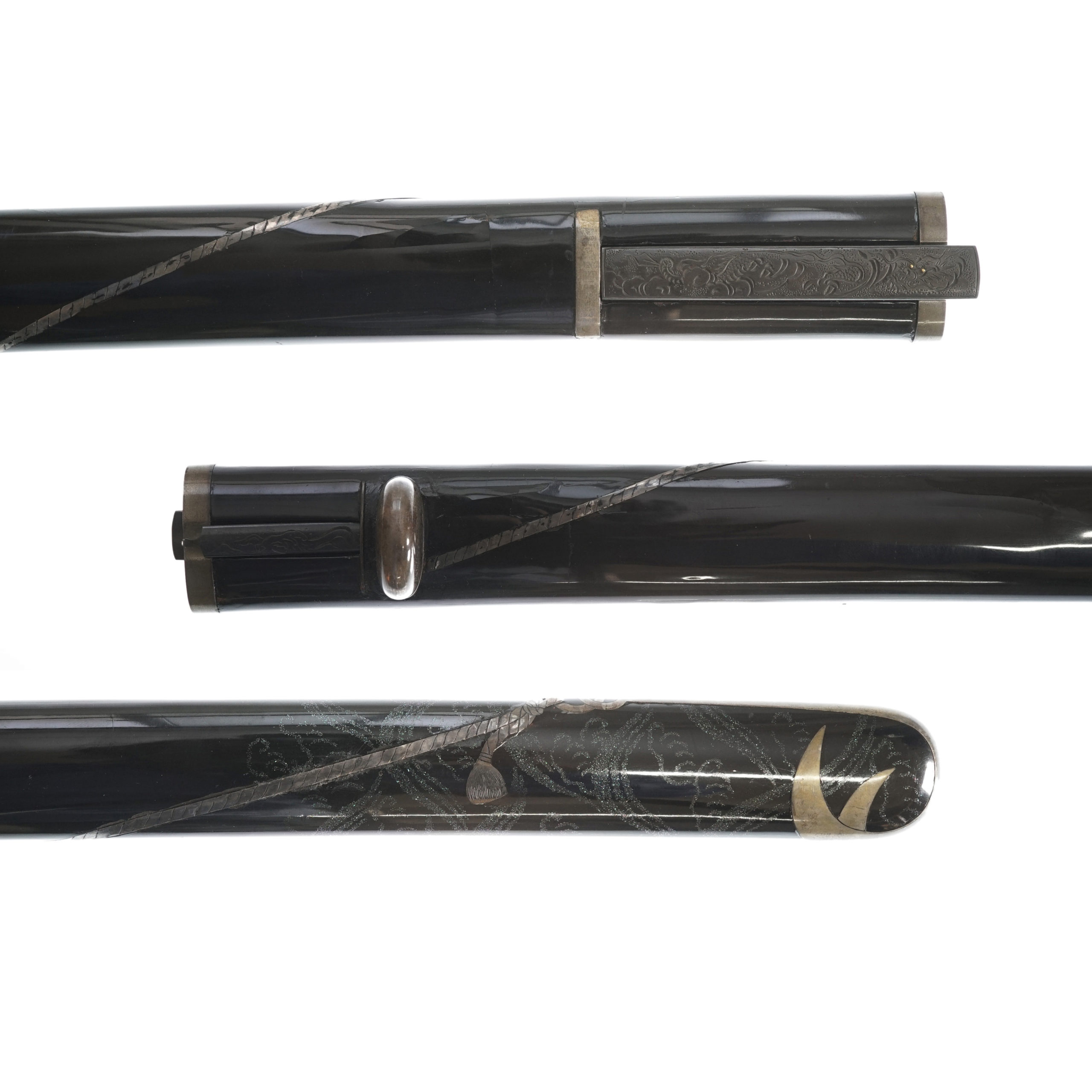 There are oyster shell/lacquer decorations called Raden on this scabbard. Its motif might have been the sea. You can see an anchor and rope on the scabbard.We believe  the artist who made this Saya thought about the scenery of a ship dropping its anchor.
