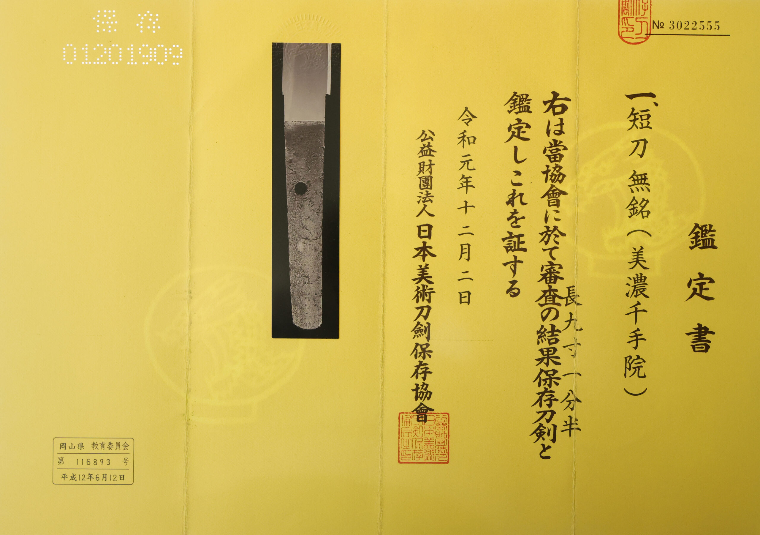 The Board of Education in Okayama prefecture issued a registration paper for this sword. It is called Jyu Hou Token Rui Tourokusho (銃砲刀剣類登録証). Bunkacho (The Agency for Cultural Affairs) acknowledges a Japanese sword with this paper as a work of art.