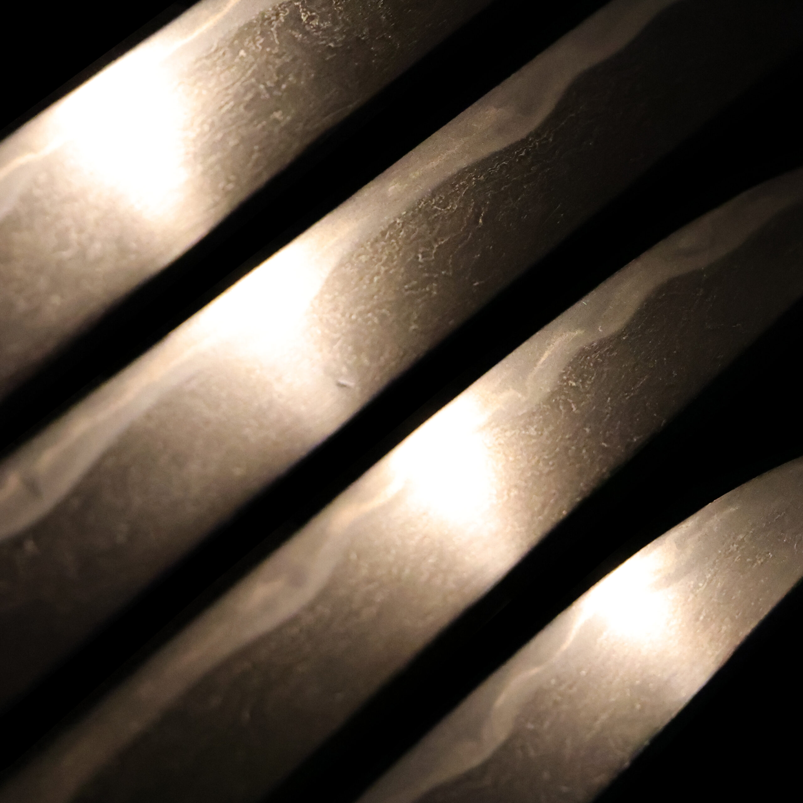 The crystalline structure which forms along the cutting edge of a blade as a result of the hardening process.