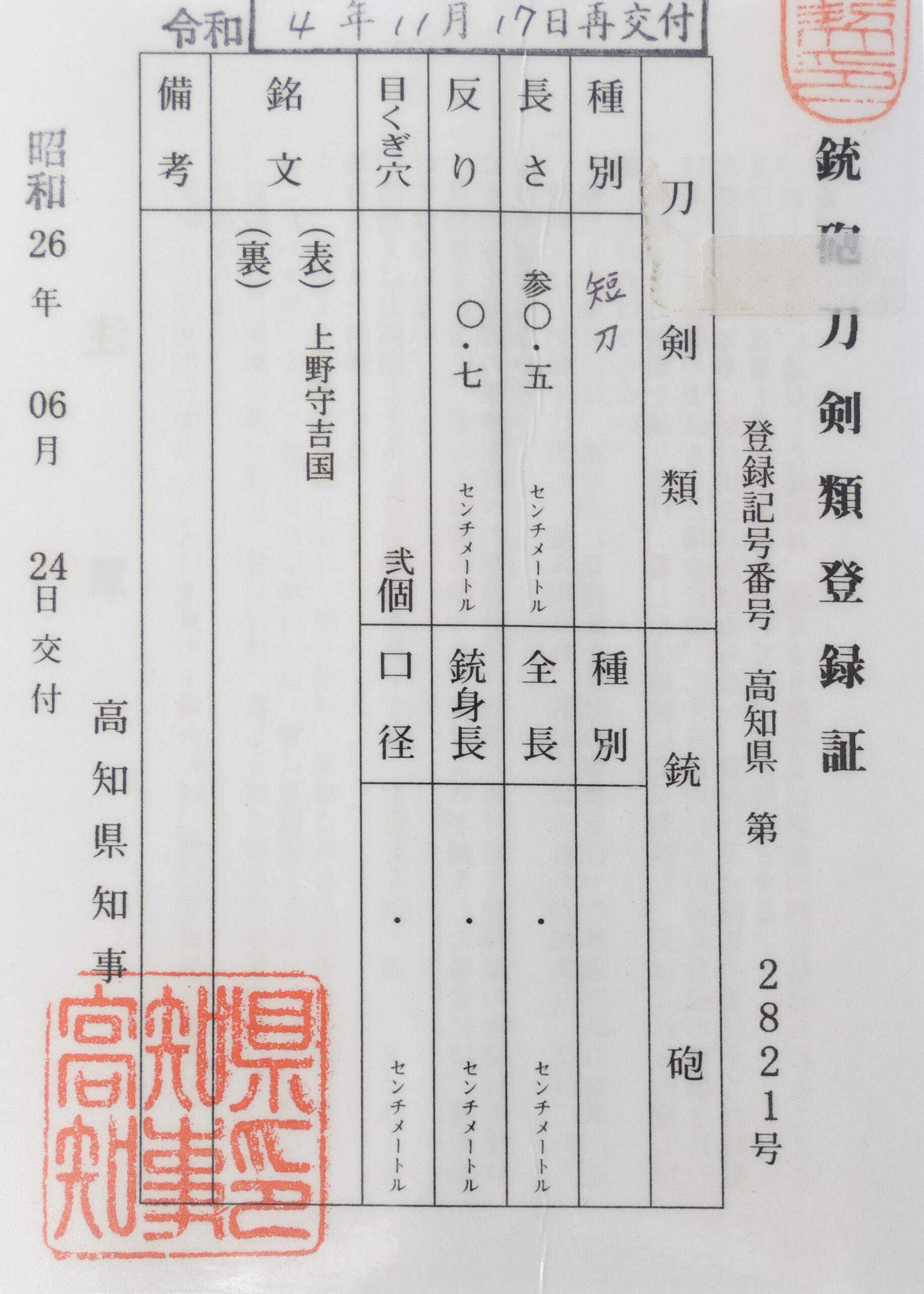 The Board of Education in Kochi prefecture issued a registration paper for this sword. It is called Jyu Hou Token Rui Tourokusho (銃砲刀剣類登録証). Bunkacho (The Agency for Cultural Affairs) acknowledges a Japanese sword with this paper as a work of art.
