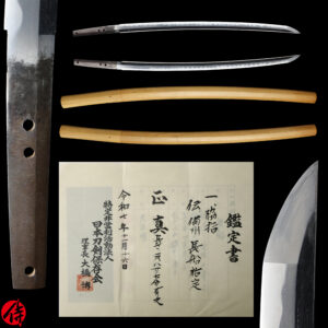 INCLUDED : NBTHK Tokubetsu Hozon Certificate, Shirasaya Case, Koshirae Mounting (Decorative Sword Mountings), Traditional Sword Carrying Case, Sword Maintenance Kit, Full Exportation Support