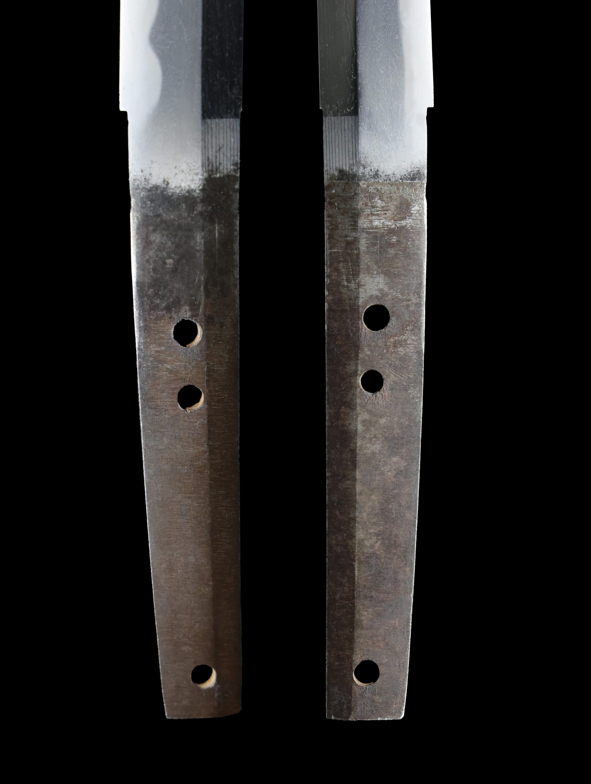 Japanese swordsmiths left the black rust on the tang because it prevents red rust while the tang is in its handle. And the discoloration of the tang was created over time, and it is a great indicator for a Japanese sword specialist to estimate when the sword was forged.
