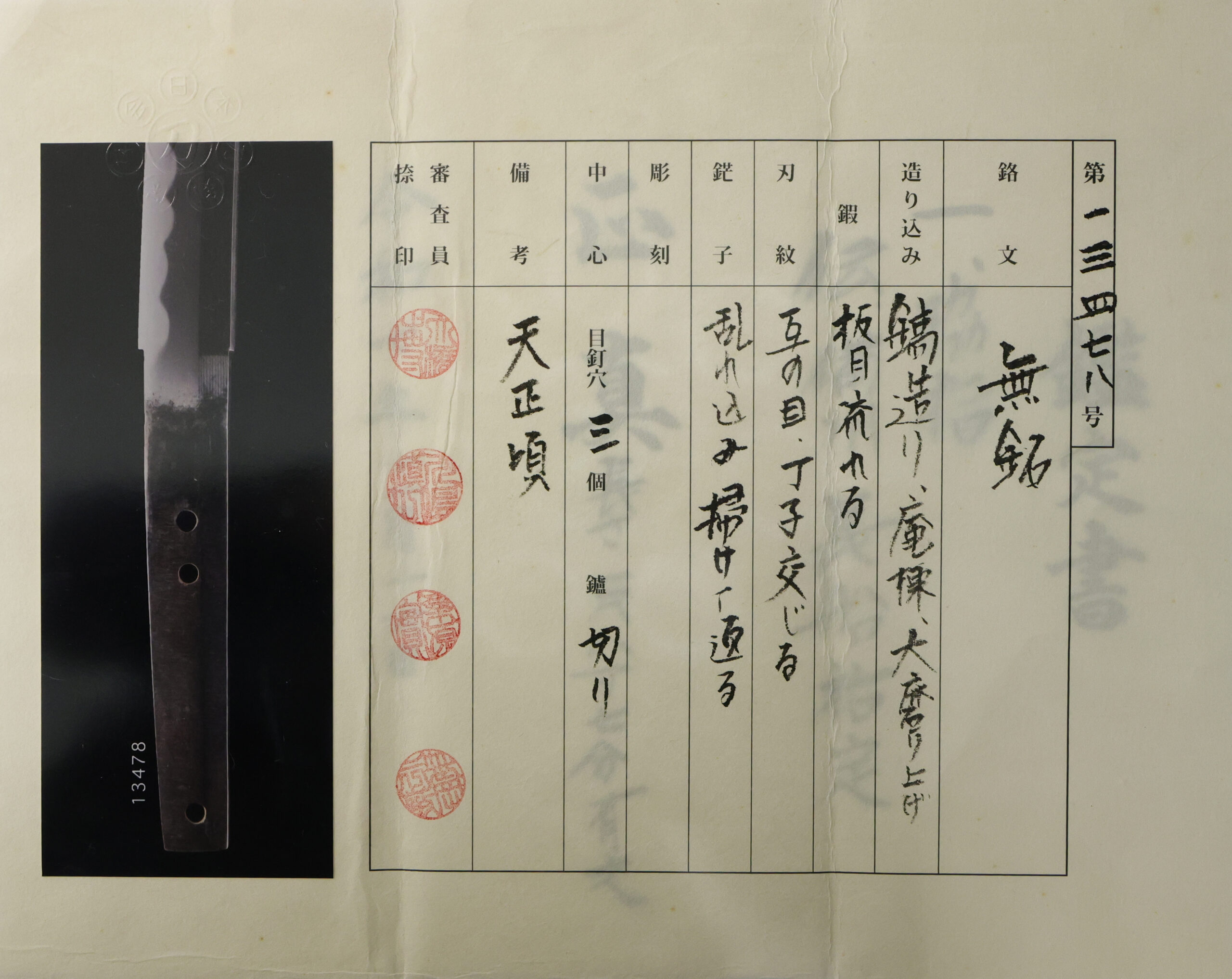 Authentication Paper: NTHK Kanteisho Certificate for the blade (No. 13478)