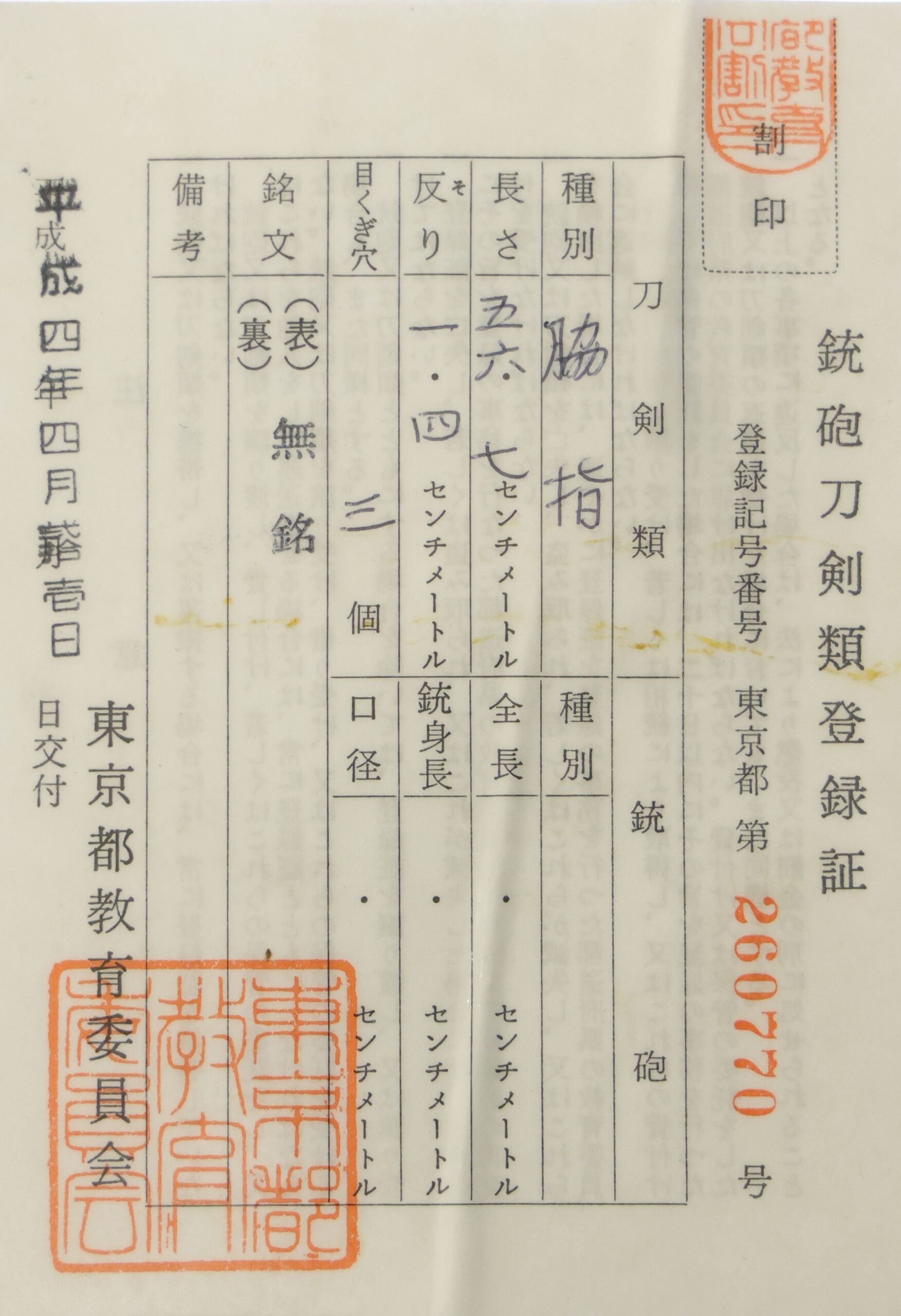 The Board of Education in Tokyo prefecture issued a registration paper for this sword. It is called Jyu Ho Token Rui Torokusho (銃砲刀剣類登録証). Bunkacho (The Agency for Cultural Affairs) acknowledges a Japanese sword with this paper as a work of art.