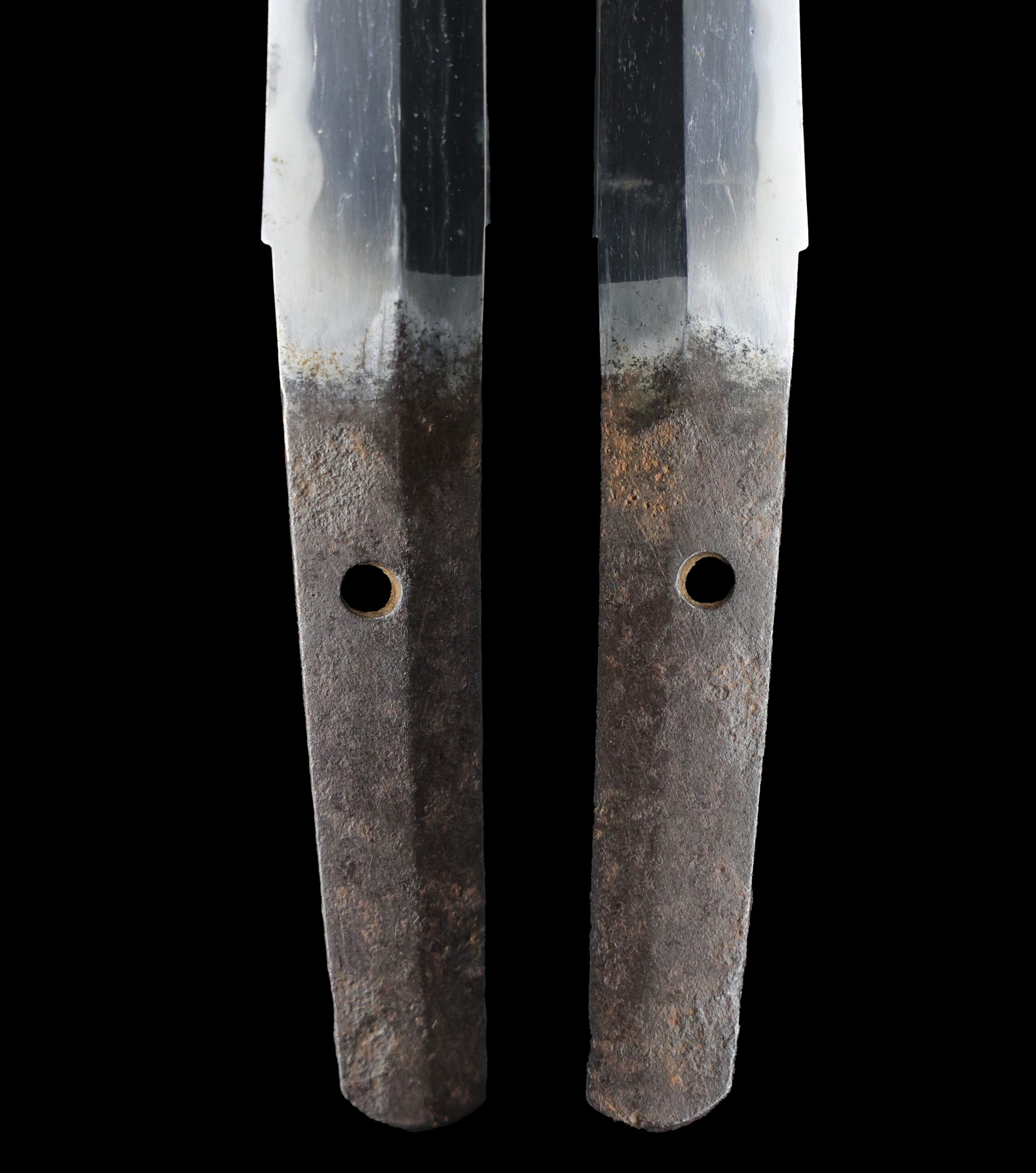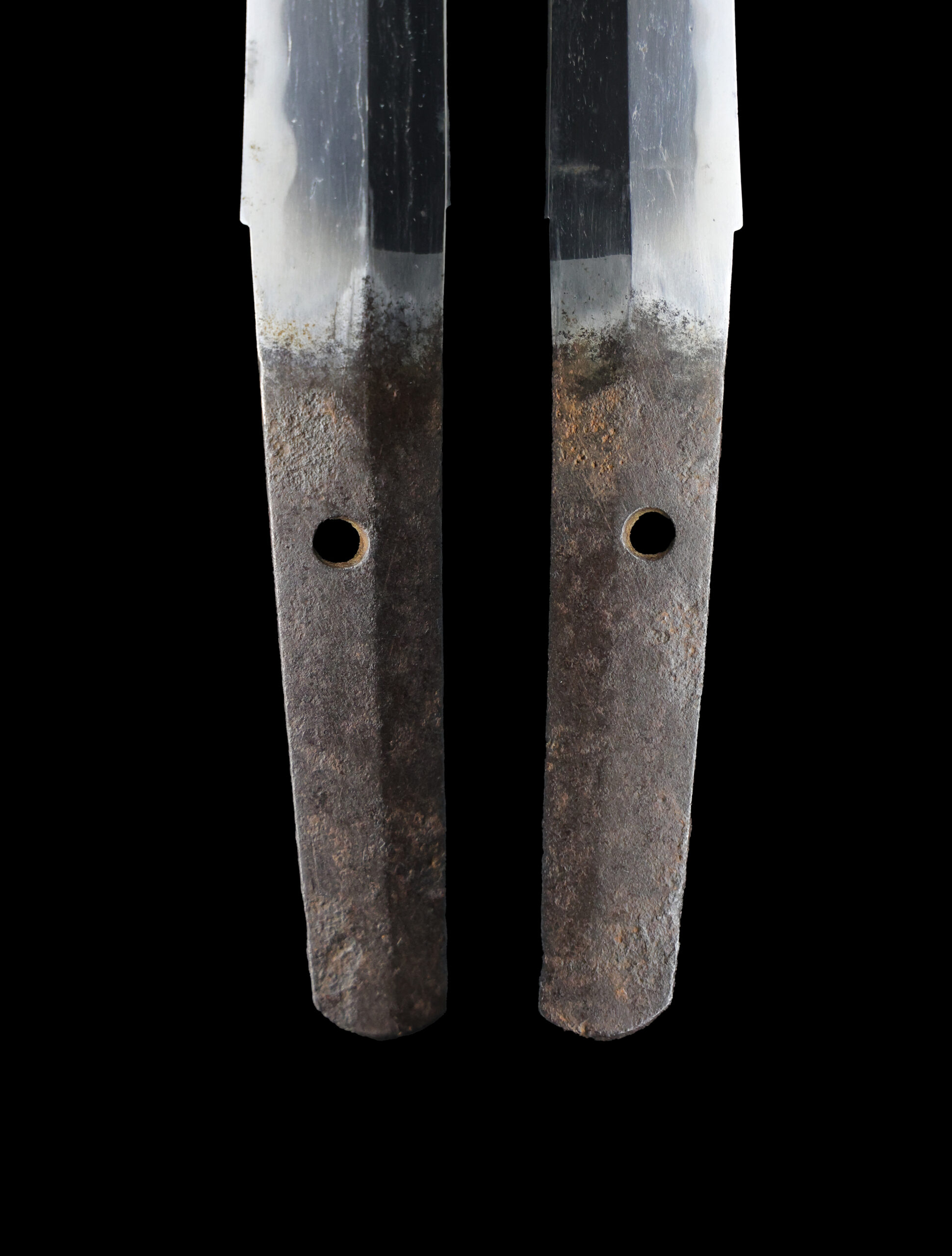Japanese swordsmiths left the black rust on the tang because it prevents red rust while the tang is in its handle. And the discoloration of the tang was created over time, and it is a great indicator for a Japanese sword specialist to estimate when the sword was forged.