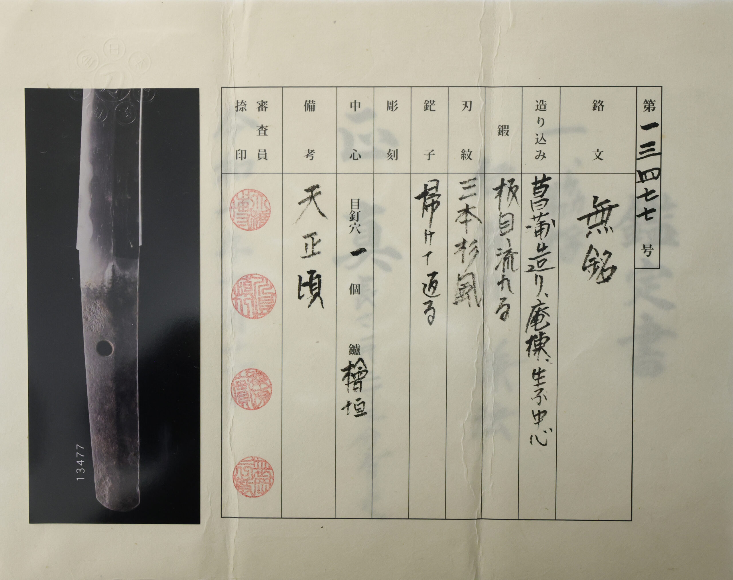 Authentication Paper: NTHK Kanteisho Certificate for the blade (No. 13477)