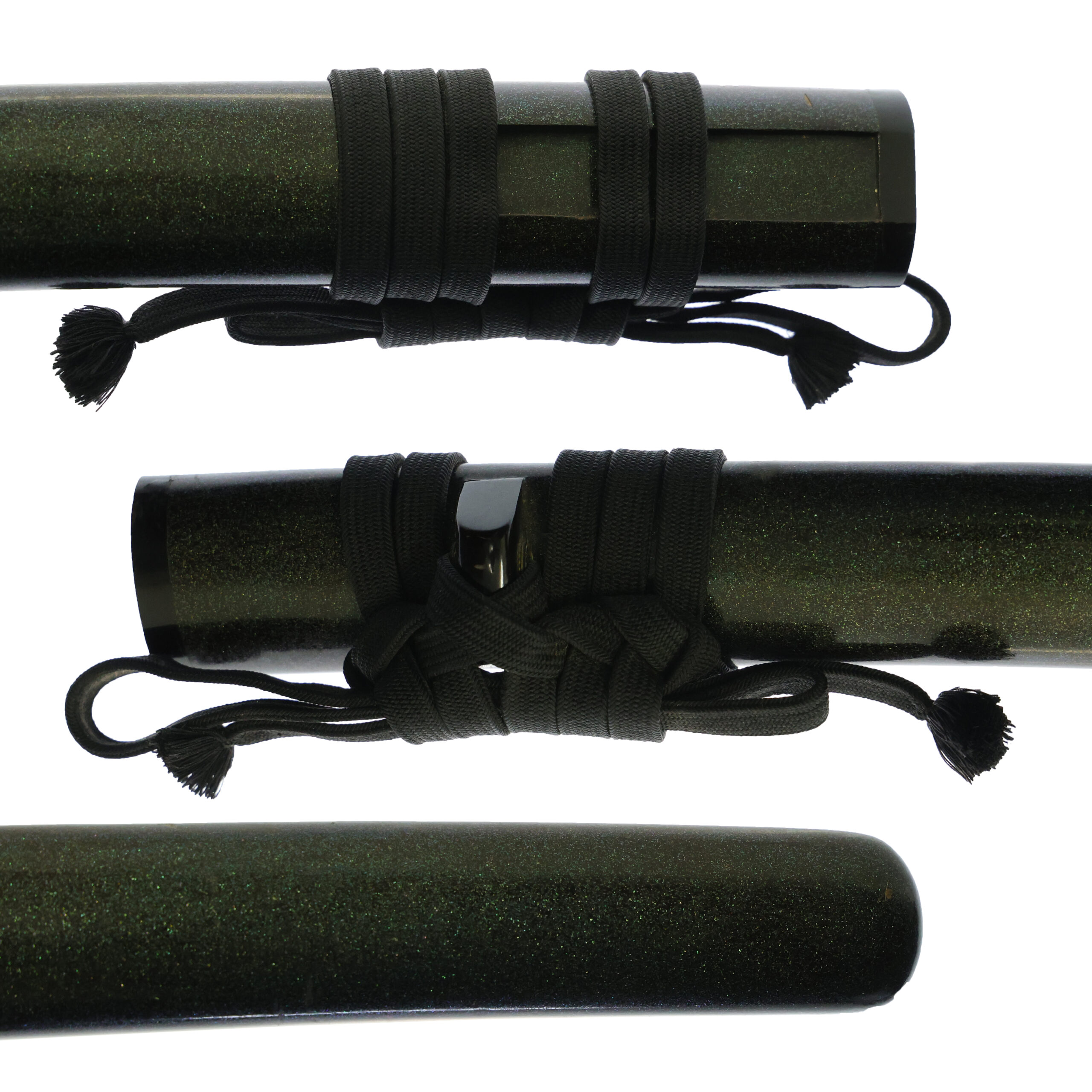 The scabbard (saya) features a refined black lacquer (黒漆, kuro-urushi) base accented with a beautiful blue-green mother-of-pearl bi-color design, creating an elegant and visually striking mounting.