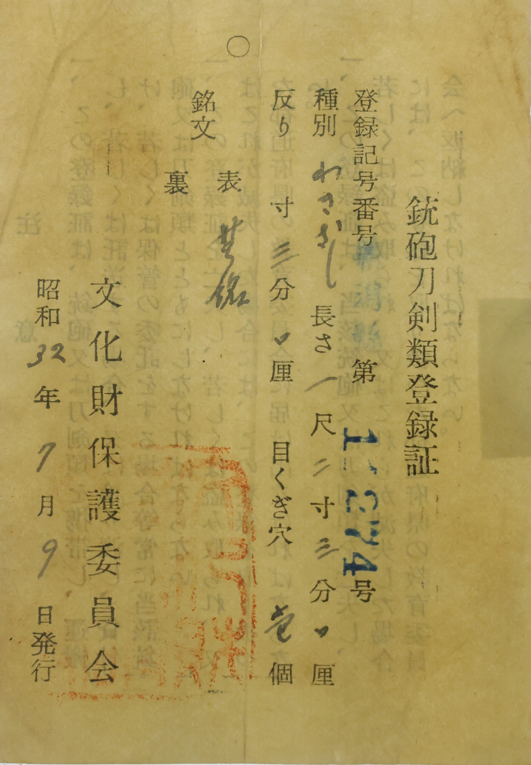 The Board of Education in Niigata prefecture issued a registration paper for this sword. It is called Jyu Hou Touken Rui Torokusho (銃砲刀剣類登録証). Bunkacho (The Agency for Cultural Affairs) acknowledges a Japanese sword with this paper as a work of art.