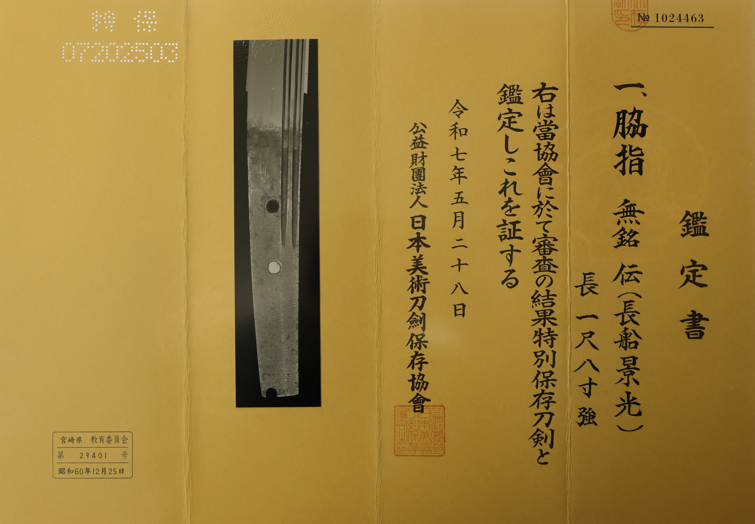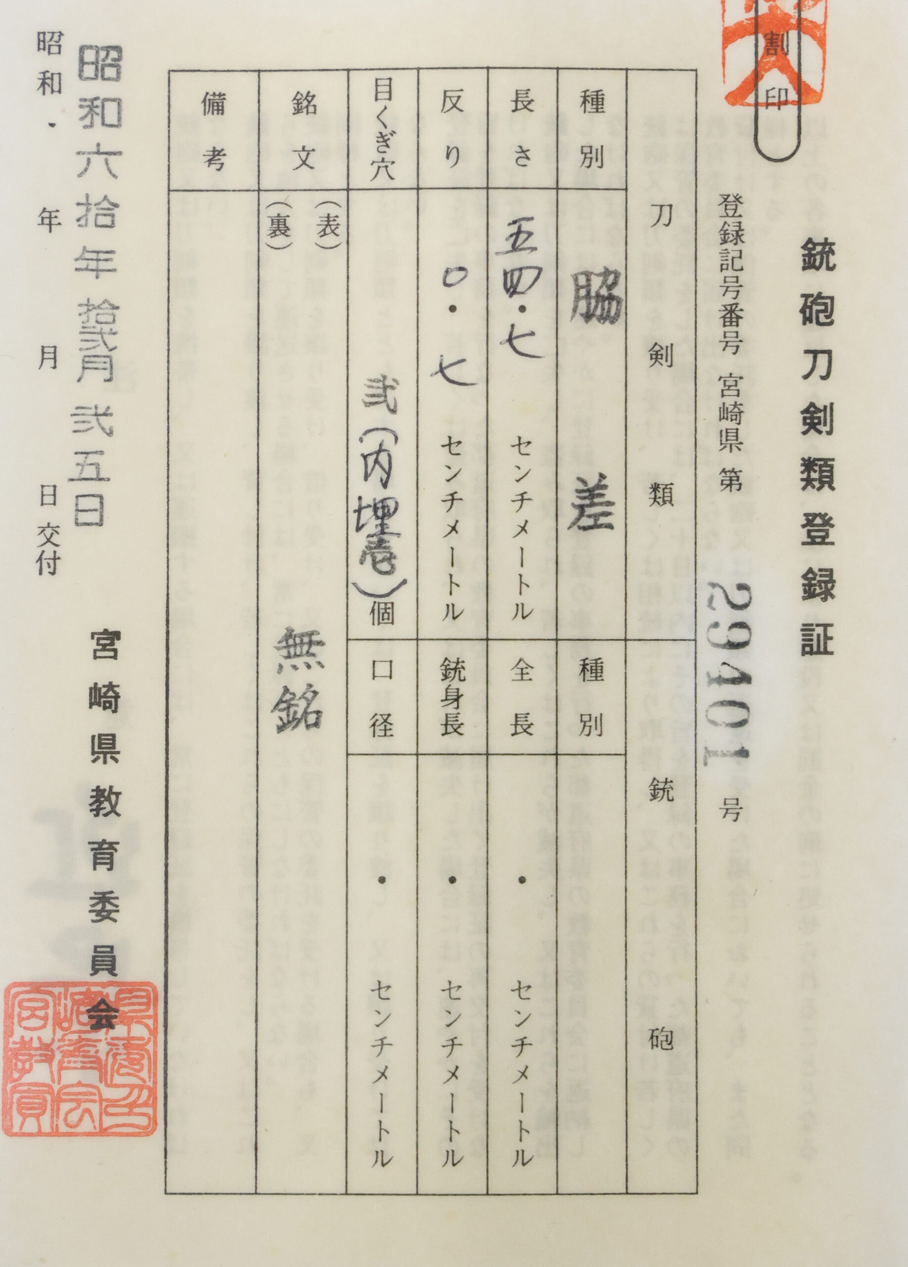 The Board of Education in Miyazaki prefecture issued a registration paper for this sword. It is called Jyu Token Rui Torokusho(銃刀剣類登録証). Bunkacho(The Agency for Cultural Affairs) acknowledges a Japanese sword with this paper as a work of art.