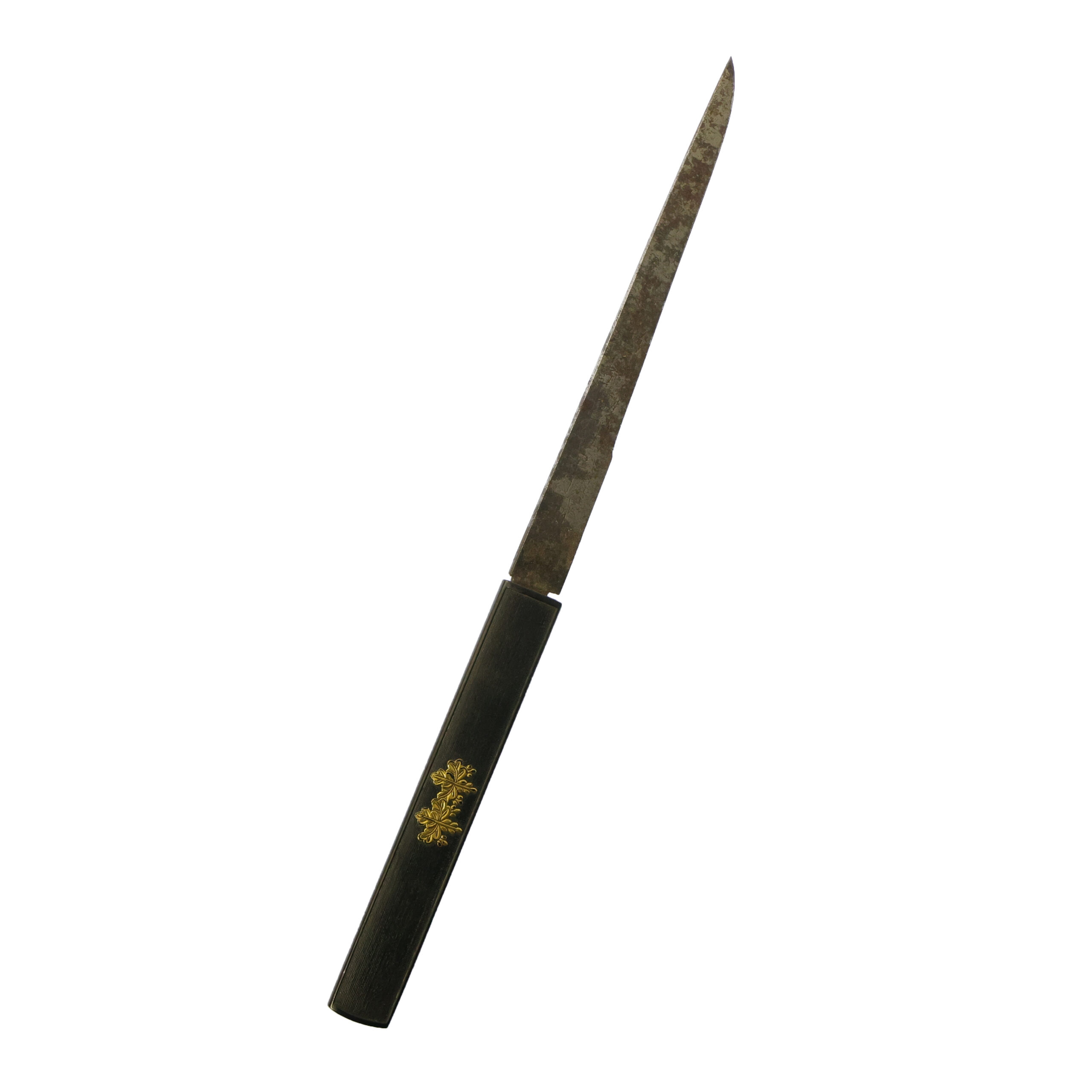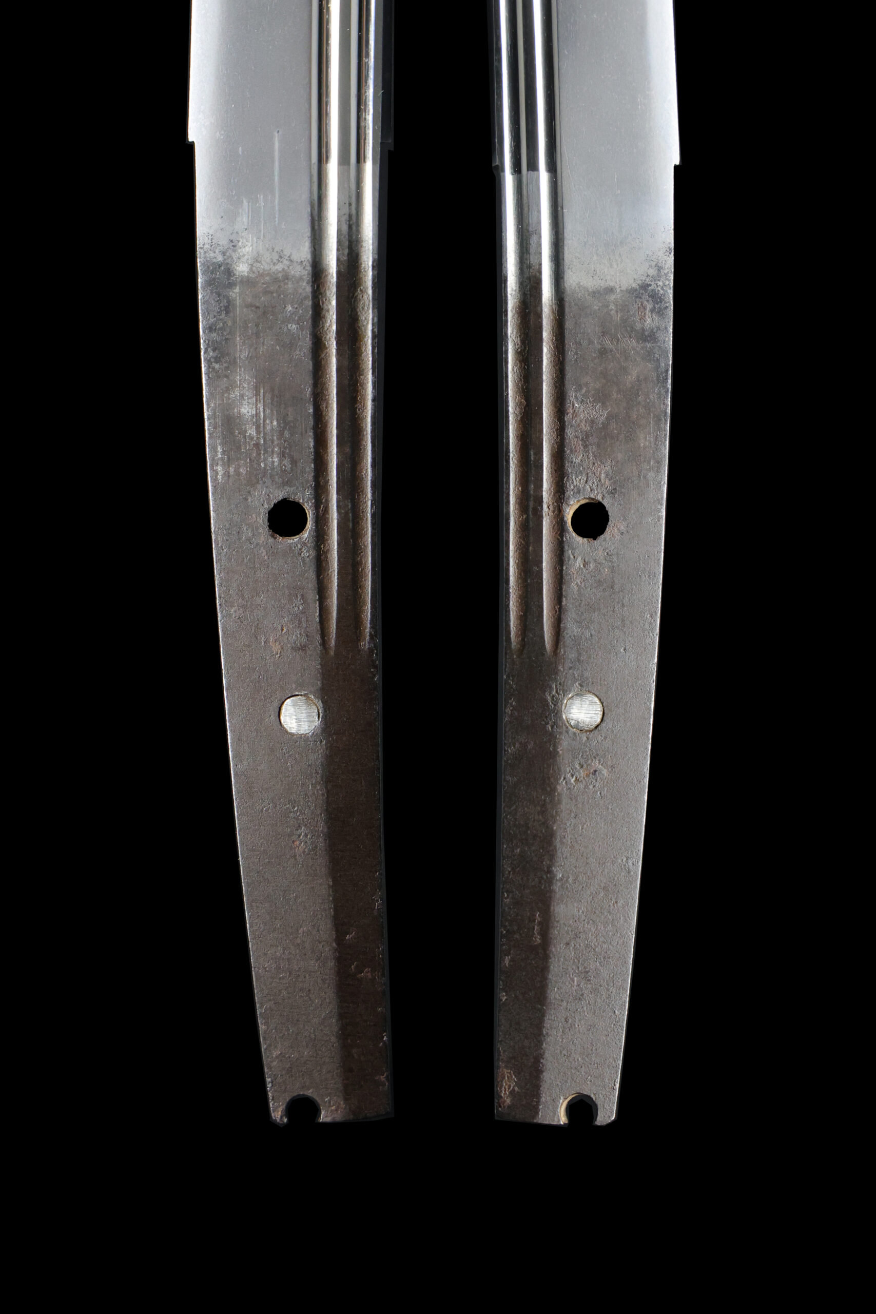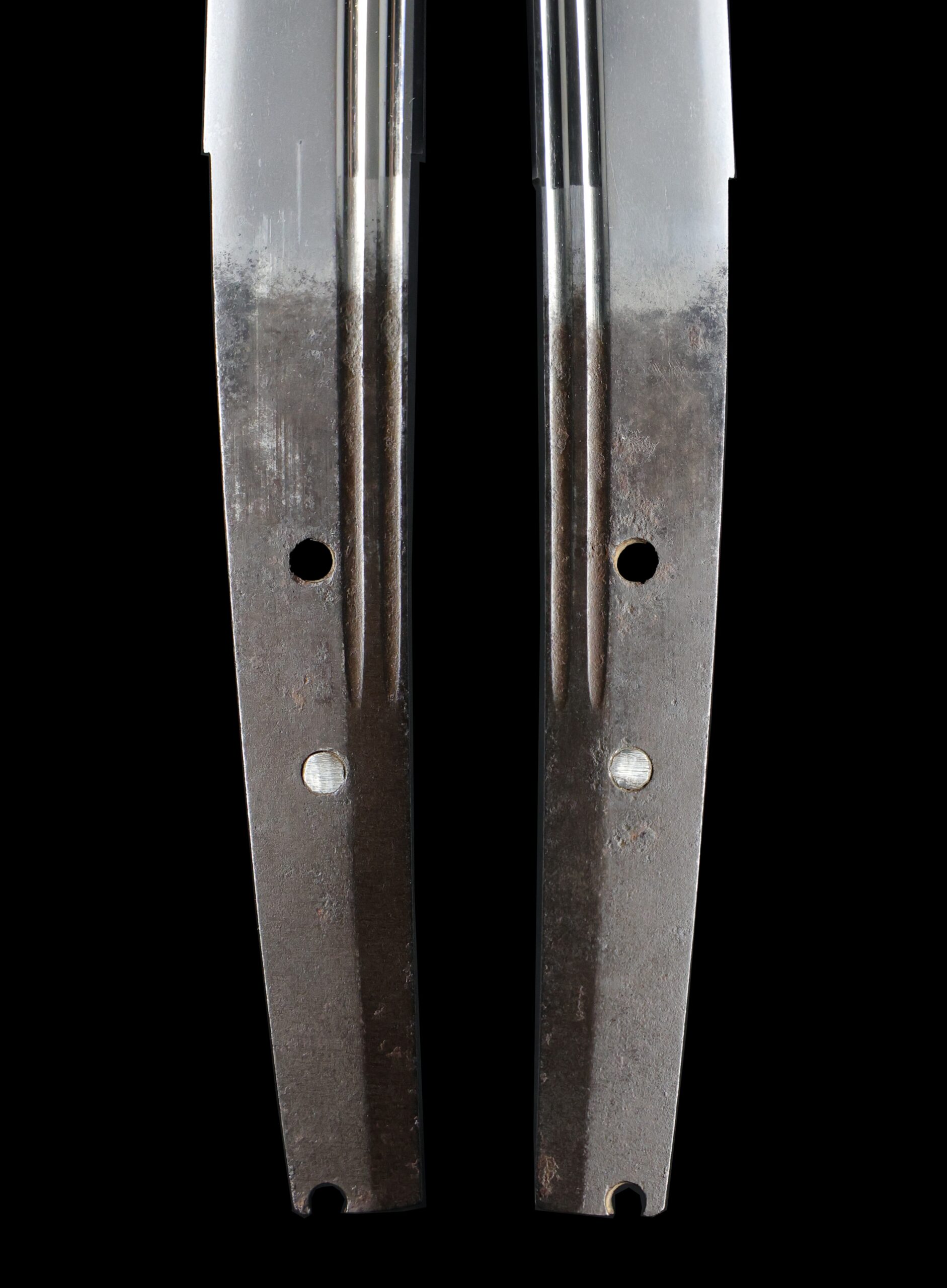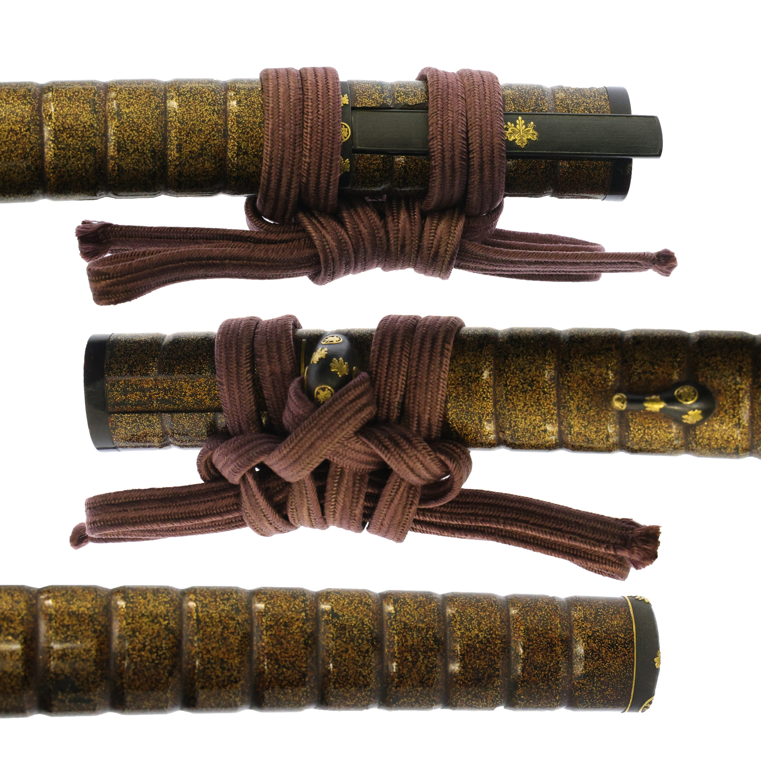 This surface of this saya(scabbard) is decorated with evenly spaced notched patterns running around its circumference, resembling the style of an inrō (印籠, a traditional Japanese case for carrying small objects). This type of scabbard is classified as inrō-kizami-zaya (印籠刻鞘).