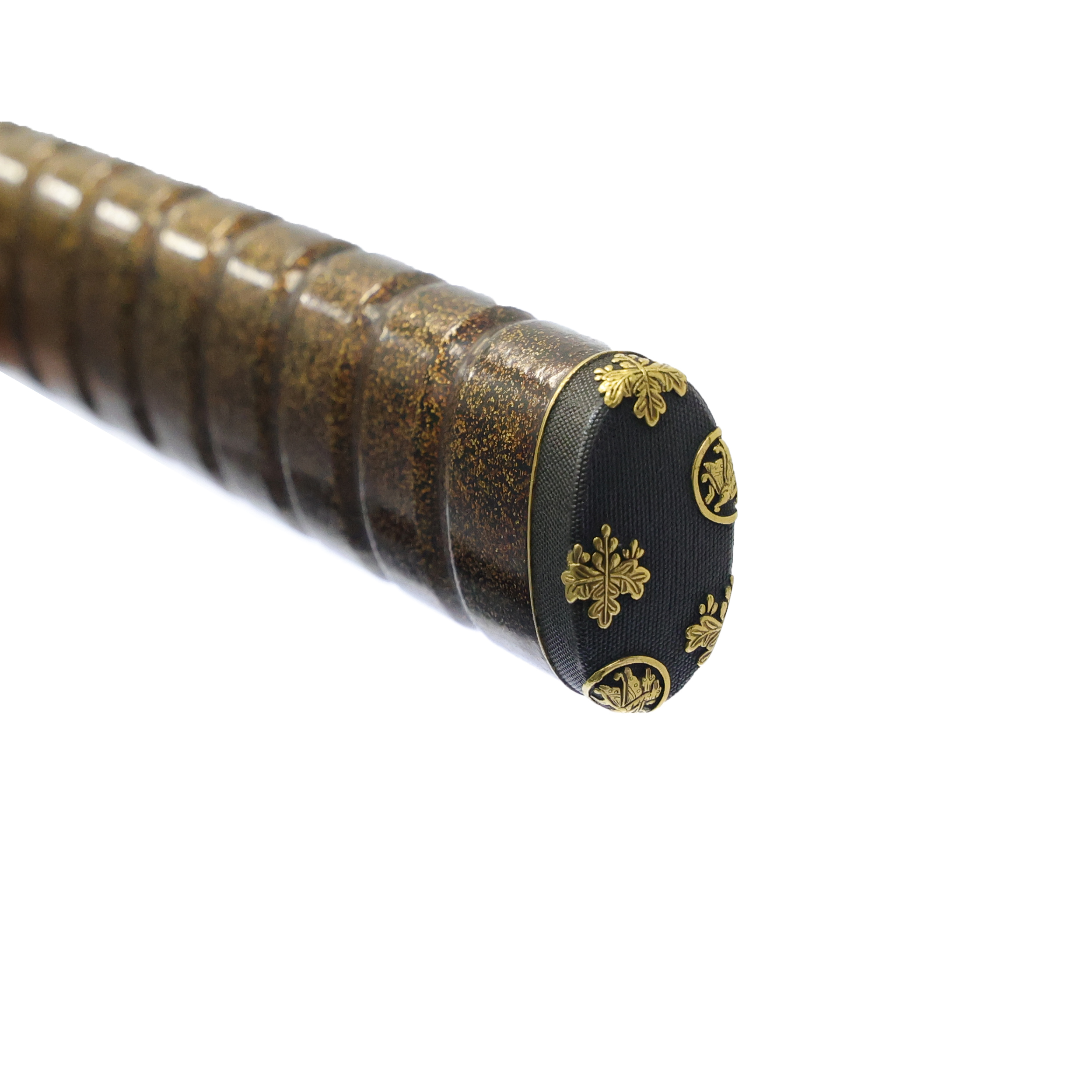 The fuchi-kashira is also decorated with the Go-san no Kiri (五三の桐) crest, accompanied by a butterfly (蝶) motif.