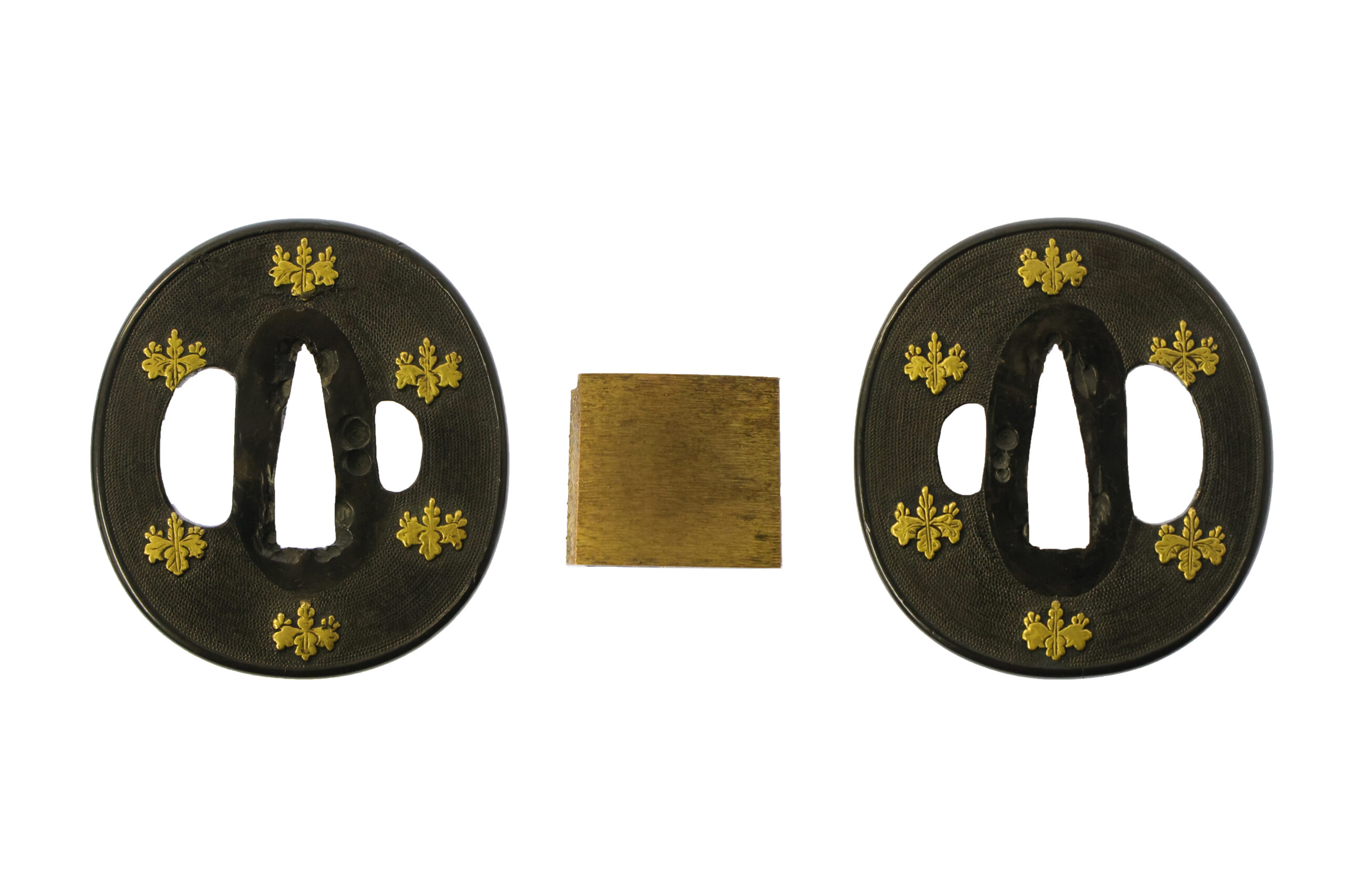 Both designs are rendered in fine detail using the gold inlay technique (象嵌, zōgan), which adds elegance and visual contrast to the fittings.