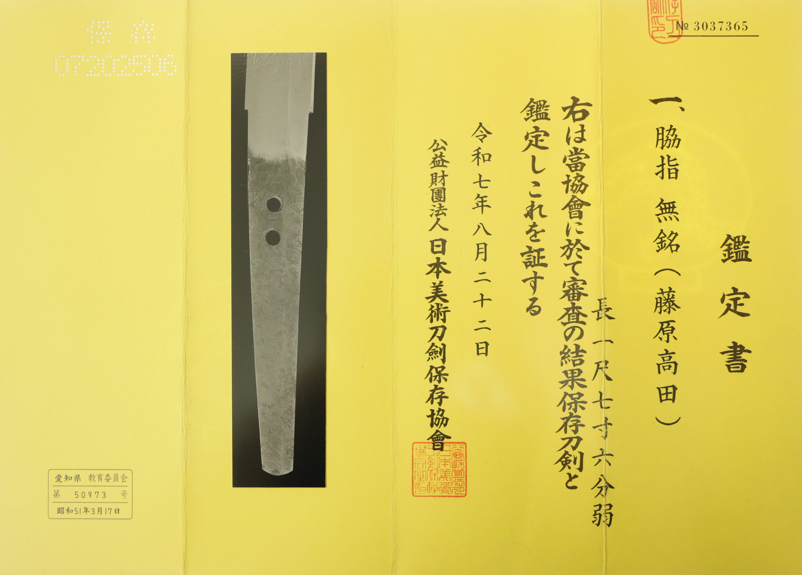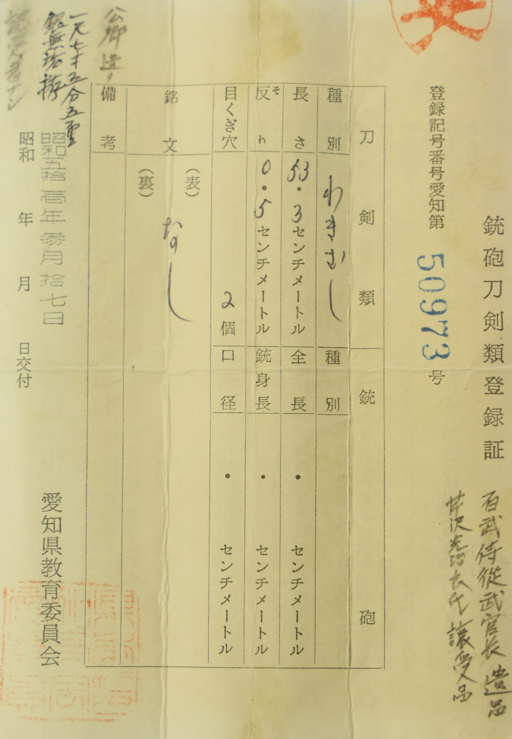The Board of Education in Aichi prefecture issued a registration paper for this sword. It is called Jyu Ho Token Rui Torokusho (銃砲刀剣類登録証). Bunkacho (The Agency for Cultural Affairs) acknowledges a Japanese sword with this paper as a work of art.