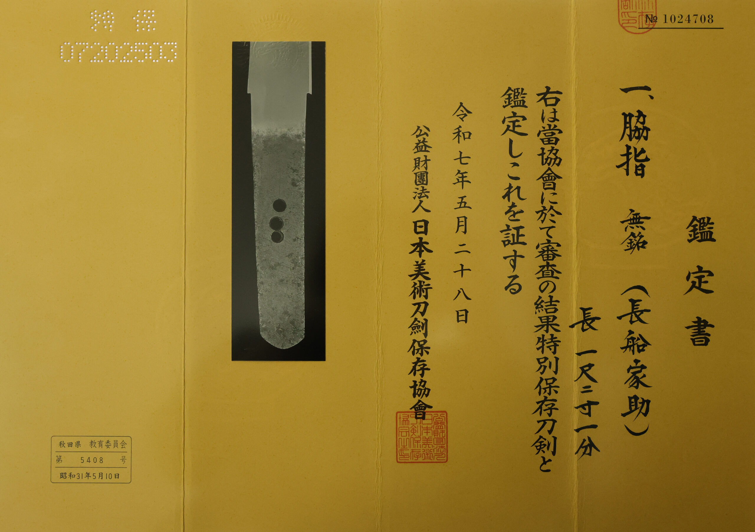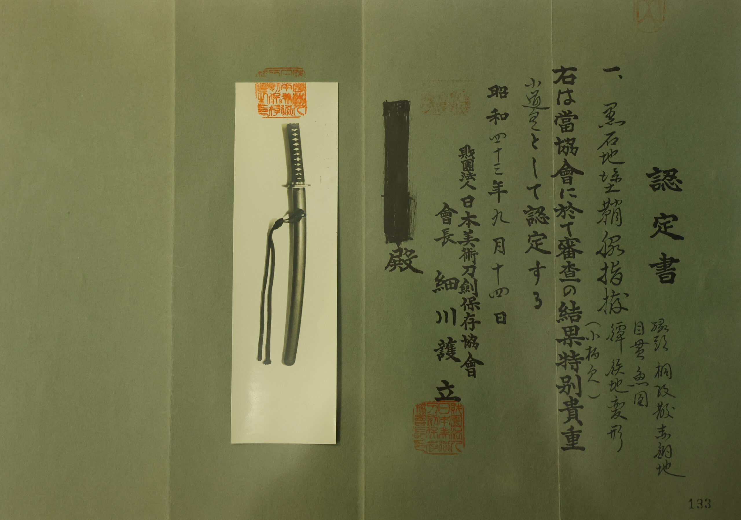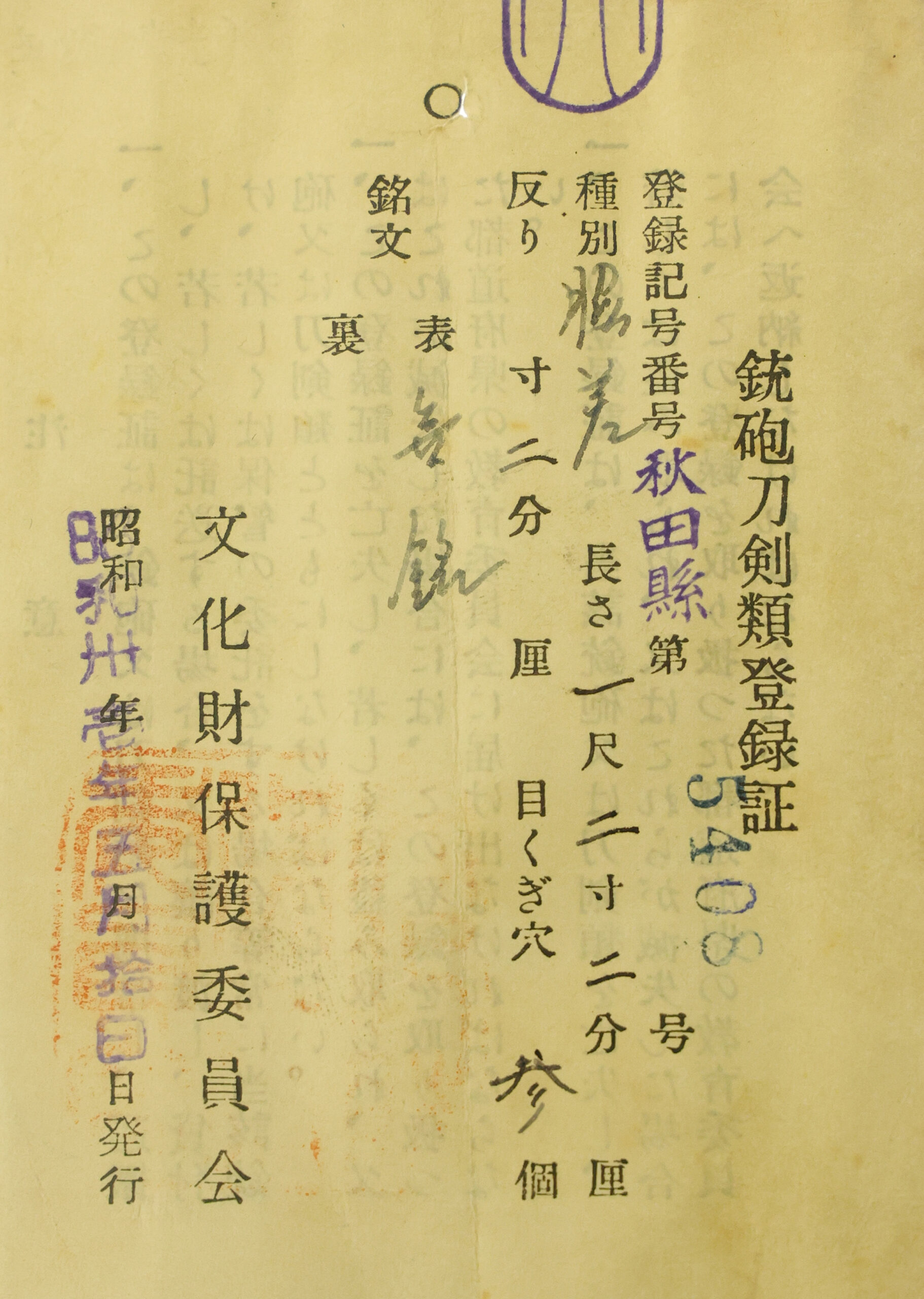 The Board of Education in Akita prefecture issued a registration paper for this sword. It is called Jyu Token Rui Torokusho (銃刀剣類登録証). Bunkacho (The Agency for Cultural Affairs) acknowledges a Japanese sword with this paper as a work of art.