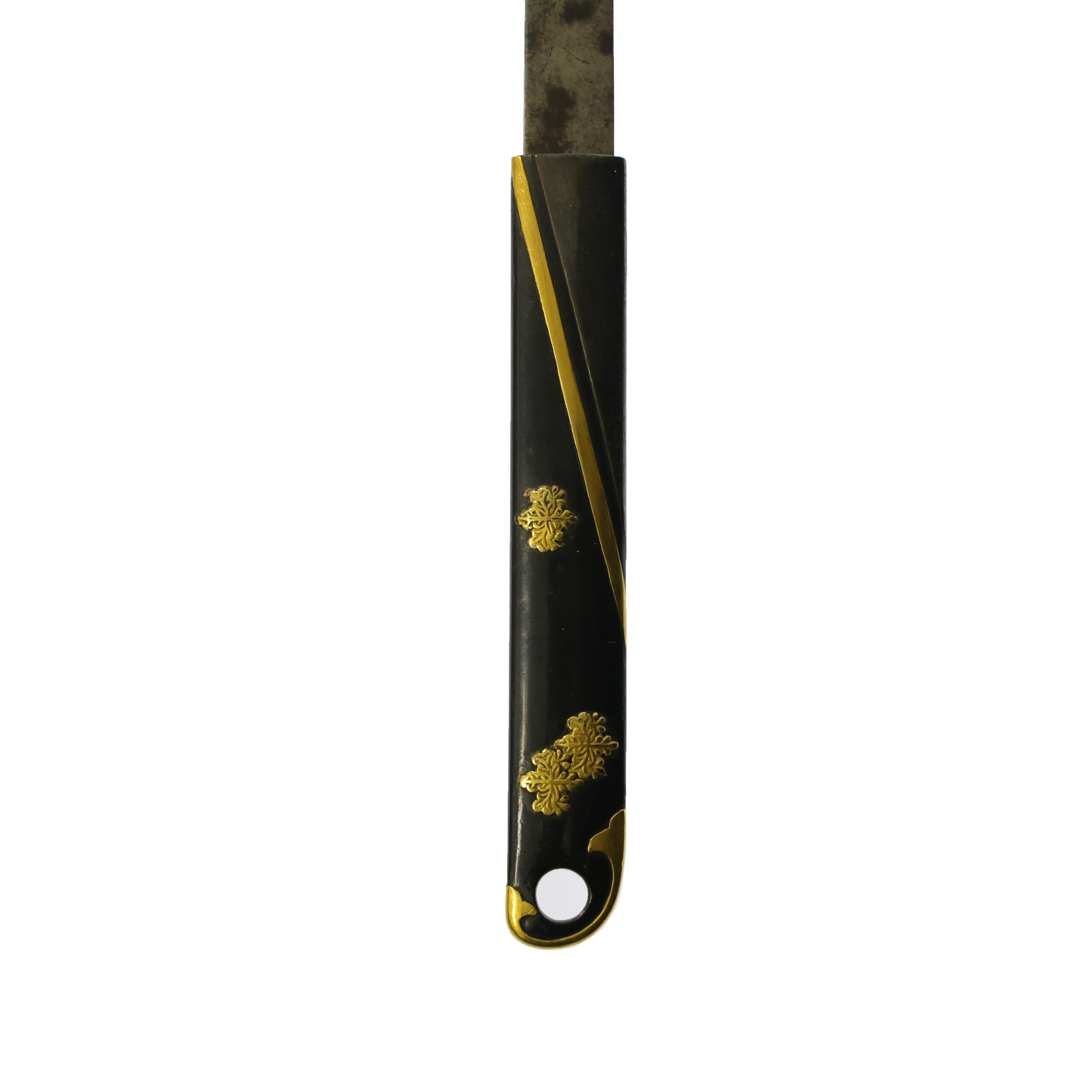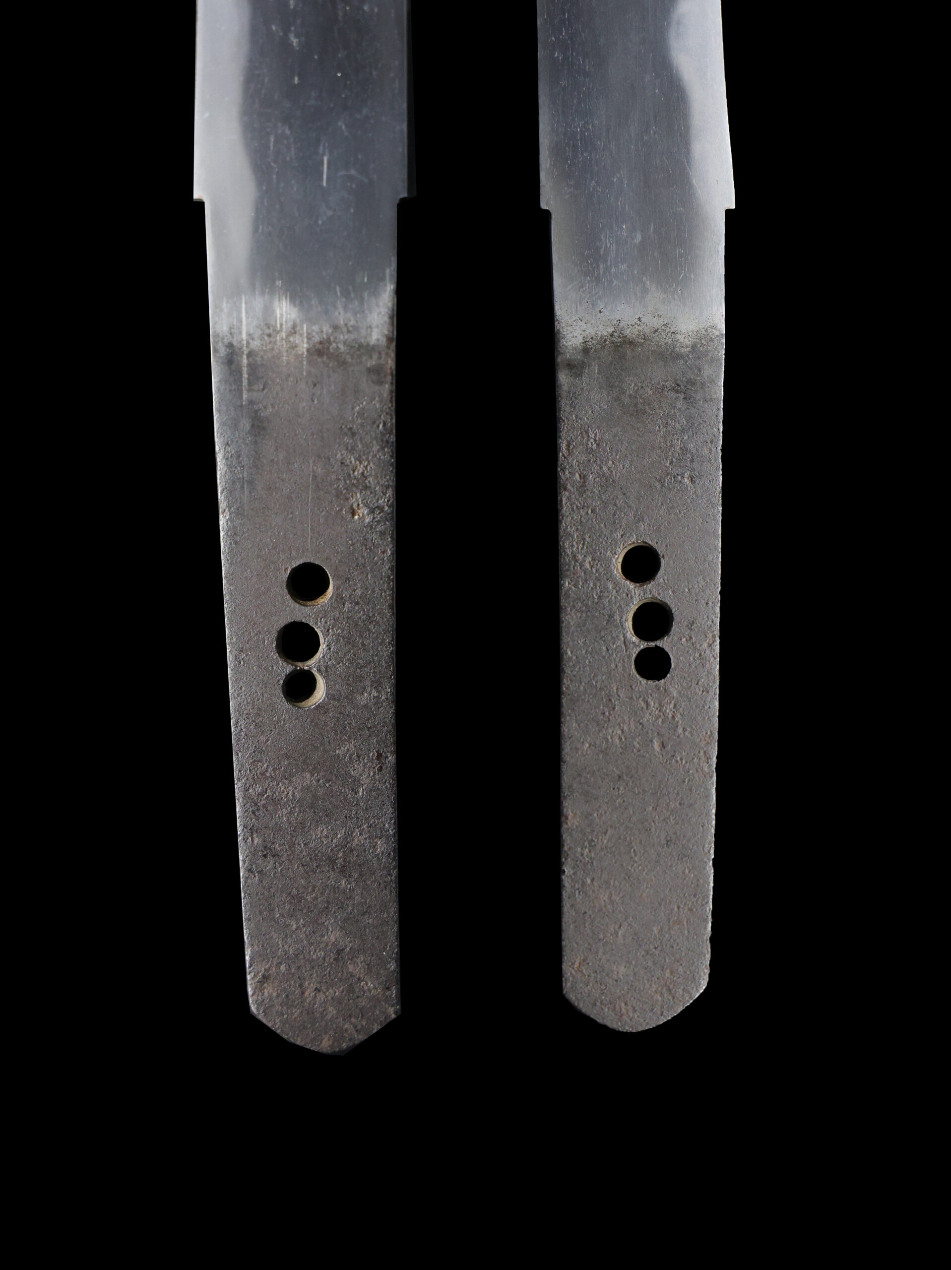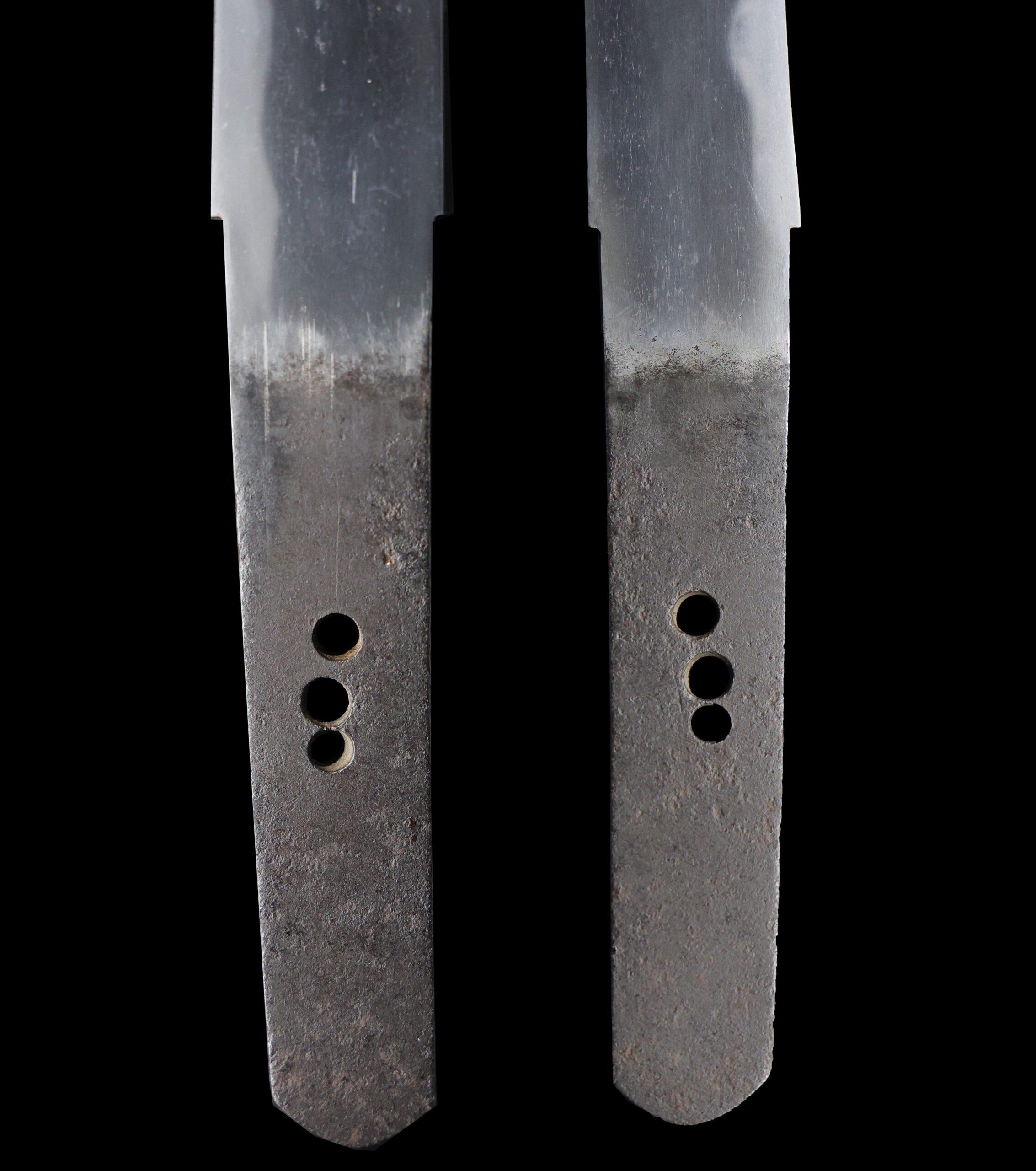 Japanese swordsmiths left the black rust on the tang because it prevents red rust while the tang is in its handle. And the discoloration of the tang was created over time, and it is a great indicator for a Japanese sword specialist to estimate when the sword was forged.