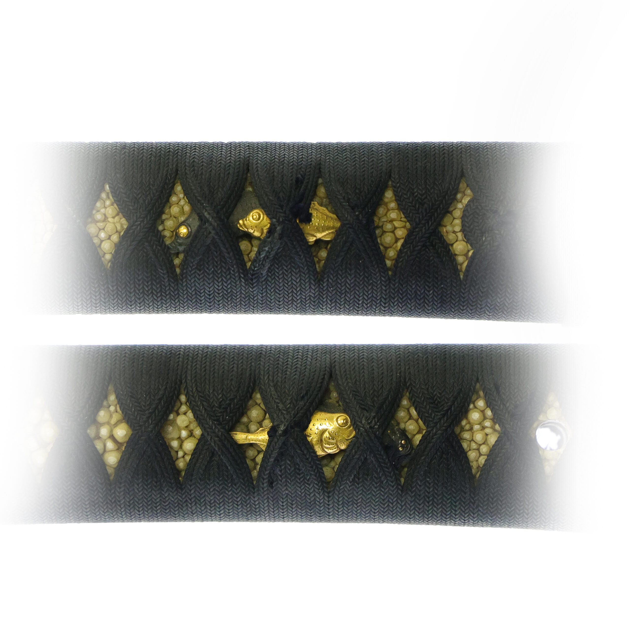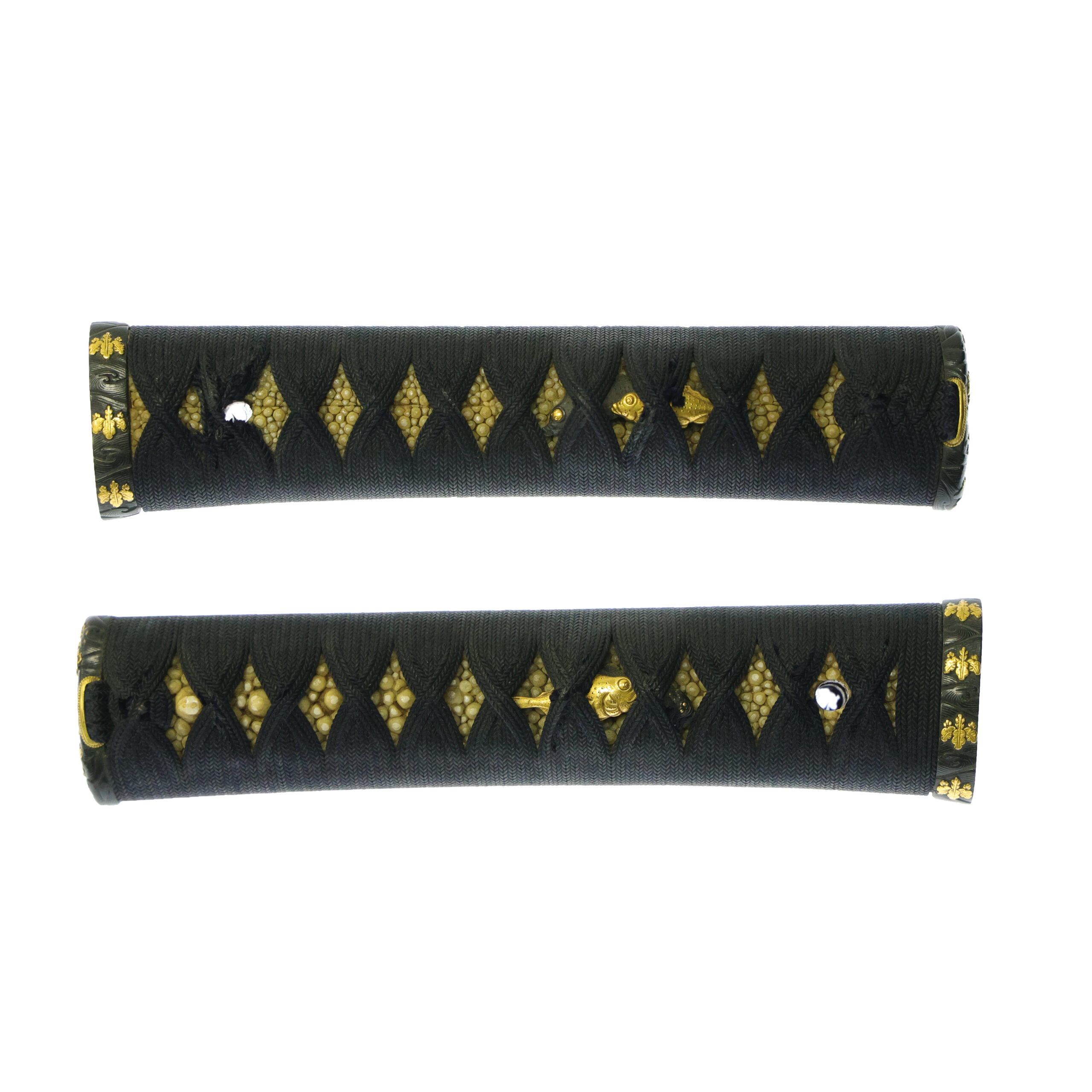 Tsuka and Menuki: Tsuka is the handle of the Japanese sword and Menuki is its decoration.