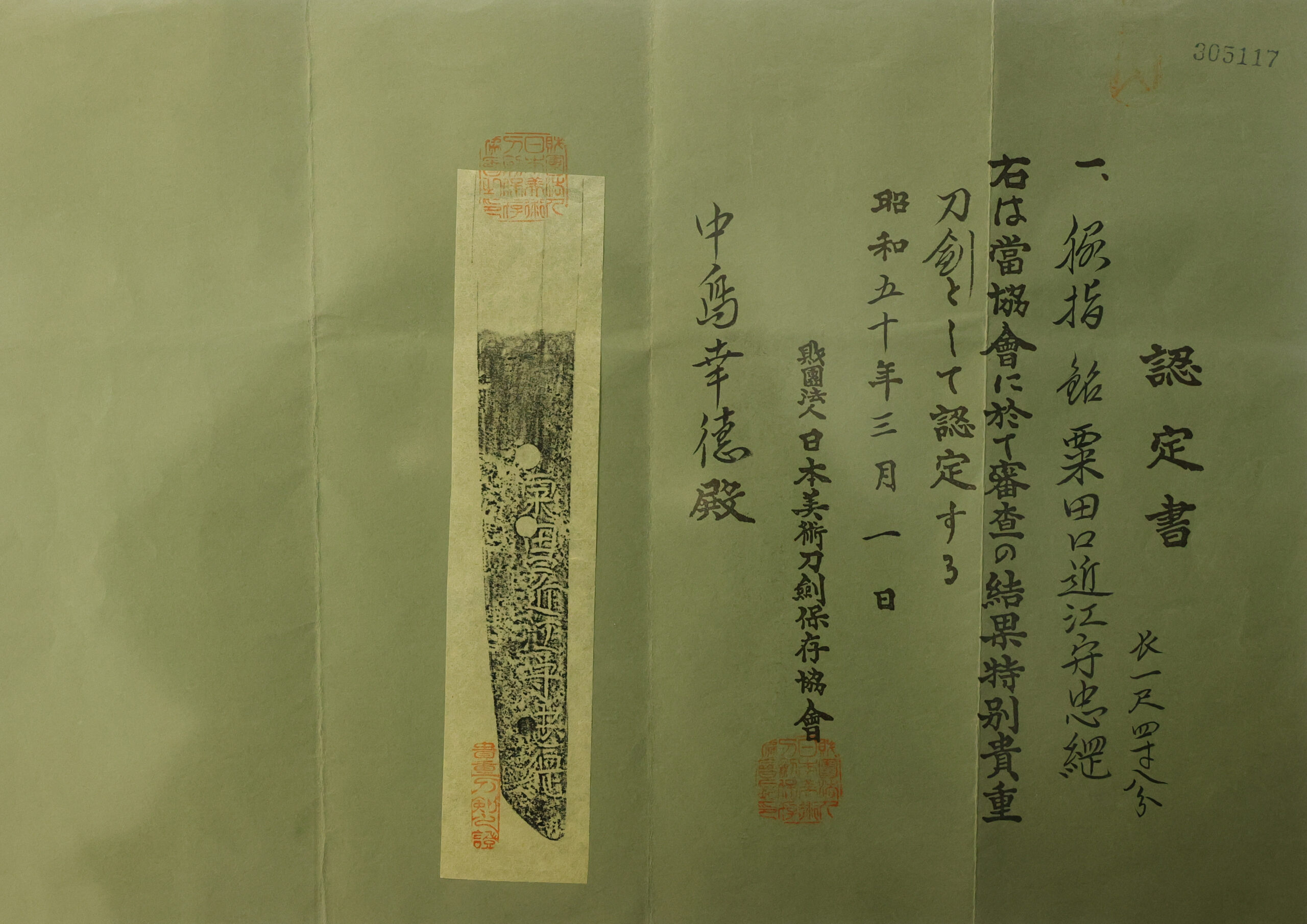 Authentication Paper:NBTHK Tokubetsu Kicho Certificate for the blade (No. 305117)