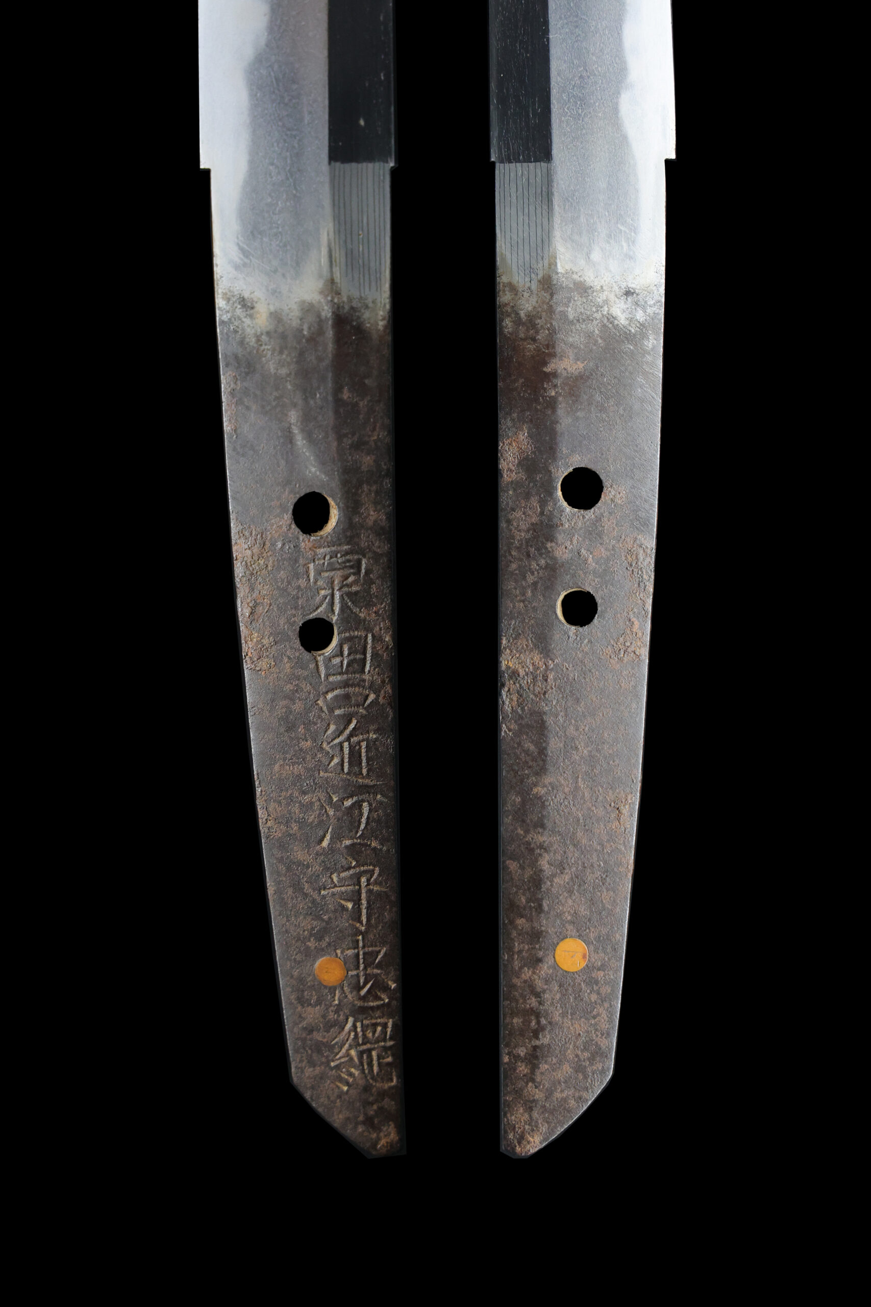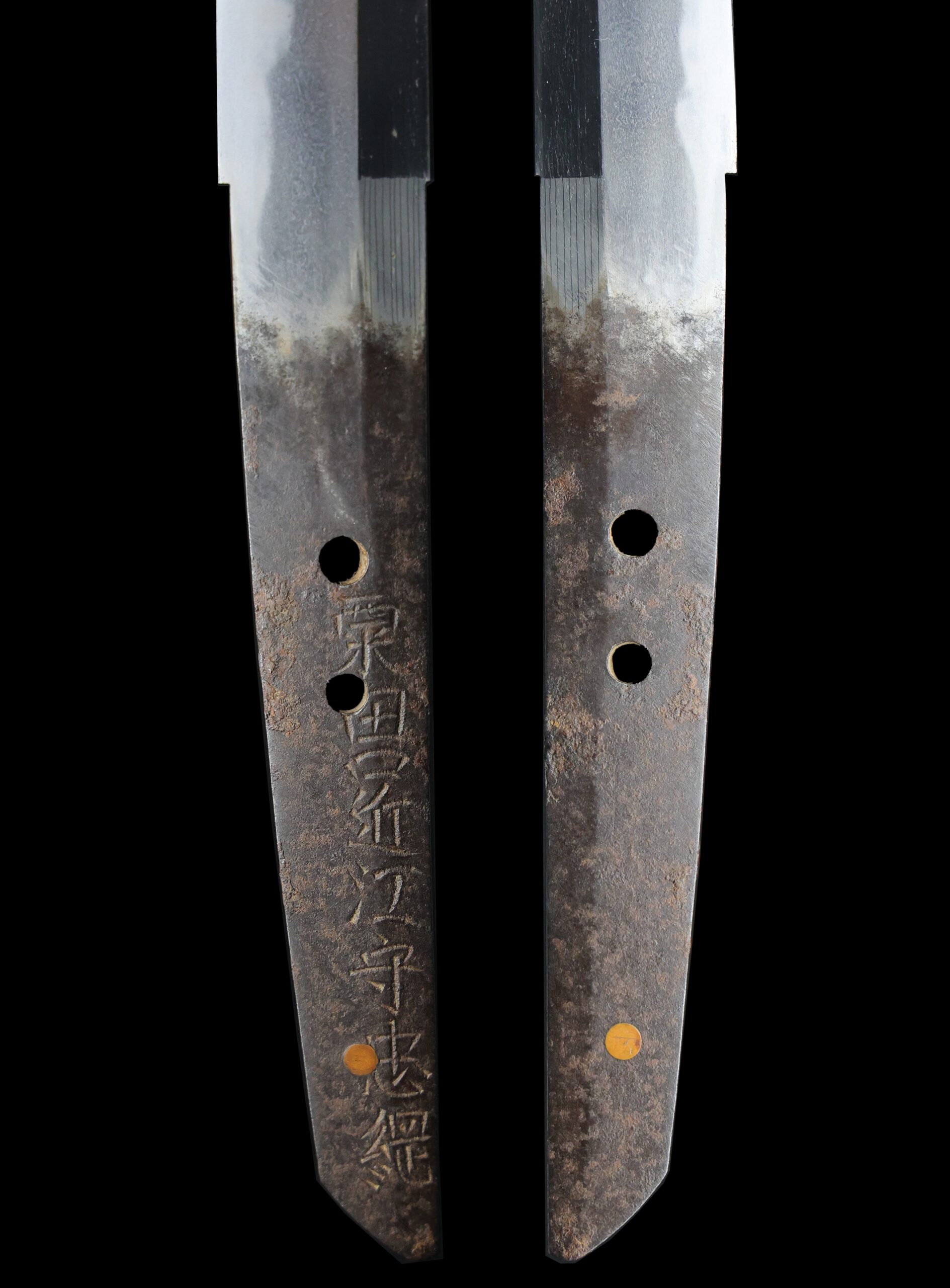 Japanese swordsmiths left the black rust on the tang because it prevents red rust while the tang is in its handle. And the discoloration of the tang was created over time, and it is a great indicator for a Japanese sword specialist to estimate when the sword was forged.