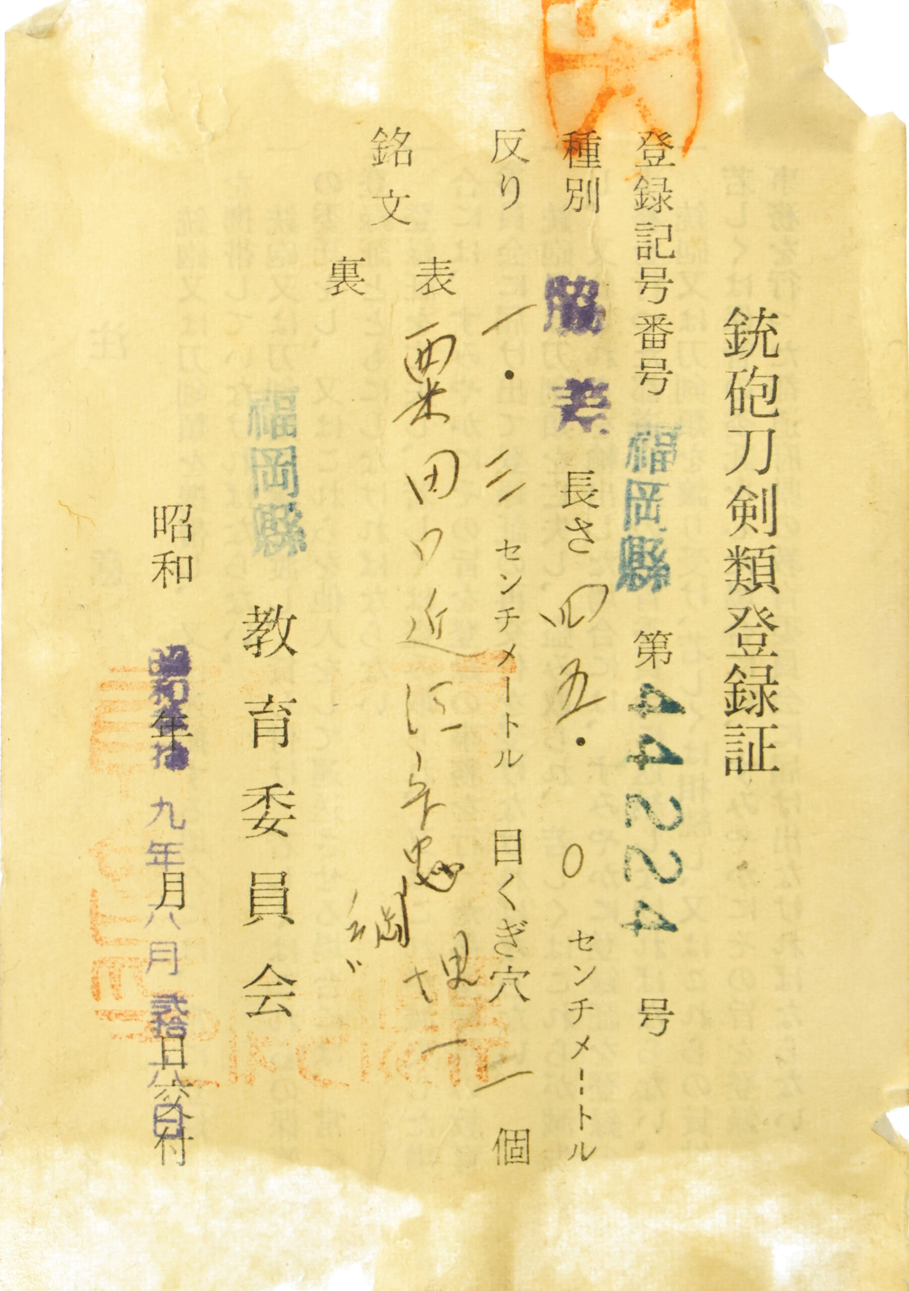 The Board of Education in Fukuoka prefecture issued a registration paper for this sword. It is called Jyu Ho Token Rui Torokusho (銃砲刀剣類登録証). Bunkacho (The Agency for Cultural Affairs) acknowledges a Japanese sword with this paper as a work of art.