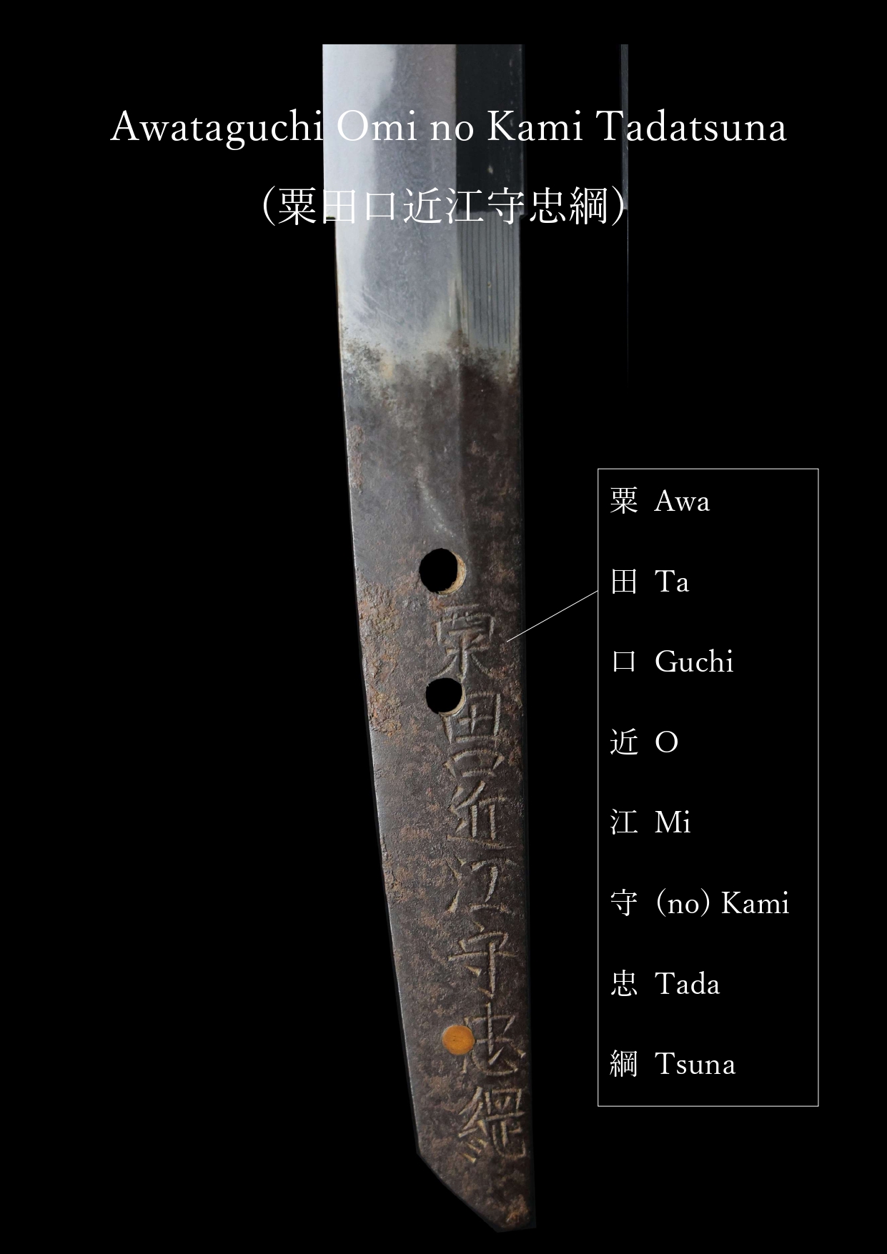 This blade was signed by Awataguchi Omi no Kami Tadatsuna (粟田口近江守忠綱). The maker’s name Tadatsuna lasted a few generations, and we assume it was forged by the second-gen, judging from the characteristic of the signature on the tang. The second-gen Tadatsuna was active in the early Edo period (Late 17th century), and he is one of Osaka’s most skilled and popular swordsmiths in the early Edo period, following Tsuda Sukehiro and Inoue Shinkai. These three sword makers are called Sanketsu of Osaka Shinto.